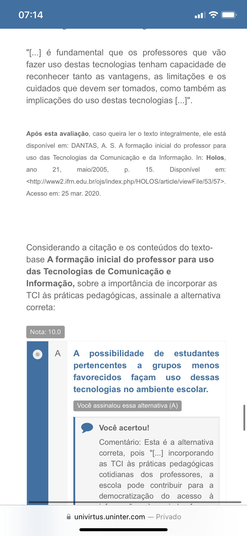 07:14 "[...] é fundamental que os professores que vão fazer uso destas tecnologias tenham capacidade de reconhecer tanto as vantagens, as limitações e os cuidados que devem ser tomados, como também as implicações do uso destas tecnologias [...]". Após esta avaliação, caso queira ler o texto integralmente, ele está disponível em: DANTAS, A. S. A formação inicial do professor para uso das Tecnologias da Comunicação e da Informação. In: Holos, ano 21, maio/2005, p. 15. Disponível em: Acesso em: 25 mar. 2020. Considerando a citação e os conteúdos do texto- base A formação inicial do professor para uso das Tecnologias de Comunicação e Informação, sobre a importância de incorporar as TCI às práticas pedagógicas, assinale a alternativa correta: Nota: 10.0 A A possibilidade de estudantes pertencentes a grupos menos favorecidos façam uso dessas tecnologias no ambiente escolar. Você assinalou essa alternativa (A) Você acertou! Comentário: Esta é a alternativa correta, pois "[...] incorporando as TCI às práticas pedagógicas cotidianas dos professores, a escola pode contribuir para a democratização do acesso à univirtus.uninter.com - Privado
