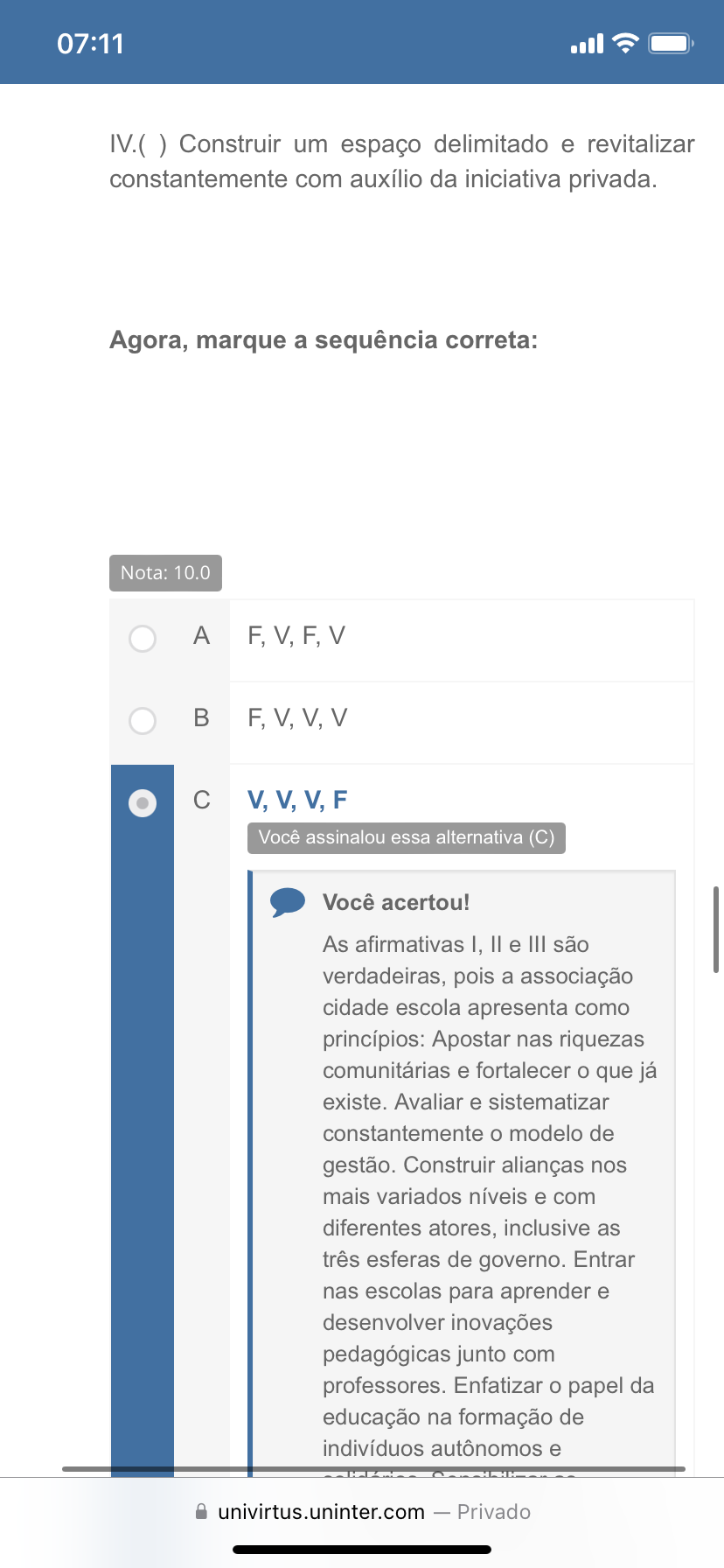 07:11 Construir um espaço delimitado e revitalizar constantemente com auxílio da iniciativa privada. Agora, marque a sequência correta: Nota: 10.0 A F, V B V C V, V, V, F Você assinalou essa alternativa (C) Você acertou! As afirmativas I, e III são verdadeiras, pois a associação cidade escola apresenta como princípios: Apostar nas riquezas comunitárias e fortalecer o que já existe. Avaliar e sistematizar constantemente o modelo de gestão. Construir alianças nos mais variados níveis e com diferentes atores, inclusive as três esferas de governo. Entrar nas escolas para aprender e desenvolver inovações pedagógicas junto com professores. Enfatizar o papel da educação na formação de indivíduos autônomos e univirtus.uninter.com - Privado