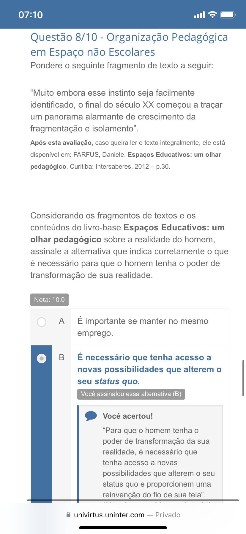 07:10 Questão 8/10 - Organização Pedagógica em Espaço não Escolares Pondere o seguinte fragmento de texto a seguir: "Muito embora esse instinto seja facilmente identificado, o final do século XX começou a traçar um panorama alarmante de crescimento da fragmentação e isolamento". Após esta avaliação, caso queira ler o texto integralmente, ele está disponível em: FARFUS, Daniele. Espaços Educativos: um olhar pedagógico. Curitiba: Intersaberes, 2012 - p.30. Considerando os fragmentos de textos e os conteúdos do livro-base Espaços Educativos: um olhar pedagógico sobre a realidade do homem, assinale a alternativa que indica corretamente o que é necessário para que o homem tenha o poder de transformação de sua realidade. Nota: 10.0 A É importante se manter no mesmo emprego. B É necessário que tenha acesso a novas possibilidades que alterem o seu status quo. Você assinalou essa alternativa (B) Você acertou! "Para que o homem tenha o poder de transformação da sua realidade, é necessário que tenha acesso a novas possibilidades que alterem o seu status quo e proporcionem uma reinvenção do fio de sua univirtus.uninter.com - Privado