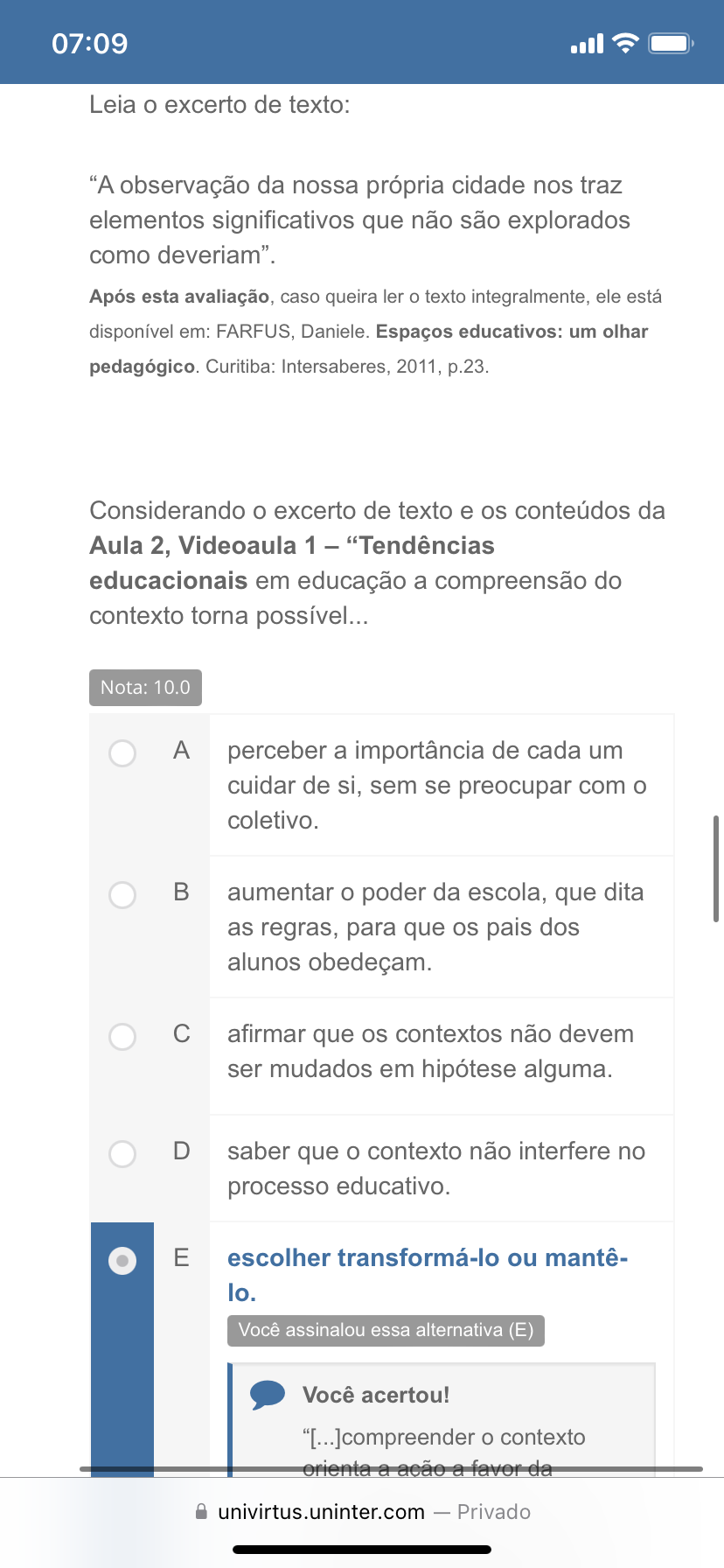 07:09 Leia o excerto de texto: "A observação da nossa própria cidade nos traz elementos significativos que não são explorados como deveriam". Após esta avaliação, caso queira ler o texto integralmente, ele está disponível em: FARFUS, Espaços educativos: um olhar pedagógico. Curitiba: Intersaberes, 2011, p.23. Considerando o excerto de texto e os conteúdos da Aula 2, Videoaula 1 - "Tendências educacionais em educação a compreensão do contexto torna possível... Nota: 10.0 A perceber a importância de cada um cuidar de si, sem se preocupar com o coletivo. B aumentar o poder da escola, que dita as regras, para que os pais dos alunos obedeçam. C afirmar que os contextos não devem ser mudados em hipótese alguma. D saber que o contexto não interfere no processo educativo. E escolher transformá-lo ou mantê- lo. Você assinalou essa alternativa (E) Você acertou! "[.. ..]compreender o contexto orienta a a favor da univirtus.uninter.com - Privado