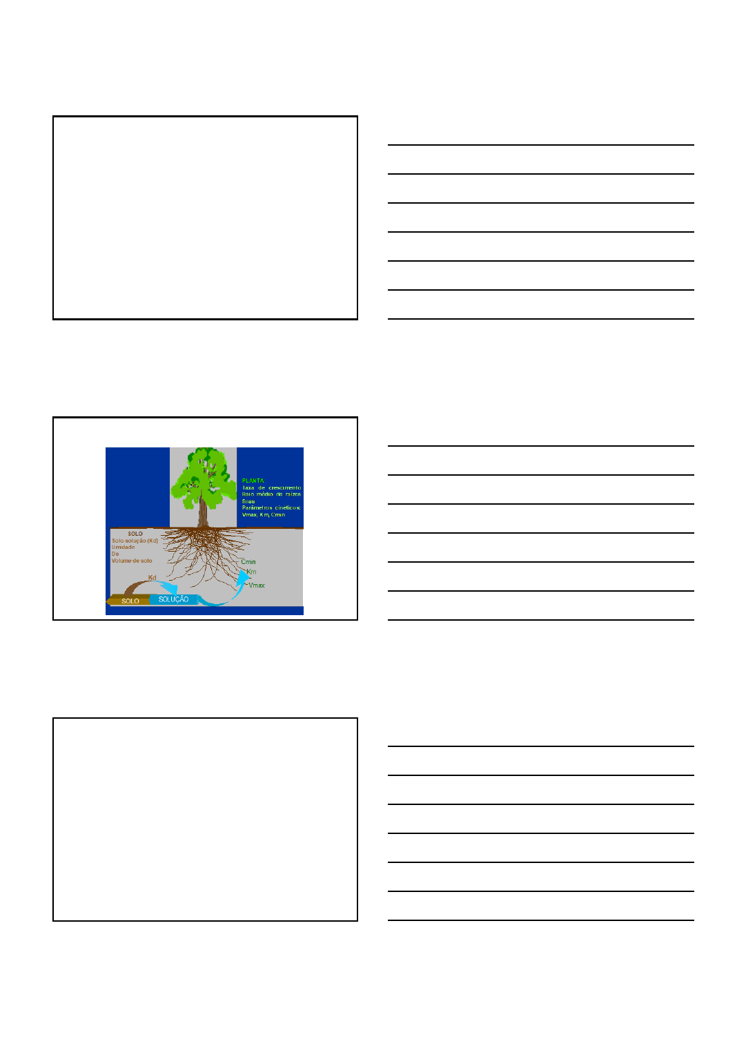 <p>10/04/2018</p><p>1</p><p>Correção da</p><p>Acidez do Solo</p><p>1</p><p>Importante para o funcionamento harmônico das duas</p><p>superfícies de aquisição de recursos</p><p>2</p><p>Condições frequentes em solos ácidos</p><p>. Fitotoxidez por alumínio e manganês;</p><p>. Deficiência em cálcio e em magnésio;</p><p>. Menor atividade microbiana;</p><p>. Menor taxa de decomposição de resíduos e de</p><p>mineralização da MOS e de processos como a</p><p>nitrificação (NH4</p><p>+ -> NO3</p><p>-) ;</p><p>. Menor eficiência das fertilizações.</p><p>3</p><p>10/04/2018</p><p>2</p><p>Crescimento relativo de raízes de plantas de algodão de acordo</p><p>com o Al na solução do solo</p><p>Fonte: Salet (1999)</p><p>pH (H 2O) Al-total Al-tóxico Al (tóxico/total) Raízes *</p><p>% %</p><p>5,1 33 2,9 8,8 96</p><p>4,9 30 13,3 44,3 45</p><p>umol/L</p><p>* em relação ao obtido no solo corrigido p/pH (H 2O) = 6,5</p><p>4</p><p>Correção da acidez</p><p>. Calagem:</p><p>Alta relação benefício/custo, mesmo para</p><p>culturas resistentes/tolerantes ao Al e ao Mn (já</p><p>que também fornece Ca e Mg )</p><p>5</p><p>Relação entre produtividade de grãos</p><p>e saturação por bases</p><p>pH vs V</p><p>6</p><p>10/04/2018</p><p>3</p><p>7</p><p>BALANÇO ECONÔMIC0 DA CALAGEM (3 t/ha)</p><p>(MOCOCA, SÃO SIMÃO e GUAÍRA)</p><p>kg/ha</p><p>360422</p><p>7.677</p><p>150473</p><p>1.746</p><p>120245</p><p>2.609</p><p>(5 anos) (3 anos) (4 anos)</p><p>Fonte: Raij & Quaggio, 1984.</p><p>0</p><p>2000</p><p>4000</p><p>6000</p><p>8000</p><p>Milho Soja Algodão</p><p>360 422</p><p>7.677</p><p>150 473</p><p>1.746</p><p>120 245</p><p>2.609</p><p>Custo do calcário</p><p>em kg/ha do produto</p><p>Aumento de produção:</p><p>No 1º ano</p><p>No período</p><p>Demanda (tecnicamente recomendada): ~ 90 milhões t/ano</p><p>8</p><p>ABRACAL, 2013</p><p>30.641</p><p>0</p><p>5.000</p><p>10.000</p><p>15.000</p><p>20.000</p><p>25.000</p><p>30.000</p><p>35.000</p><p>40.000</p><p>x 1.000 t</p><p>Consumo aparente de calcário no Brasil</p><p>1992 - 2015</p><p>9</p><p>ABRACAL, 2013</p><p>5.952</p><p>0</p><p>1.000</p><p>2.000</p><p>3.000</p><p>4.000</p><p>5.000</p><p>6.000</p><p>7.000</p><p>8.000</p><p>x 1.000 t</p><p>Consumo aparente de calcário em alguns estados ( 1992 - 2015)</p><p>SP</p><p>MG</p><p>MS</p><p>GO</p><p>MT 4.075</p><p>3.348</p><p>2.778</p><p>2.323</p><p>10/04/2018</p><p>4</p><p>Reações do Corretivo no Solo</p><p>CaCO3 + H2O ↔ Ca2+ + HCO3</p><p>- + OH-</p><p>(CO2solo)</p><p>Solo–(H,Al) + Ca2+ + HCO3</p><p>- ↔ Solo-Ca + Al3+ + H2CO3</p><p>H2CO3 ↔ CO2 + H2O</p><p>(deste CO2, pequena parte fica no solo (CO2 solo) e a maior parte é</p><p>volatilizada CO2</p><p>↑)</p><p>Com o aumento concomitante de pH:</p><p>Al3+ + 3H2O ↔ Al(OH)3º + H+</p><p>H+ + OH- (do inicio da dissolução do corretivo) ↔ H2O</p><p>( A importância dos drenos: solo e planta)</p><p>Aplicação de Calcário à Superfície Sem Incorporação em solos Arenosos ?10</p><p>(Calagem e o aquecimento global?)</p><p>Reações do Corretivo no Solo</p><p>H+</p><p>Al3+</p><p>: :H</p><p>+ CaCO3 + H2O</p><p>Ca2+</p><p>Ca2+</p><p>Ca2+</p><p>Ca2+</p><p>Ca2+</p><p>↔ + Al3+</p><p>HCO3</p><p>-</p><p>H3O+</p><p>H3O+</p><p>H3O+</p><p>OH-</p><p>+ H+ H2O + CO2</p><p>+ H+ H2O</p><p>CO3</p><p>2- + Ca2+</p><p>CO3</p><p>2- H2O + CO2+ 2 H+</p><p>+ H2O ↔ Al(OH)3 +</p><p>CO3</p><p>2- + H2O HCO3</p><p>- + OH- pH</p><p>11</p><p>Distribuição de carbonatos de acordo com pH</p><p>independente da pressão de CO2</p><p>CaCO3 + H2O ↔ CO3</p><p>2- + Ca2+</p><p>CO3</p><p>2- + H2O ↔ HCO3</p><p>- + OH-</p><p>CO3</p><p>2- ↔ H2O + CO2+ 2 H+</p><p>HCO3</p><p>- + H+ ↔ H2O + CO2 12</p><p>10/04/2018</p><p>5</p><p>Atividade de espécies iônicas de Al em função do pH</p><p>Fonte: Kinkraid (1991)</p><p>13</p><p>Atividade de espécies iônicas de Al em função do pH</p><p>Fonte: Kinkraid (1991)</p><p>14</p><p>Quantidade de CaCO3 necessária para neutralizar os</p><p>diferentes tipos de acidez</p><p>• pH = 4,8</p><p>• Capac. campo = 300 g kg-1 de H2O</p><p>• Dens. aparente = 1,1 kg dm-3</p><p>Atividade H = 10-4,8</p><p>0,00001585 mol/L ou 15,85 μmol/L de H+.</p><p>10,46 molc /ha</p><p>X 50,0 g/molc</p><p>523 g ha-1 CaCO3</p><p>660.000 L/ha de solução</p><p>Cada mol de H (corresponde a</p><p>1 molc) será neutralizado por</p><p>um molc de CaCO3, que tem a</p><p>massa de 50 g/molc.</p><p>ACIDEZ ATIVA</p><p>15</p><p>10/04/2018</p><p>6</p><p>Quantidade de CaCO3 necessária para neutralizar os</p><p>diferentes tipos de acidez</p><p>• ACIDEZ TROCÁVEL</p><p>Al3+ = 1,2 cmolc dm-3</p><p>• 7,7 t ha-1 CaCO3</p><p>•ACIDEZ POTENCIAL</p><p>H + Al = 7,7 cmolc dm-3</p><p>1,2 t ha-1 CaCO3</p><p>0</p><p>-</p><p>2</p><p>0</p><p>c</p><p>m</p><p>p</p><p>ro</p><p>fu</p><p>n</p><p>d</p><p>id</p><p>a</p><p>d</p><p>e</p><p>ACIDEZ ATIVA • 523 g ha-1 CaCO3</p><p>Acidez ativa não define a necessidade de calagem</p><p>16</p><p>Curvas de neutralização da acidez</p><p>17</p><p>Como determinar a dose de corretivo ?</p><p>- Necessidade de Calagem (NC): referencial para o cálculo da</p><p>dose.</p><p>Por que referencial e não a dose em si ?</p><p>Há 3 premissas na NC</p><p>. Corretivo aplicado em área total (SC=100%)</p><p>. Corretivo incorporado em 0-20 cm (PF=20 cm)</p><p>. Corretivo com PRNT=100%</p><p>-Quantidade de Corretivo a Aplicar (QC)</p><p>18</p><p>QC</p><p>t</p><p>ha</p><p>=NC</p><p>t</p><p>ha</p><p>x</p><p>SC</p><p>100</p><p>x</p><p>PF</p><p>20</p><p>x</p><p>100</p><p>PRNT</p><p>10/04/2018</p><p>7</p><p>Métodos ou Critérios de Laboratório para a</p><p>determinação da NC em uso no Brasil</p><p>- Al3+ e Ca2+ + Mg2+ - MG, várias outras regiões</p><p>(Neutralização de Al3+ e fertilização com Ca2+ e Mg2+)</p><p>- Saturação por bases (V) – SP, várias outras regiões</p><p>(Elevar V do solo para valor adequado à cultura)</p><p>- SMP (RS e SC)</p><p>(Elevar o pH para definido valor (6,0))</p><p>19</p><p>Método do Al3+ e Ca2+ +