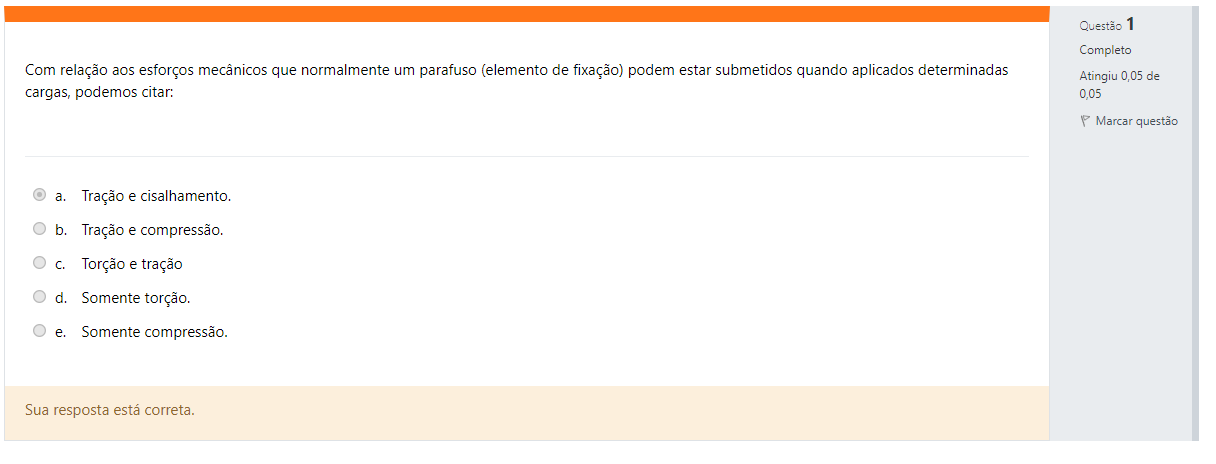 Questão 1 Completo Com relação aos esforços mecânicos que normalmente um parafuso (elemento de fixação) podem estar submetidos quando aplicados determinadas Atingiu 0,05 de cargas, podemos citar: 0,05 Marcar questão a. Tração e cisalhamento. b. Tração e compressão. C. Torção e tração d. Somente torção. e. Somente compressão. Sua resposta está correta.