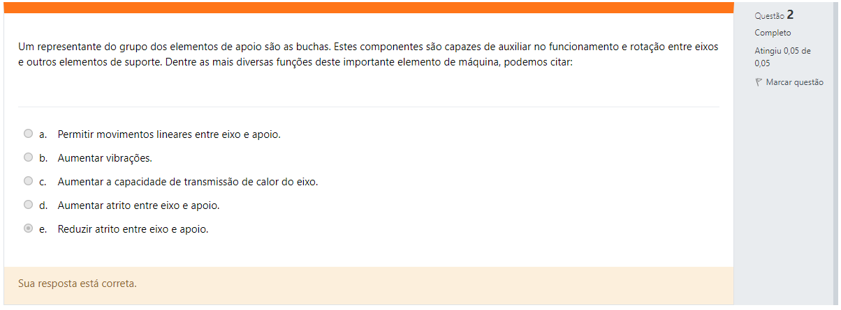 Questão 2 Completo Um representante do grupo dos elementos de apoio são as buchas. Estes componentes são capazes de auxiliar no funcionamento e rotação entre eixos Atingiu 0,05 de e outros elementos de suporte. Dentre as mais diversas funções deste importante elemento de máquina, podemos citar: 0,05 Marcar questão a. Permitir movimentos lineares entre eixo e apoio. b. Aumentar vibrações. C. Aumentar a capacidade de transmissão de calor do eixo. d. Aumentar atrito entre eixo e apoio. e. Reduzir atrito entre eixo e apoio. Sua resposta está correta.