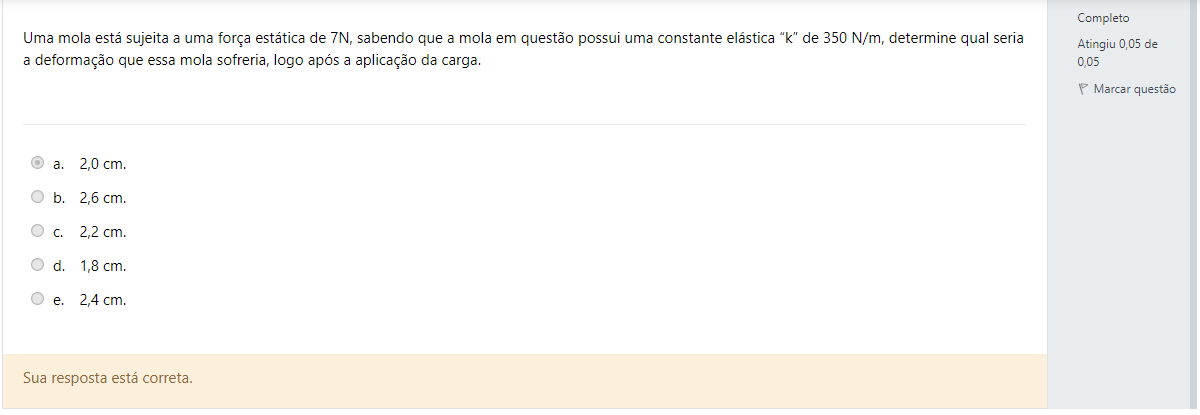 Completo Uma mola está sujeita a uma força estática de 7N, sabendo que a mola em questão possui uma constante elástica "k" de 350 N/m, determine qual seria Atingiu 0,05 de a deformação que essa mola sofreria, logo após a aplicação da carga. 0,05 Marcar ques a. 2,0 cm. b. 2,6 cm. C. 2,2 cm. d. 1,8 cm. e. 2,4 cm. Sua resposta está correta.