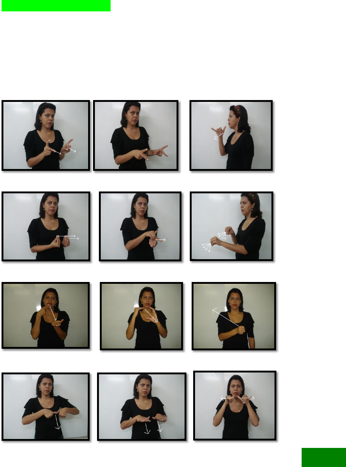 <p>VERBOS DIRECIONAIS</p><p>São verbos que concordam com a pessoa da sentença, também</p><p>incorporam o locativo. A direção do sinal é realizada do sujeito para o</p><p>objeto da sentença. Com isso a direção do movimento sempre irá variar</p><p>de acordo com a posição dos elementos envolvidos na ação.</p><p>ABANDONAR 1 2 AVISAR</p><p>DAR DEMITIR ENSINAR</p><p>ENVIAR (carta) ENVIAR (e-mail) ENVIAR (pessoa)</p><p>FICAR 1 FICAR 2 INFORMAR</p><p>69</p>