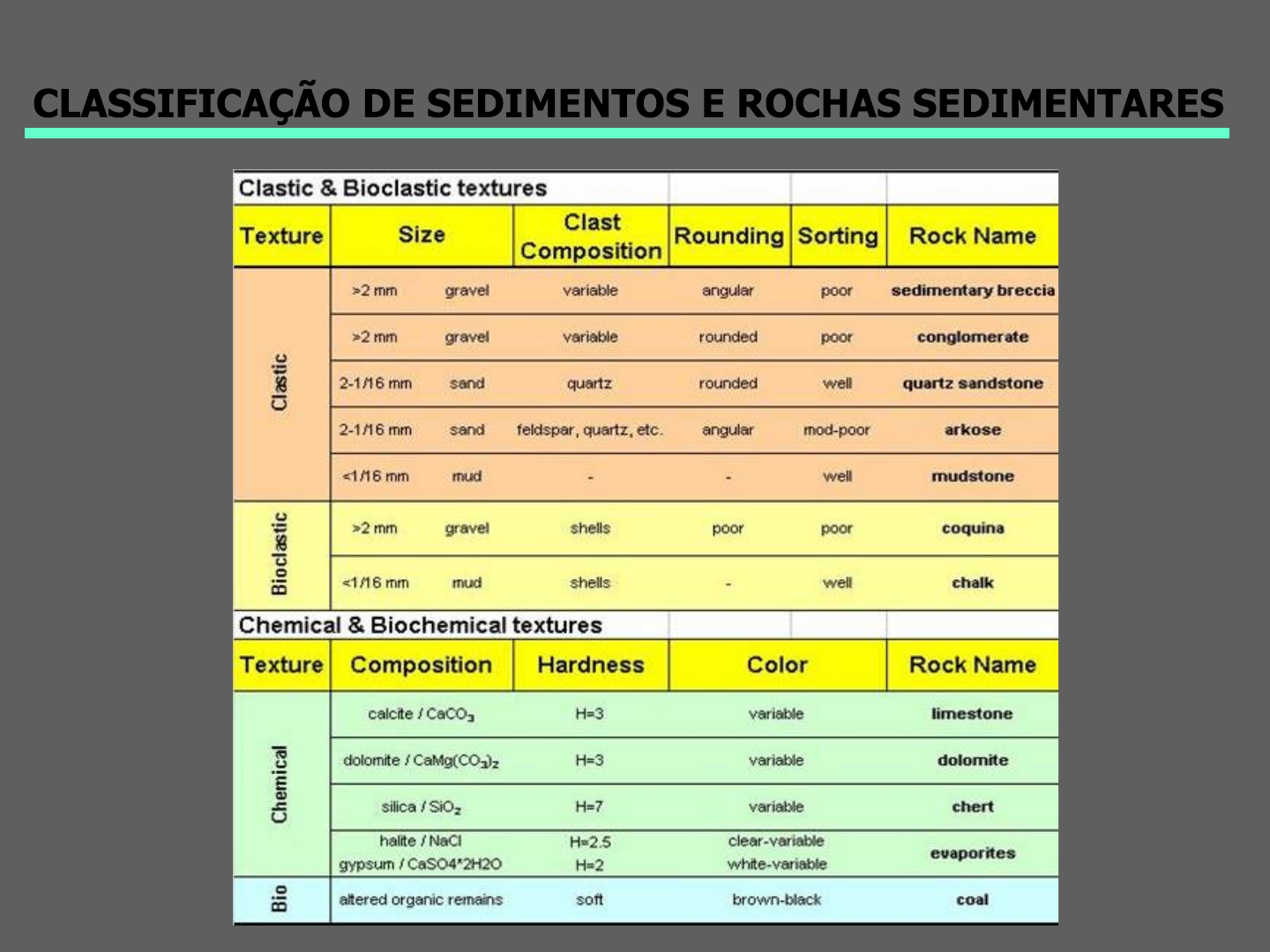 <p>CLASSIFICAÇÃO DE SEDIMENTOS E ROCHAS SEDIMENTARES</p><p>RUDITOS</p><p>▪ quanto à relação matriz/arcabouço</p><p>sustentados pelos clastos</p><p>sustentados pela matriz</p><p>(diamictitos)</p><p>▪ quanto à composição petrográfica</p><p>oligomíticos</p><p>polimíticos</p><p>▪ quanto à angulosidade dos clastos</p><p>conglomerados</p><p>brechas</p><p>(terrígenos)</p><p>CLASSIFICAÇÃO DE SEDIMENTOS E ROCHAS SEDIMENTARES</p><p>ARENITOS</p><p>▪ quanto à composição petrográfica</p><p>▪ quanto à percentagem de matriz</p><p>(Williams, Turner & Gilbert, 1982)</p><p>(terrígenos)</p><p>CLASSIFICAÇÃO DE SEDIMENTOS E ROCHAS SEDIMENTARES</p><p>ARENITOS</p><p>(Folk, 1980)</p><p>(terrígenos)</p><p>CLASSIFICAÇÃO DE SEDIMENTOS E ROCHAS SEDIMENTARES</p><p>LUTITOS</p><p>▪ siltitos</p><p>▪ argilitos</p><p>▪ lamitos</p><p>▪ folhelhosc/ fissilidade</p><p>(terrígenos)</p><p>CLASSIFICAÇÃO DE SEDIMENTOS E ROCHAS SEDIMENTARES</p><p>(Folk, 1980) (terrígenos)</p><p>CLASSIFICAÇÃO DE SEDIMENTOS E ROCHAS SEDIMENTARES</p><p>RUDITOS</p><p>LAMITOS</p><p>FOLHELHOS</p><p>ORTOCONGLOMERADOS</p><p>BRECHAS</p><p>PSAMITOS</p><p>PSEFITOS</p><p>CONGLOMERADOS</p><p>ARENITOS</p><p>VAQUES</p><p>DIAMICTITOS</p><p>LUTITOS</p><p>SILTITOS</p><p>ARCÓSIOS</p><p>ARGILITOS</p><p>PARACONGLOMERADOS</p><p>PELITOS</p><p>(terrígenos)</p><p>CLASSIFICAÇÃO DE SEDIMENTOS E ROCHAS SEDIMENTARES</p><p>RUDITOS</p><p>LAMITOS</p><p>FOLHELHOS</p><p>ORTOCONGLOMERADOS</p><p>BRECHAS</p><p>PSAMITOS</p><p>PSEFITOS</p><p>CONGLOMERADOS</p><p>ARENITOS</p><p>VAQUES</p><p>DIAMICTITOS</p><p>LUTITOS</p><p>SILTITOS</p><p>ARCÓSIOS</p><p>ARGILITOS</p><p>PARACONGLOMERADOS</p><p>PELITOS</p><p>(terrígenos)</p><p>CLASSIFICAÇÃO DE SEDIMENTOS E ROCHAS SEDIMENTARES</p><p>RUDITOS</p><p>LAMITOS</p><p>FOLHELHOS</p><p>ORTOCONGLOMERADOS</p><p>BRECHAS</p><p>PSAMITOS</p><p>PSEFITOS</p><p>CONGLOMERADOS</p><p>ARENITOS</p><p>VAQUES</p><p>DIAMICTITOS</p><p>LUTITOS</p><p>SILTITOS</p><p>ARCÓSIOS ARGILITOS</p><p>PARACONGLOMERADOS</p><p>PELITOS</p><p>(terrígenos)</p><p>CLASSIFICAÇÃO DE SEDIMENTOS E ROCHAS SEDIMENTARES</p>