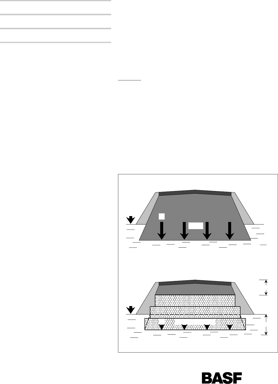 <p>1 General</p><p>The main consideration when con-</p><p>structing roads on poor load-bear-</p><p>ing subsoil is that every load deforms</p><p>the soft soil layers; and the greater</p><p>the load, the greater the deforma-</p><p>tion. This deformation process con-</p><p>tinues over years, depending on the</p><p>thickness of the soil layers. The low</p><p>shear resistance of poor loadbear-</p><p>ing subsoils means that concen-</p><p>trated loads should be avoided as</p><p>far as possible, otherwise these</p><p>layers will give at the sides. Com-</p><p>pensating for this form of subsi-</p><p>dence by laying new material leads</p><p>to further settlement due to the</p><p>additional burden.</p><p>The conventional techniques of sub-</p><p>soil improvement by complete or</p><p>partial replacement of the soil are</p><p>often time consuming and therefore</p><p>costly. By employing lightweight</p><p>materials, the weight of the road</p><p>embankment – and with it the load</p><p>on the subsoil – is reduced consid-</p><p>erably.</p><p>A largely subsidence-free method of</p><p>construction is thus obtained when</p><p>practically no additional loads are</p><p>brought to bear – ie, by using</p><p>extremely lightweight materials in</p><p>the embankment such as blocks of</p><p>Styropor foam (see figs. 1 and 2).</p><p>Technical Information</p><p>24558 June 1991/September 1993</p><p>StyroporT</p><p>800</p><p>Highway construction/</p><p>Ground insulation</p><p>Foams</p><p>Styropor foam as a lightweight construction material</p><p>for road base-courses</p><p>® = Registered trademark</p><p>σ0</p><p>σ1</p><p>σ > σ1 0</p><p>Conventional embankment structure</p><p>increased surface pressure</p><p>σ0</p><p>EPS embankment structure</p><p>non increased surface pressure</p><p>σ1 ~G = G = σ = σ2</p><p>~</p><p>1 1 0</p><p>~</p><p>G1</p><p>G2</p><p>Fig. 1 Comparison of conventional and EPS embankment structures.</p><p>2</p><p>2 Experience to date</p><p>Experience with Styropor (EPS)</p><p>foam boards used as frost protec-</p><p>tion for roads and railways formed</p><p>the basis for the development of</p><p>this construction technique. This</p><p>method of construction has been</p><p>applied since the middle of the</p><p>1960s, mainly in countries with</p><p>severe winters (eg, alpine regions,</p><p>Canada and the Scandinavian coun-</p><p>tries) where the deeply penetrating</p><p>ground frosts make it necessary to</p><p>provide costly frostproof subbases</p><p>for roads and railways (see figs. 3</p><p>and 4). With the appearance in 1984</p><p>of a booklet “Road surfacing with</p><p>thermal insulation layers made from</p><p>foam plastics” by the German Insti-</p><p>tute for Road & Transport Research</p><p>(Soil Mechanics Working Group),</p><p>“antifrost construction methods”</p><p>can now be ranked alongside other</p><p>conventional construction tech-</p><p>niques.</p><p>AAAAAAAAAAAA</p><p>AAAAAAAAAAAA</p><p>AAAAAAAAAAAA</p><p>AAAAAAAAAAAA</p><p>AAAAAAAA</p><p>AAAAAAAA</p><p>AAAAAAAA</p><p>AAAAAAAA</p><p>AAAAAAAA</p><p>σv</p><p>σH</p><p>σv</p><p>σH</p><p>With the EPS method no horizontal forces act on the bridge abutment</p><p>and supporting walls (lighter design)</p><p>Fig. 2</p><p>Fig. 3 and 4 Frost protection in road and railway construction using EPS rigid foam boards.</p><p>The use of rigid EPS foam, not only</p><p>for protective antifrost layers in the</p><p>form of insulating boards, but as a</p><p>load-carrying substructure for roads</p><p>and bridge abutments in the form of</p><p>large blocks, is based on this practi-</p><p>cal experience and on the fact that</p><p>lightweight (ca. 20 kg/m3) Styropor</p><p>foam possesses high bending and</p><p>shear strength for distributing both</p><p>dead weight and live loads; and so</p><p>offers higher efficiency than conven-</p><p>tional building materials (fig. 5).</p><p>2.1 Economy</p><p>The price of rigid EPS is much lower</p><p>than that of other foam materials,</p><p>but compared with conventional</p><p>materials used in road substruc-</p><p>tures, it is considerably more expen-</p><p>sive. However, a simple cost com-</p><p>parison is not enough – the alterna-</p><p>tive construction methods must be</p><p>also considered. Dependent upon</p><p>the local conditions, constructing</p><p>with Styropor offers a definite tech-</p><p>nical and economically interesting</p><p>solution – mostly for existing struc-</p><p>tures (eg, bridges, supporting walls,</p><p>pipe ducts) where subsidence is to</p><p>be avoided. Experience from abroad</p><p>has shown that in certain cases a</p><p>cost reduction of 50% can be</p><p>achieved over conventional building</p><p>techniques. Styropor also offers</p><p>obvious advantages if, for instance,</p><p>material has to be transported to</p><p>the construction site over long dis-</p><p>tances or special conditions have to</p><p>be met on environmental grounds.</p><p>3 Styropor – rigid EPS</p><p>EPS is the standard abbreviation for</p><p>Expanded Polystyrene. The stan-</p><p>dard used for rigid EPS foam as an</p><p>insulating material in the building</p><p>and construction industry is DIN</p><p>18164, part 1. Styropor EPS foam</p><p>has been produced worldwide for</p><p>over 40 years, and is mainly used in</p><p>the construction and packaging</p><p>industries.</p><p>3</p><p>Starting with the Styropor granulate,</p><p>which contains a blowing agent, the</p><p>manufacture of EPS foam takes</p><p>place in three stages: Pre-expand-</p><p>ing, intermediate storage and</p><p>moulding (fig 6). During the first</p><p>stage the granulate is heated and</p><p>made to expand – rather like pop-</p><p>corn when it is made (fig. 7). The</p><p>blowing agent used is pentane, a</p><p>naturally occurring hydrocarbon.</p><p>The pentane expands the Styropor</p><p>granules into individual foam parti-</p><p>cles five times their original volume.</p><p>Next, the pre-expanded material is</p><p>stored to allow air to diffuse into it</p>