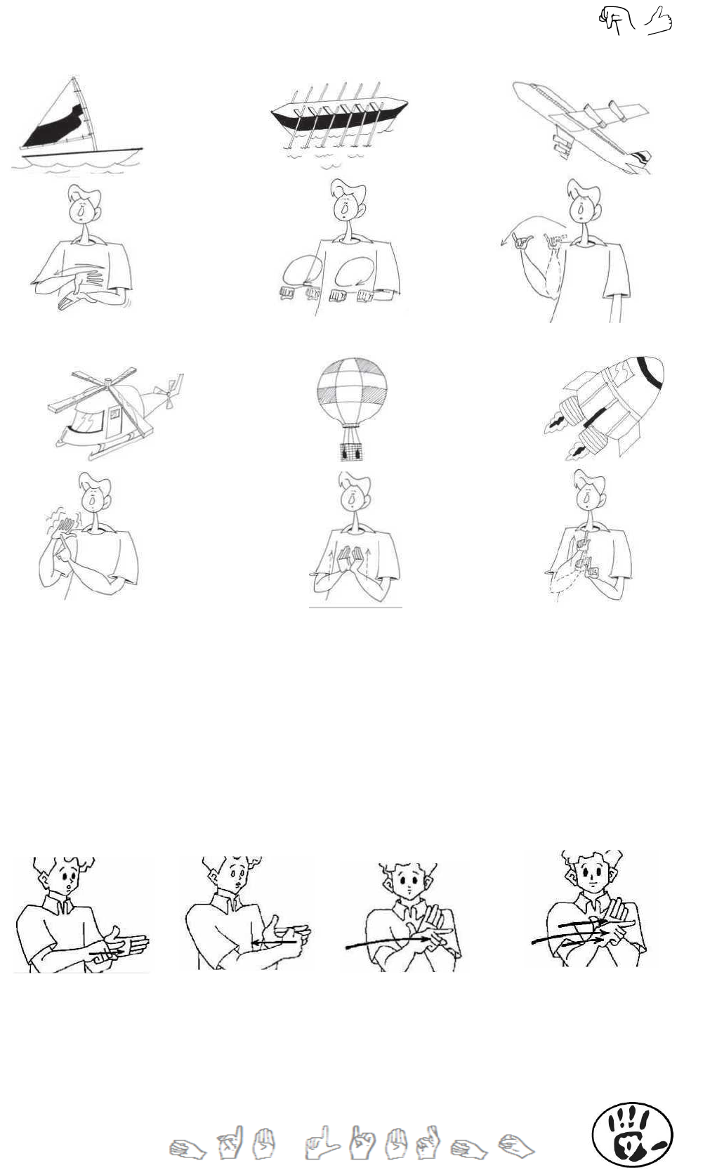 <p>BARCO-À-VELA BARCO-A-REMO/REMAR AVIÃO/AVIÃO-MOVER</p><p>HELICÓPTERO FOGUETE/FOGUE-LANÇAR BALÃO/BALÃO-VOAR</p><p>/HELICÓPTERO-MOVER</p><p>Os verbos do segundo grupo podem também ser subdivididos em:</p><p>1. Verbos que possuem concordância numero-pessoal: a orientação marca as pessoas do</p><p>discurso. O ponto inicial concorda com o sujeito e o final com o objeto. Com já se pode</p><p>conhecer as pessoas do discurso a partir da orientação, geralmente não se utiliza os</p><p>pronomes pessoais com esse tipo de verbo.</p><p>Exemplos</p><p>1SPERGUNTAR2S 2SPERGUNTAR1S 3sPERGUNTAR3s 3sPERGUNTAR3p</p><p>Eu pergunto a você Você me pergunta Ele pergunta a ele Ele pergunta a eles</p><p>2. Verbos classificadores: a configuração de mão é uma marca de concordância de</p><p>gênero: PESSOA, ANIMAL, COISA, VEÍCULO. Verbos que possuem concordância de</p>