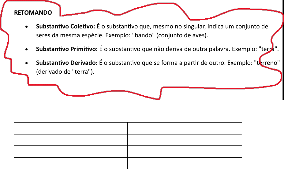 <p>SUBTANTIVOS</p><p>RETOMANDO</p><p>· Substantivo Coletivo: É o substantivo que, mesmo no singular, indica um conjunto de seres da mesma espécie. Exemplo: "bando" (conjunto de aves).</p><p>· Substantivo Primitivo: É o substantivo que não deriva de outra palavra. Exemplo: "terra".</p><p>· Substantivo Derivado: É o substantivo que se forma a partir de outro. Exemplo: "terreno" (derivado de "terra").</p><p>Atividade:</p><p>1. Identifique o substantivo coletivo das palavras abaixo:</p><p>Peixes:</p><p>Letras:</p><p>Lobos:</p><p>Índios:</p><p>Fotos:</p><p>Elefantes:</p><p>Abelhas:</p><p>Alunos:</p><p>2. Escreva cinco substantivos primitivos e seus derivados:</p><p>_________________________________________________________________________________________________________________________________________________________________________________________________________________________________________________________________________________________________________________________________________________________________________________________________</p><p>3. Escreva uma frase com um substantivo coletivo e outra com um substantivo derivado.</p><p>__________________________________________________________________________________________________________________________________________________________</p><p>4. Complete as frases com um substantivo coletivo adequado:</p><p>A ________ de lobos foi visto na floresta.</p><p>O pescador observou o ________ de peixes no rio.</p><p>O ________ de alunos participou da excursão.</p><p>A abelha voltou para a ________.</p><p>Flexão de Gênero (Masculino e Feminino)</p><p>Definição: Flexão de gênero indica se o substantivo é masculino ou feminino. Exemplo: "gato" (masculino), "gata" (feminino).</p><p>1. Complete as frases com o gênero correto das palavras entre parênteses:</p><p>2.</p><p>a) A _______ (rei) fez um discurso importante.</p><p>b) O _______ (atriz) foi premiado por sua atuação.</p><p>c) O _______ (leoa) caça para alimentar seus filhotes.</p><p>d) A _______ (príncipe) assumiu o trono após o rei.</p><p>e) O _______ (vaca) pastava no campo.</p><p>f) A _______ (cavalo) correu rapidamente pelo prado.</p><p>g) O _______ (bailarina) apresentou um espetáculo maravilhoso.</p><p>h) A _______ (herói) salvou a cidade.</p><p>Flexão de Número (Singular e Plural)</p><p>Definição: Flexão de número indica se o substantivo está no singular (um só) ou no plural (mais de um). Exemplo: "cão" (singular), "cães" (plural).</p><p>Atividades de Pluralização</p><p>1. Transforme as palavras abaixo para o plural:</p><p>- Gato: ________</p><p>- Flor: ________</p><p>- Coração: ________</p><p>- Mãe: ________</p><p>- Pássaro: ________</p><p>- Cidade: ________</p><p>- Irmão: ________</p><p>- Anel: ________</p><p>2. Transforme as frases abaixo para o plural:</p><p>O gato está dormindo no sofá. _________________________________________________</p><p>A flor é colorida. _________________________________________________</p><p>O coração bate forte. _________________________________________________</p><p>A mãe cuida do filho. _________________________________________________</p><p>image1.jpeg</p><p>image4.png</p><p>image2.png</p><p>image3.png</p>