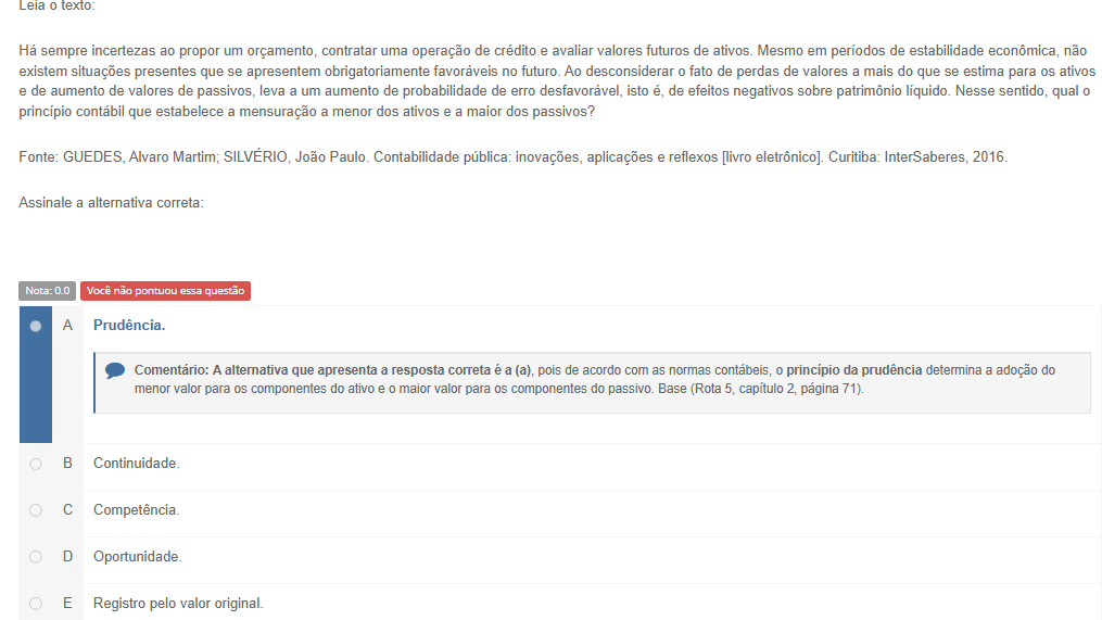 Leia texto: Há sempre incertezas ao propor um orçamento, contratar uma operação de crédito e avaliar valores futuros de ativos. Mesmo em de estabilidade econômica, não existem situações presentes que se apresentem obrigatoriamente favoráveis no futuro. Ao desconsiderar 0 fato de perdas de valores a mais do que se estima para os ativos e de aumento de valores de passivos, leva a um aumento de probabilidade de erro desfavorável, isto é, de efeitos negativos sobre patrimônio líquido. Nesse sentido, qual princípio que estabelece a mensuração a menor dos ativos e a maior dos passivos? Fonte: Alvaro Martim; João Contabilidade pública: inovações, aplicações e reflexos [livro eletrônico]. Curitiba: InterSaberes, 2016. Assinale a alternativa correta: Nota: 0.0 Você não pontuou essa questão A Prudência. Comentário: A alternativa que apresenta a resposta correta é a (a), pois de acordo com as normas 0 da prudência determina a adoção do menor valor para os componentes do ativo e 0 maior valor para os componentes do passivo. Base (Rota 5, capítulo 2, página 71). B C D E Registro pelo valor