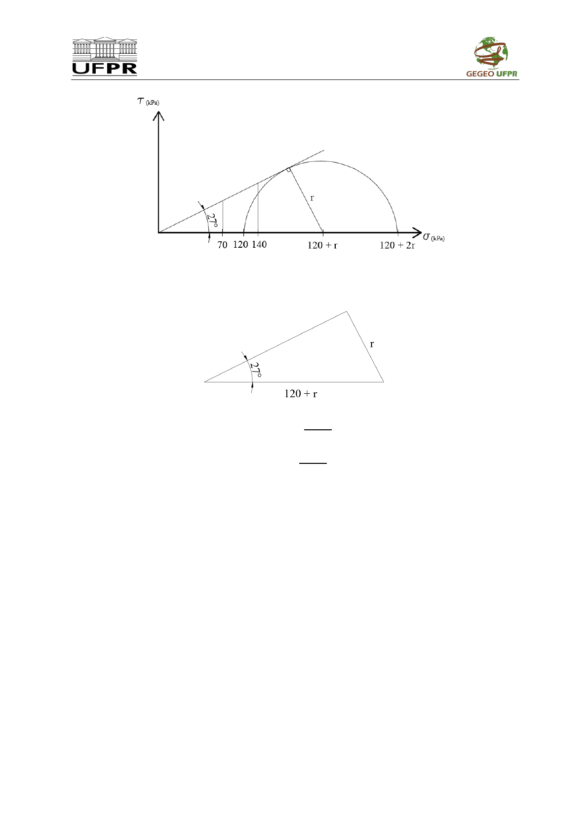 <p>Por trigonometria, determina-se o raio r:</p><p>sin 27° = 𝑟</p><p>120+𝑟</p><p>0, 45 ≈ 𝑟</p><p>120+𝑟</p><p>𝑟 = (120 + 𝑟) · 0, 45 ≈ 54 + 0, 45 𝑟</p><p>𝑟 − 0, 45 𝑟 ≈ 54</p><p>𝑟 ≈ 98</p><p>A tensão desviadora σd é o diâmetro do círculo de Mohr (igual à diferença entre as tensões</p><p>principais maior e menor ), sendo portanto igual a 2 r:σ</p><p>1</p><p>σ</p><p>3</p><p>σ</p><p>𝑑</p><p>= 2 𝑟 = 2 · 98</p><p>σ</p><p>𝑑</p><p>≈ 196 𝑘𝑃𝑎</p><p>97</p><p>Rev. 00 Out/2021</p>
