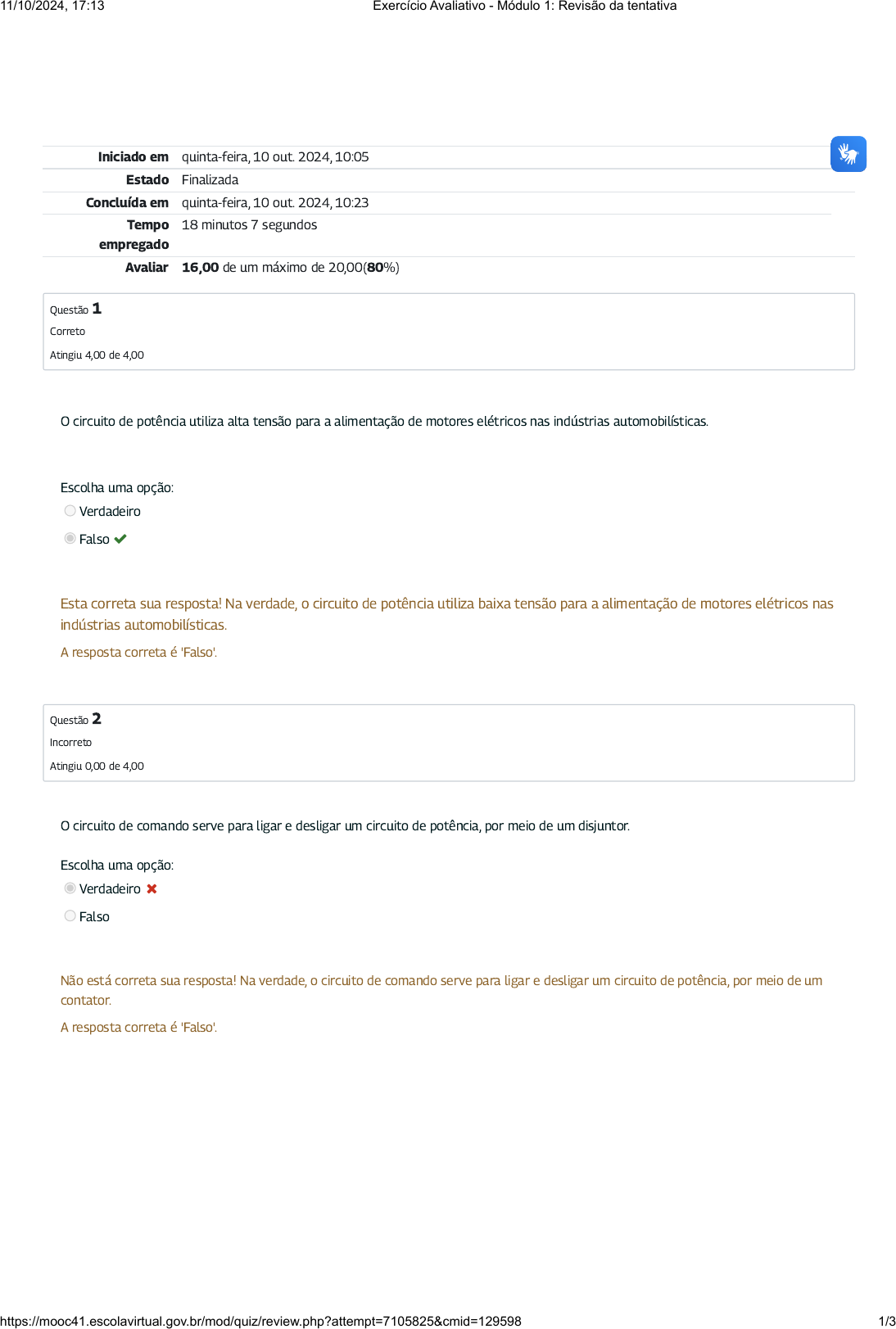 <p>Iniciado em quinta-feira, 10 out. 2024, 10:05</p><p>Estado Finalizada</p><p>Concluída em quinta-feira, 10 out. 2024, 10:23</p><p>Tempo</p><p>empregado</p><p>18 minutos 7 segundos</p><p>Avaliar 16,00 de um máximo de 20,00(80%)</p><p>Questão 1</p><p>Correto</p><p>Atingiu 4,00 de 4,00</p><p>Questão 2</p><p>Incorreto</p><p>Atingiu 0,00 de 4,00</p><p>O circuito de potência utiliza alta tensão para a alimentação de motores elétricos nas indústrias automobilísticas.</p><p>Escolha uma opção:</p><p>Verdadeiro</p><p>Falso </p><p>Esta correta sua resposta! Na verdade, o circuito de potência utiliza baixa tensão para a alimentação de motores elétricos nas</p><p>indústrias automobilísticas.</p><p>A resposta correta é 'Falso'.</p><p>O circuito de comando serve para ligar e desligar um circuito de potência, por meio de um disjuntor.</p><p>Escolha uma opção:</p><p>Verdadeiro </p><p>Falso</p><p>Não está correta sua resposta! Na verdade, o circuito de comando serve para ligar e desligar um circuito de potência, por meio de um</p><p>contator.</p><p>A resposta correta é 'Falso'.</p><p>11/10/2024, 17:13 Exercício Avaliativo - Módulo 1: Revisão da tentativa</p><p>https://mooc41.escolavirtual.gov.br/mod/quiz/review.php?attempt=7105825&cmid=129598 1/3</p><p>Questão 3</p><p>Correto</p><p>Atingiu 4,00 de 4,00</p><p>Questão 4</p><p>Correto</p><p>Atingiu 4,00 de 4,00</p><p>Questão 5</p><p>Correto</p><p>Atingiu 4,00 de 4,00</p><p>Podemos denominar de L1 a Fase 1, L2 a Fase 2, L3 a Fase 3, N o Neutro e PE o Terra.</p><p>Escolha uma opção:</p><p>Verdadeiro </p><p>Falso</p><p>Está correta sua resposta!.</p><p>A resposta correta é 'Verdadeiro'.</p><p>A função de um fusível é a de proteção de um circuito elétrico contra sobrecarga da corrente elétrica, curto-circuito evitando possíveis</p><p>danos ao sistema elétrico, tais como a queima do circuito e explosões.</p><p>Escolha uma opção:</p><p>Verdadeiro </p><p>Falso</p><p>Está correta sua resposta!</p><p>A resposta correta é 'Verdadeiro'.</p><p>Os contatores são equipamentos desenvolvidos para a manobra de circuitos de potência, já os contatores auxiliares tem como função</p><p>manobrar circuitos de comando.</p><p>Escolha uma opção:</p><p>Verdadeiro </p><p>Falso</p><p>Está correta sua resposta!</p><p>A resposta correta é 'Verdadeiro'.</p><p>11/10/2024, 17:13 Exercício Avaliativo - Módulo 1: Revisão da tentativa</p><p>https://mooc41.escolavirtual.gov.br/mod/quiz/review.php?attempt=7105825&cmid=129598 2/3</p><p>11/10/2024, 17:13 Exercício Avaliativo - Módulo 1: Revisão da tentativa</p><p>https://mooc41.escolavirtual.gov.br/mod/quiz/review.php?attempt=7105825&cmid=129598 3/3</p>