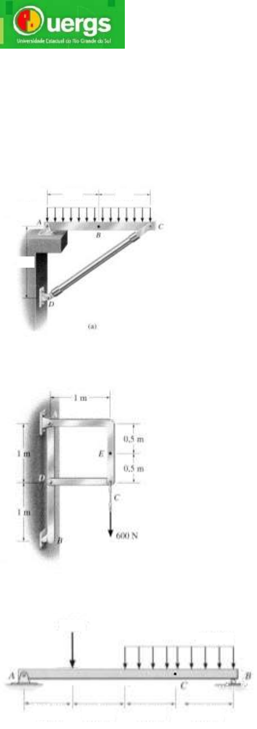 <p>UNIVERSIDADE ESTADUAL DO RIO GRANDE DO SUL</p><p>CURSO: ENGENHARIA DE CONTROLE E AUTOMAÇÃO</p><p>DISCIPLINA: MECÂNICA DOS SÓLIDOS</p><p>PROF. EMERSON FERNANDES DA CUNHA</p><p>Lista de Exercícios – 5 A</p><p>ALUNO: ______________________________________________ DATA: _________________</p><p>Continuação dos exercícios sobre estática: forças internas.</p><p>29 – Determine a força normal, o esforço cortante e o momento fletor que atuam no ponto B da estrutura</p><p>de dois membros mostrada abaixo.</p><p>30 – Determine a força normal, o esforço cortante e o momento fletor que atuam no ponto E da estrutura</p><p>carregada conforme mostra a figura abaixo.</p><p>31 – Determine a força normal, o esforço cortante e o momento no ponto C.</p><p>6 m</p><p>4 m 4 m</p><p>50 kN/m</p><p>12 kN</p><p>9 kN/m</p><p>1,5 m 1,5 m 1,5 m 1,5 m</p><p>2</p><p>32 – Determine a força normal, o esforço cortante e o momento no ponto C. Suponha que A esteja fixado</p><p>e B seja um rolete.</p><p>RESPOSTAS</p><p>29) NB = 267 kN; VB = 0; MB = 400 kN.m</p><p>30) NE = 600 N; VE = 600 N; ME = 300 N.m</p><p>31) NC = 0; VC = -9,75 kN; MC = 24,75 kN.m</p><p>32) NC = 0; VC = - 1,50 kN; MC = 22,5 kN.m</p><p>6 kN/m</p><p>3 m 3 m</p>