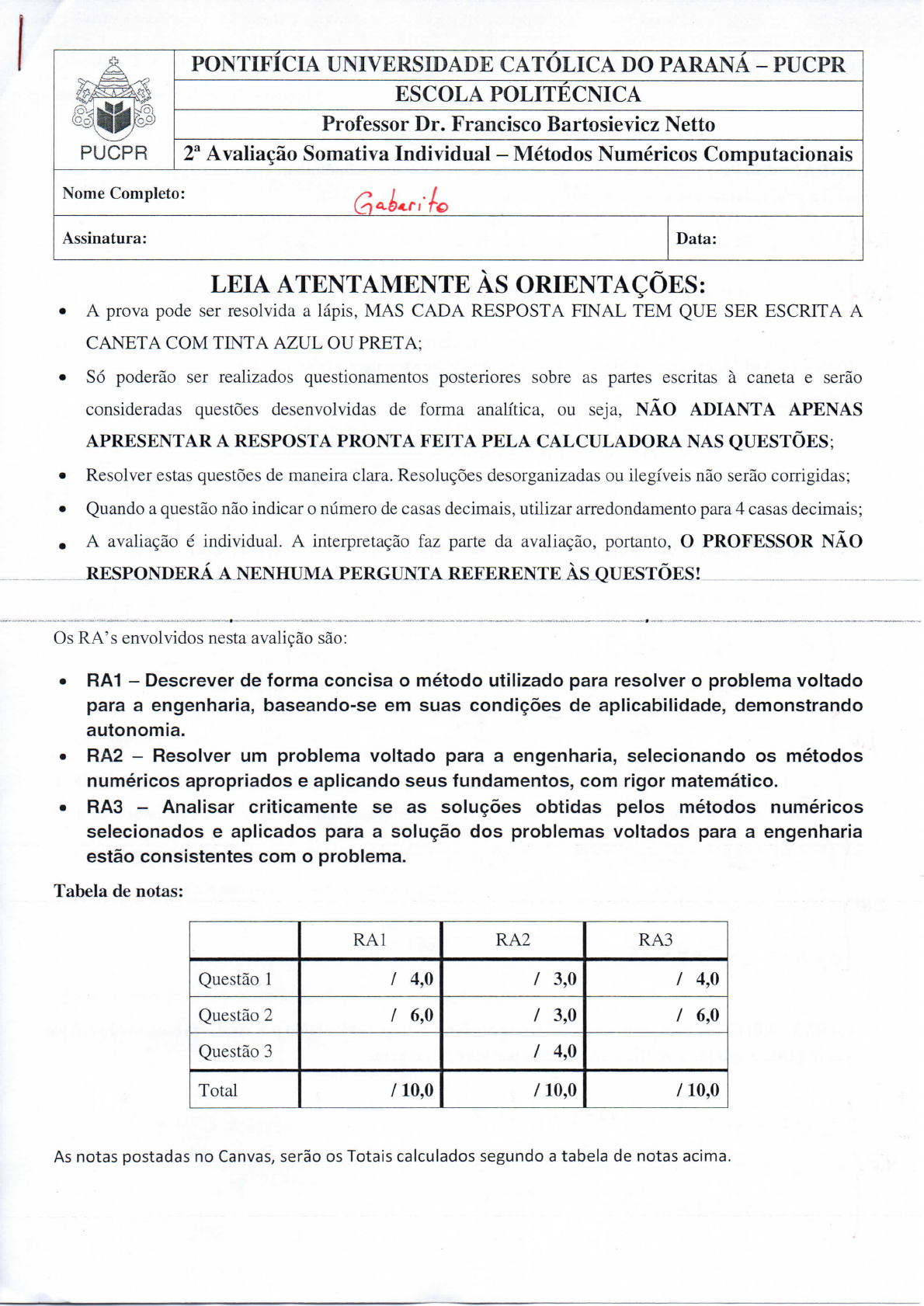 <p>g!eefi#o#%r7ZAlF3•```PUCPB</p><p>PONTIFicIA UNIVERSIDADE CATOLICA D0 PARANA -PUCPR</p><p>ESCOLA POLITECNICA</p><p>Professor Dr. Francisco Bartosievicz Netto</p><p>2a Avaliaeao Somativa Individual - M6todos Num6ricos Computacionais</p><p>None compheto.. Gci cLb.r I. fo</p><p>Assinatura: Data:</p><p>LEIA ATENTAMENTE AS ORIENTA€OES:</p><p>• A prova pode ser resolvida a lapis, MAS CADA RESPOSTA FINAL TEM QUE SER ESCRITA A</p><p>CANETA COM TINTA AZUL OU PRETA;</p><p>• S6 poderao ser realizados questionamentos posteriores sobre as partes escritas a caneta e serao</p><p>consideradas quest6es desenvolvidas de forma analftica, ou seja, NAO ADIANTA APENAS</p><p>APRESENTAR A RESPOSTA PRONTA FEITA PHLA CALCULADORA NAS QUEST6ES;</p><p>• Resolver estas quest6es de maneira clara. Resolug6es desorganizadas ou ilegfveis nao serao corrigidas;</p><p>• Quando a questao nao indicar o ntimero de casas decimais, utilizar arredondamento para 4 casas decimais;</p><p>. A avaliaeao 6 individual. A interpreta?ao faz parte da avaliapao, portanto, 0 PROFESSOR NAO</p><p>RESPONDERA A NHNHUMA PERGUNTA REFERENTE AS QUEST6ES!</p><p>Os RA's envolvidos nesta avaligao sao:</p><p>• F}Al -Descrever de forma concisa o m6todo utilizado para resolver o problema voltado</p><p>para a engenharia, baseando-se em suas condie6es de aplicabilidade, demonstrando</p><p>autonomia.</p><p>• RA2 - F3esolver urn problema voltado para a engenharia, selecionando os m6todos</p><p>num6ricos apropriados e aplicando seus fundamentos, com rigor matematico.</p><p>• F3A3 - Analisar criticamente se as solue6es obtidas pelos m6todos num6ricos</p><p>selecionados e aplicados para a solueao dos prob]emas voltados para a engenharia</p><p>estao consistentes com o problema.</p><p>Tabela de notas:</p><p>RA1 RA2 RA3</p><p>Questao 1 /4,0 I 3,fJ /4,0</p><p>Questao 2 I 6,fJ I 3,fJ I 6,fJ</p><p>Questao 3 /4'0</p><p>Total / 10,0 / 10,0 / 10,0</p><p>As notas postadas no Canvas, serao os Totais calculados segundo a tabela de notas acima.</p><p>Questao 1 -Seja a tabela de dados a seguir:</p><p>a) (RA1 -4,0) Para a tabela de dados acima, 6 possivel obter urn polin6mio inteapolador P7t(x) e, se possivel,</p><p>qual o grau maximo que este polin6mio pode ter? Justifique sua resposta.</p><p>Z`°(f,,„ , f, i¢Ofs,/\/Of , ifze„ lfiff#eft as #, £ err4== A</p><p>Lo{r7ra" iz`dr'j4~#;.£ztfo `2 , ifo„ ~L8L{`ftS £ #zanz,ctLpj ' `,+®, `,I A,= ,</p><p>b) (RA2 - 3,0) Determine o polin6mio interpolador de Newton para a tabela acima.</p><p>Diferengas divididas:</p><p>f [Xo, Xi ,..., Xn] =</p><p>/[Xi, X2 ,..., X7t] -f [Xo, Xi ,... ; Xk-i]</p><p>X7t - Xo</p><p>Polin6mio Interpolador de Newton:</p><p>P7t(X) = f [Xo] + (X -Xo)f[Xo, Xi] + ... + (X -Xo)(X -Xi) ... (X -Xn_1)f[Xo, Xi ,..., X7i]</p><p>yrl, -1[,I ,!f.,,`7</p><p>-I,---Jo</p><p>),a</p><p>Z.,O</p><p>` -..- S-(`-,S`; = q</p><p>o --S ` 3=i{i;i--</p><p>I 8 yi-i=i=T></p><p>fz /x7= -J® i /.*-/-/}7 i 4 ,/`*-,,4trf)jrgr-,,?:.; , i</p><p>F;-z {K3 -- tl|ff . 0, CJ,:!€-`-'-.T-</p><p>l/givte'^ > O ioozgrR ctfsf 4{ de,}@e} dpc i:i rf e`if; {: €:i i i F',.Qg;~'d'if e{-`.</p><p>-W1>-Zisq®6. / ~ - LA</p><p>y" Q`5`^.±,,`...._____`=_`.`_.T.`^£..\+`_@i,.`93T.?E.3.1.=</p>