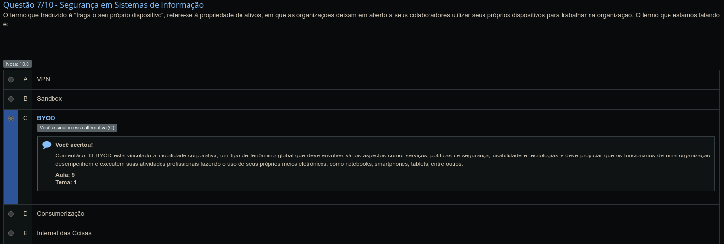 Questão 7/10 - Segurança em Sistemas de Informação O termo que traduzido é "traga seu próprio dispositivo", refere-se à propriedade de em que as organizações deixam em aberto a seus colaboradores utilizar seus próprios dispositivos para trabalhar na organização. O termo que estamos falando é: Nota: 10.0 A VPN Sandbox C BYOD Você assinalou essa alternativa (C) Você acertou! Comentário: O BYOD está vinculado à mobilidade corporativa, um tipo de global que deve envolver vários aspectos como: serviços, políticas de segurança, usabilidade e tecnologias e deve propiciar que os funcionários de uma organização desempenhem e executem suas atividades profissionais fazendo uso de seus próprios meios como smartphones, tablets, entre outros. Aula: 5 Tema: 1 Consumerização E Internet das Coisas