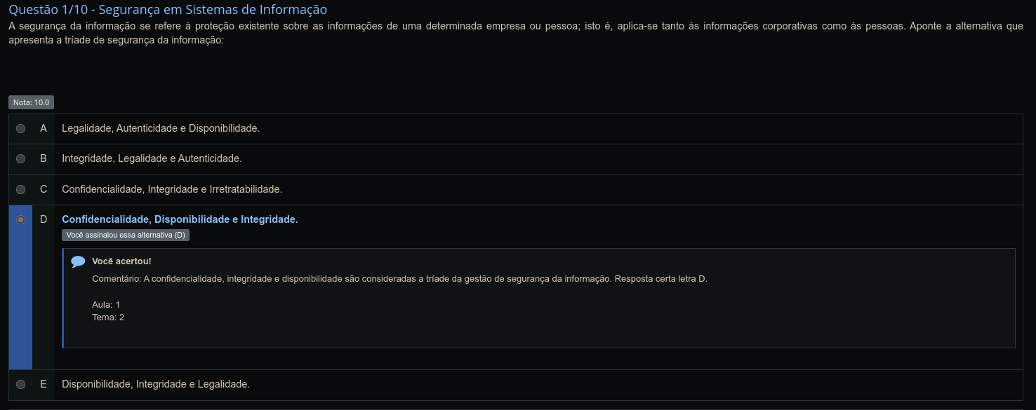 Questão 1/10 - Segurança em Sistemas de Informação A segurança da informação se refere à proteção existente sobre as informações de uma determinada empresa ou pessoa; isto é, aplica-se tanto às informações corporativas como às pessoas. Aponte a alternativa que apresenta a tríade de segurança da informação: Nota: 10.0 A Legalidade, Autenticidade e Disponibilidade. Integridade, Legalidade e Confidencialidade, Integridade e Irretratabilidade. Confidencialidade, Disponibilidade e Integridade. Você assinalou essa alternativa (D) Você acertou! Comentário: A confidencialidade, integridade e disponibilidade são consideradas a triade da gestão de segurança da informação. Resposta certa letra D. Aula: 1 Tema: 2 E Disponibilidade, Integridade e Legalidade.