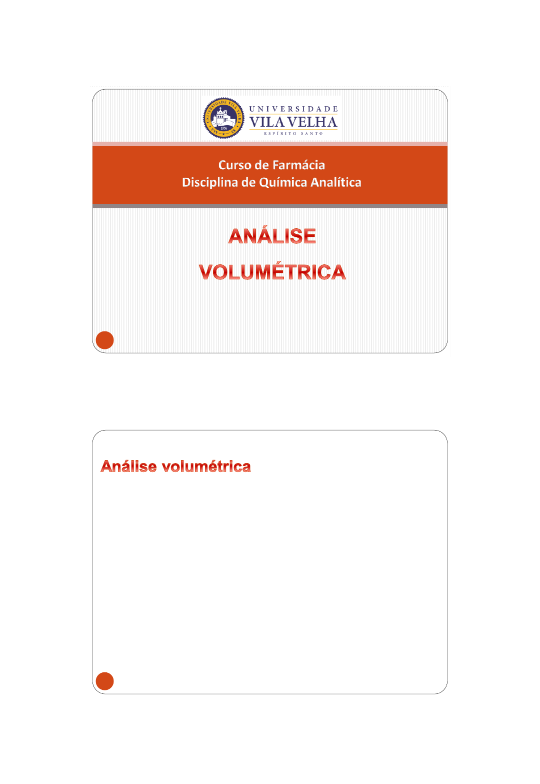 <p>01/10/2024</p><p>1</p><p>ANÁLISE</p><p>VOLUMÉTRICA</p><p>1 @marcio.fronza</p><p>Prof. Dr. Marcio Fronza</p><p>marcio.fronza@uvv.br</p><p>2</p><p>Análise volumétrica</p><p>“Análise química quantitativa efetuada pela</p><p>determinação do volume de uma solução, cuja</p><p>concentração é conhecida com exatidão, que reage</p><p>quantitativamente com um volume determinado da</p><p>solução que contém a substância a ser analisada”</p><p>@marcio.fronza</p><p>1</p><p>2</p><p>01/10/2024</p><p>2</p><p>3</p><p>É um método baseado na</p><p>determinação do volume de uma solução</p><p>de concentração conhecida (titulante),</p><p>necessário para reagir quantitativamente</p><p>com um soluto (titulado)</p><p>VOLUMETRIA titulante</p><p>titulado</p><p>@marcio.fronza</p><p>4</p><p>Arranjo típico para a realização de uma titulação</p><p>Em uma TITULAÇÃO incrementos da solução reagente chamada de</p><p>TITULANTE são adicionados ao constituinte chamado TITULADO</p><p>até sua reação ficar completa</p><p>@marcio.fronza</p><p>3</p><p>4</p><p>01/10/2024</p><p>3</p><p>5</p><p>• Solução de concentração exatamente conhecida do reagente,</p><p>que será usado para comparação das concentrações</p><p>Contém quantidade conhecida substância principal, e com</p><p>alto teor de pureza (aproximadamente 100%)</p><p>@marcio.fronza</p><p>6</p><p>❖ Ponto de equivalência, estequiométrico, ou final teórico é</p><p>calculado com base na estequiometria da reação envolvida na</p><p>titulação</p><p>Quantidade de matéria do titulante = Quantidade de matéria do titulado</p><p>n titulante = n titulado</p><p>➢ Não pode ser determinado experimentalmente</p><p>@marcio.fronza</p><p>5</p><p>6</p><p>01/10/2024</p><p>4</p><p>7</p><p>➢ Indicadores Visuais</p><p>• Causam mudança de cor próximo ao ponto de equivalência</p><p>➢ Métodos Instrumentais</p><p>• Respondem a certas propriedades da solução que muda</p><p>de características durante a titulação</p><p>Ex: Medida de pH, condutividade, potencial, corrente,</p><p>temperatura, etc</p><p>✓ Observação de alguma modificação física na solução</p><p>@marcio.fronza</p><p>8</p><p>• Técnica mais usadas e mais simples</p><p>• Baseia-se no uso de substâncias que produzem uma mudança na</p><p>coloração do meio próximo ao ponto de equivalência</p><p>• Essa mudança é causada pelo desaparecimento do analito na</p><p>solução ou pelo aparecimento de um excesso do titulante</p><p>INDICADORES VISUAIS</p><p>7</p><p>8</p><p>01/10/2024</p><p>5</p><p>9</p><p>➢ Aparecimento ou desaparecimento de turbidez em uma solução</p><p>➢ Mudança de cor ou surgimento de um precipitado</p><p>@marcio.fronza</p><p>10</p><p>CURVAS DE TITULAÇÃO</p><p>Representação gráfica do processo de titulação que mostra a variação</p><p>de uma determinada propriedade (pH, precipitação) em função do</p><p>volume do titulante adicionado</p><p>P</p><p>R</p><p>O</p><p>P</p><p>R</p><p>IE</p><p>D</p><p>A</p><p>D</p><p>E</p><p>C</p><p>A</p><p>R</p><p>A</p><p>C</p><p>T</p><p>E</p><p>R</p><p>ÍS</p><p>T</p><p>IC</p><p>A</p><p>AVANÇO DA TITULAÇÃO</p><p>PONTO DE</p><p>EQUIVALÊNCIA</p><p>@marcio.fronza</p><p>9</p><p>10</p><p>01/10/2024</p><p>6</p><p>11</p><p>A curva de titulação permite</p><p> identificar o tipo de titulação</p><p> identificar titulante/titulado</p><p> volume de titulante gasto até ao ponto de equivalência</p><p> escolha do indicador</p><p>@marcio.fronza</p><p>12</p><p>zona de</p><p>variação</p><p>brusca de pH</p><p>pH</p><p>inicial</p><p>Volume de titulante gasto</p><p>até ao ponto de equivalência</p><p>Ponto de</p><p>equivalência</p><p>@marcio.fronza</p><p>11</p><p>12</p><p>01/10/2024</p><p>7</p><p>13</p><p>Tipos de titulação</p><p>❖ Método direto</p><p>✓ substância a ser analisada reage diretamente com o titulante</p><p>(solução padrão)</p><p>❖ Método indireto</p><p>✓ substância analisada dará origem, quantitativamente, a uma</p><p>segunda substância a qual reagirá com o titulante</p><p>❖ Titulação de retorno</p><p>✓ um excesso, conhecido, de uma solução padrão é adicionado a</p><p>solução do analito e a quantidade excedente é determinada por</p><p>titulação com uma segunda solução padrão</p><p>@marcio.fronza</p><p>14</p><p>Classificação das reações</p><p>empregadas em titulação</p><p>@marcio.fronza</p><p>13</p><p>14</p><p>01/10/2024</p><p>8</p><p>15</p><p>Volumetria ácido-base ou volumetria de neutralização</p><p>• Envolve titulações de espécies ácidas com soluções padrão</p><p>alcalinas, ou vise – versa</p><p>Volumetria de precipitação</p><p>• Fundamenta-se em reações químicas em que, no ponto de</p><p>equivalência, se formam quantitativamente produtos pouco solúveis</p><p>(precipitados)</p><p>@marcio.fronza</p><p>16</p><p>Volumetria de complexação</p><p>• A titulometria com formação de complexos ou complexometria</p><p>baseia-se em reações que envolvem um íon metálico e um agente</p><p>ligante com formação de um complexo suficientemente estável</p><p>Volumetria de oxi-redução</p><p>• São empregadas reações de oxirredução para determinar a</p><p>concentração de soluções; nessa análise os íons presentes estão</p><p>em movimento e provocam a oxidação e redução simultaneamente</p><p>@marcio.fronza</p><p>15</p><p>16</p><p>01/10/2024</p><p>9</p><p>17</p><p>Cálculos em volumetria</p><p>@marcio.fronza</p><p>18</p><p>No início da titulação</p><p>Titulante (A)</p><p>Concentração: conhecida, CA</p><p>Volume: desconhecido</p><p>Titulado (B)</p><p>Concentração: desconhecida</p><p>Volume: conhecido, VB</p><p>Tratamento dos dados de titulação</p><p>@marcio.fronza</p><p>17</p><p>18</p><p>01/10/2024</p><p>10</p><p>19</p><p>No fim da titulação</p><p>Titulante(A)</p><p>Concentração: conhecida, CA</p><p>Volume: conhecido, VA</p><p>Titulado(B)</p><p>Concentração: desconhecida</p><p>Volume: conhe