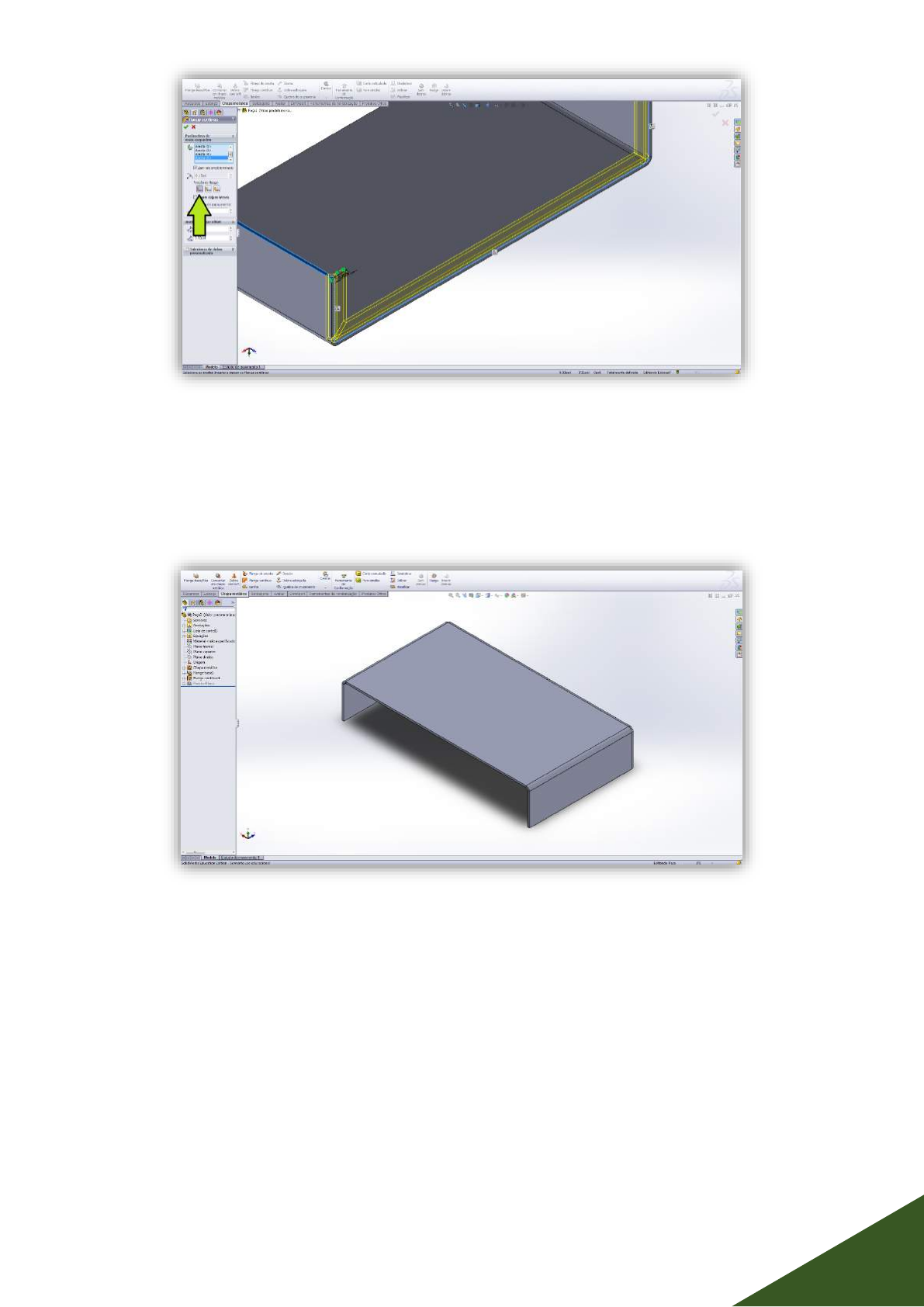 <p>UTFPR</p><p>DAMEC-LAPRO</p><p>Apostila de exercícios de participação para SolidWorks 2015/16</p><p>Volume 2 – Desenho de Fabricação e Chapas Metálicas</p><p>78</p><p>D = 0,625</p><p>Retorne a vista para Isométrica e observe a composição do flange contínuo.</p><p>Modifique agora a isométrica de forma que a parte posterior da peça seja mostrada.</p><p>Vamos agora criar uma flange diretamente usando a aresta. Clique em “Flange de Aresta”.</p>