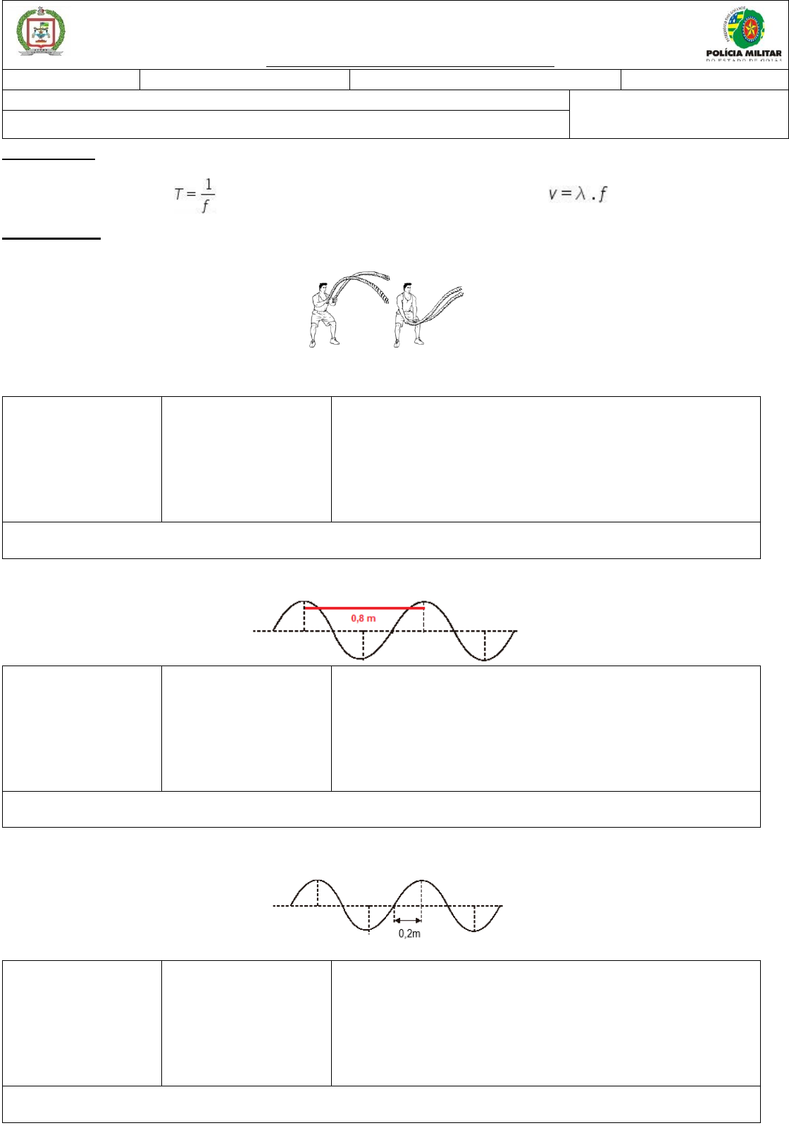 <p>SECRETARIA DE SEGURANÇA PÚBLICA/SECRETARIA DE EDUCAÇÃO</p><p>COLÉGIO ESTADUAL DA POLÍCIA MILITAR DE GOIÁS</p><p>UNIDADE - VASCO DOS REIS</p><p>Divisão de Ensino / Coordenação Pedagógica</p><p>SÉRIE/ANO: 9º TURMA(S): A, B, C, D, E, F, G DISCIPLINA: CIÊNCIAS DATA: / / 2024</p><p>PROFESSORA: MARA CRISTINA</p><p>ATIVIDADE 2 – 3º BIMESTRE</p><p>ALUNO (A): ___________________________________________________________________N°</p><p>FÓRMULAS:</p><p>• Relação entre período e frequência:</p><p>• Velocidade de propagação</p><p>ATIVIDADES:</p><p>1. Analise a imagem abaixo, que representa um tipo de exercício de musculação.</p><p>Considere que o rapaz mova as pontas das cordas apenas na vertical, em movimentos repetitivos. Se o</p><p>movimento é repetido a cada 0,5s, qual a frequência das ondas produzidas?</p><p>Dados: Fórmula: Cálculo:</p><p>Resposta:</p><p>2. Na figura está representada uma onda que se propaga com velocidade de 20 m/s. Calcule a frequência da</p><p>onda, em hertz.</p><p>Dados: Fórmula: Cálculo:</p><p>Resposta:</p><p>3. Na figura está representada a configuração de uma onda mecânica que se propaga com velocidade de 20</p><p>m/s.</p><p>A frequência da onda, em hertz, vale:</p><p>Dados: Fórmula: Cálculo:</p><p>Resposta:</p><p>4. O gráfico abaixo representa uma onda que se propaga com velocidade igual a 300m/s.</p><p>Determine:</p><p>a) a amplitude da onda.</p><p>Dados: Fórmula: Cálculo:</p><p>Resposta:</p><p>b) o comprimento de onda.</p><p>Dados: Fórmula: Cálculo:</p><p>Resposta:</p><p>c) a frequência da onda.</p><p>Dados: Fórmula: Cálculo:</p><p>Resposta:</p><p>d) o período.</p><p>Dados: Fórmula: Cálculo:</p><p>Resposta:</p>