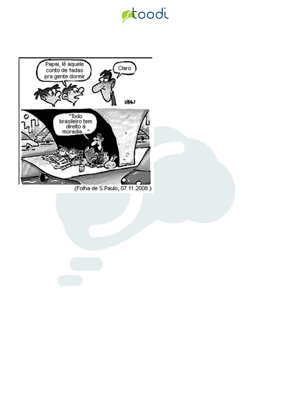 <p>Página 1</p><p>Copyright (c) 2013 - 2018 Stoodi Ensino e Treinamento a Distância LTDA - EPP - Todos os direitos reservados</p><p>1. UNESP 2012</p><p>Analise a charge.</p><p>Sobre o processo de produção do espaço urbano e o acesso à moradia no Brasil, é correto afirmar que</p><p>a. ao longo de nossa história não houve necessidade de políticas específicas para a habitação, visto que o processo natural de</p><p>produção do espaço urbano brasileiro vem criando oportunidade de moradia para todos.</p><p>b. as políticas sociais de assistência à moradia promovidas pelo Estado vêm historicamente garantindo acesso à moradia à</p><p>população brasileira de alta renda.</p><p>c. a dinâmica de oferta de moradia, comandada pelo mercado imobiliário, vem proporcionando acesso à moradia para todas as</p><p>classes sociais, inclusive aquelas de baixa renda.</p><p>d. o processo de urbanização, ao ser dado sob a lógica capitalista, produziu uma intensa especulação imobiliária, que vem</p><p>restringindo o acesso à moradia para a população pobre.</p><p>e. os movimentos sociais que lutam por moradia nas cidades reivindicam um direito que não é previsto pela Constituição do país.</p><p>2. ENEM 2010</p><p>Os lixões são o pior tipo de disposição final dos resíduos sólidos de uma cidade, representando um grave problema ambiental e de</p><p>saúde pública. Nesses locais, o lixo é jogado diretamente no solo e a céu aberto, sem nenhuma norma de controle, o que causa,</p><p>entre outros problemas, a contaminação do solo e das águas pelo chorume (líquido escuro com alta carga poluidora, proveniente da</p><p>decomposição da matéria orgânica presente no lixo).</p><p>RICARDO, B.; CANPANILLI, M. Almanaque Brasil Socioambiental 2008.</p><p>São Paulo, Instituto Socioambiental, 2007.</p><p>Considere um município que deposita os resíduos sólidos produzidos por sua população em um lixão. Esse procedimento é</p><p>considerado um problema de saúde pública porque os lixões</p><p>a. causam problemas respiratórios, devido ao mau cheiro que provém da decomposição.</p><p>Página 2</p><p>Copyright (c) 2013 - 2018 Stoodi Ensino e Treinamento a Distância LTDA - EPP - Todos os direitos reservados</p><p>b. são locais propícios à proliferação de vetores de doenças, além de contaminarem o solo e as águas.</p><p>c. provocam o fenômeno da chuva ácida, devido aos gases oriundos da decomposição da matéria orgânica.</p><p>d. são instalados próximos ao centro das cidades, afetando toda a população que circula diariamente na área.</p><p>e. são responsáveis pelo desaparecimento das nascentes na região onde são instalados, o que leva à escassez de água.</p><p>3. FUVEST 2009</p><p>A recente urbanização brasileira tem características parcialmente representadas nas situações I e II dos esquemas a seguir.</p><p>Considerando essas situações, é correto afirmar que, entre outros processos,</p><p>a. I representa a involução urbana de uma metrópole regional.</p><p>b. I representa a perda demográfica relativa da cidade central de uma Região Metropolitana.</p><p>c. II representa o desmembramento territorial e criação de novos municípios.</p><p>d. II representa a formação de uma região metropolitana, a partir do fenômeno da conurbação.</p><p>e. II representa a fusão político-administrativa de municípios vizinhos.</p><p>4. ENEM 2011</p><p>Subindo morros, margeando córregos ou penduradas em palafitas, as favelas fazem parte da paisagem de um terço dos municípios</p><p>do país, abrigando mais de 10 milhões de pessoas, segundo dados do Instituto Brasileiro de Geografia e Estatística (IBGE).</p><p>MARTINS, A. R. A favela como um espaço da cidade. Disponível em: http://www.revistaescola.abril.com.br. Acesso em: 31 jul. 2010.</p><p>A situação das favelas no país reporta a graves problemas de desordenamento territorial. Nesse sentido, uma característica comum a</p><p>esses espaços tem sido</p><p>a. o planejamento para a implantação de infraestruturas urbanas necessárias para atender as necessidades básicas dos moradores.</p><p>b. a organização de associações de moradores interessadas na melhoria do espaço urbano e financiadas pelo poder público.</p><p>c. a presença de ações referentes à educação ambiental com consequente preservação dos espaços naturais circundantes.</p><p>d. a ocupação de áreas de risco suscetíveis a enchentes ou desmoronamentos com consequentes perdas materiais e humanas.</p><p>e. o isolamento socioeconômico dos moradores ocupantes desses espaços com a resultante multiplicação de políticas que tentam</p><p>reverter esse quadro.</p><p>Página 3</p><p>Copyright (c) 2013 - 2018 Stoodi Ensino e Treinamento a Distância LTDA - EPP - Todos os direitos reservados</p><p>5. UFRGS 2015</p><p>Observe a imagem abaixo.</p><p>Da janela de um avião descendo no aeroporto de Guarulhos, percebe-se que a extensão da malha urbana dificulta a definição dos</p><p>limites entre os municípios vizinhos ao de São Paulo. O conceito que melhor expressa a unificação da extensão territorial de vários</p><p>municípios é</p><p>a. conurbação.</p><p>b. aglomeração.</p><p>c. região metropolitana.</p><p>d. regiões distritais.</p><p>e. desmunicipalização.</p><p>6. UERJ 2016</p><p>Em Nova York, habitação social vive o “boom” das rendas mistas</p><p>"50-30-20" é um termo quente na cidade norte-americana de Nova York hoje em dia. É também o apelido dos imóveis financiados</p><p>pela prefeitura que miram a integração das rendas mistas na habitação. Nesse modelo de empreendimento, 50% do total de unidades</p><p>de cada prédio são ocupadas por famílias de classe média, 30% por moradores de classe média-baixa, e 20% destinam-se à baixa</p><p>renda. O presidente da Companhia de Desenvolvimento Habitacional de Nova York, Marc Jahr, afirma que a instituição já financiou e</p><p>construiu qu