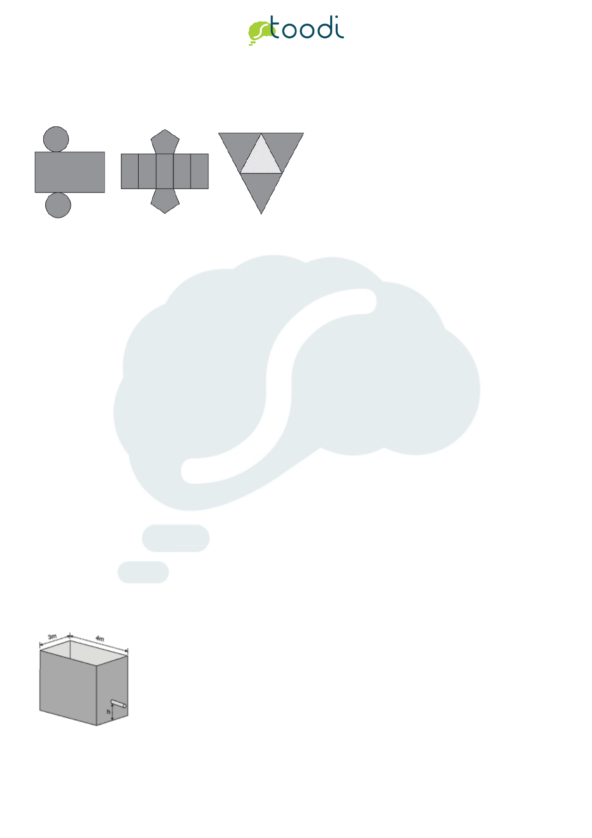 <p>Página 1</p><p>Copyright (c) 2013 - 2018 Stoodi Ensino e Treinamento a Distância LTDA - EPP - Todos os direitos reservados</p><p>1. ENEM 2012</p><p>Maria quer inovar em sua loja de embalagens e decidiu vender caixas com diferentes formatos. Nas imagens apresentadas estão as</p><p>planificações dessas caixas.</p><p>Quais serão os sólidos geométricos que Maria obterá a partir dessas planificações?</p><p>a. Cilindo, prisma de base pentagonal e pirâmide.</p><p>b. Cone, prisma de base pentagonal e pirâmide.</p><p>c. Cone, trondo ce priâmide e pirâmide.</p><p>d. Cilindro, tronco de pirâmide e prisma.</p><p>e. Cilindro, prisma e tronco de cone.</p><p>2. Stoodi</p><p>O fundo de uma piscina tem o formato retangular de medidas 7m por 4m. Sabendo que a piscina tem capacidade máxima de 84m³ de</p><p>água, qual a altura da piscina?</p><p>a. 3m</p><p>b. 6m</p><p>c. 9m</p><p>d. 12m</p><p>e. 15m</p><p>3. UFPB 2010</p><p>O reservatório de água de certo edifício tem a forma de um paralelepípedo reto retangular com base de dimensões internas 3m x 4m,</p><p>conforme a figura a seguir.</p><p>De acordo com as condições do edificio, por medida de segurança, recomenda-se que, no reservatório, deve ficar retida uma</p><p>quantidade de água correspondente a 18m3, para combater incêndio. Para atender essa recomendação, o ponto de saída da água,</p><p>destinada ao consumo diário dos moradores e do condomínio, deve ficar a uma determinada altura ( h ) do fundo do reservatório, de</p><p>modo que a água acumulada no reservatório até essa altura seja destinada para combate a incêndio. Nessas condições, a altura (h)</p><p>Página 2</p><p>Copyright (c) 2013 - 2018 Stoodi Ensino e Treinamento a Distância LTDA - EPP - Todos os direitos reservados</p><p>da saída da água para consumo diário deve ser, pelo menos, de:</p><p>a. 1m</p><p>b. 1,5m</p><p>c. 2m</p><p>d. 2,5m</p><p>e. 3m</p><p>4. ENEM 2015</p><p>Uma carga de 100 contêineres, idênticos ao modelo apresentado na Figura 1, deverá ser descarregada no</p><p>porto de uma cidade. Para isso, uma área retangular de 10m por 32 m foi cedida para o empilhamento</p><p>desses contêineres (Figura 2).</p><p>.</p><p>De acordo com as normas desse porto, os contêineres deverão ser empilhados de forma a não sobrarem espaços nem ultrapassarem</p><p>a área delimitada.</p><p>Após o empilhamento total da carga e atendendo à norma do porto, a altura mínima a ser atingida por essa pilha de contêineres é</p><p>a. 12,5 m.</p><p>b. 17,5 m.</p><p>c. 25,0 m.</p><p>d. 22,5 m.</p><p>e. 32,5 m.</p><p>5. ENEM</p><p>Alguns objetos, durante a sua fabricação, necessitam passar por um processo de resfriamento. Para que isso ocorra, uma fábrica</p><p>utiliza um tanque de resfriamento, como mostrado na figura.</p><p>Página 3</p><p>Copyright (c) 2013 - 2018 Stoodi Ensino e Treinamento a Distância LTDA - EPP - Todos os direitos reservados</p><p>O que aconteceria com o nível da água se colocássemos no tanque um objeto cujo volume fosse de 2 400 cm3?</p><p>a. O nível subiria 0,2 cm, fazendo a água ficar com 20,2 cm de altura.</p><p>b. O nível subiria 1 cm, fazendo a água ficar com 21 cm de altura.</p><p>c. O nível subiria 2 cm, fazendo a água ficar com 22 cm de altura.</p><p>d. O nível subiria 8 cm, fazendo a água transbordar.</p><p>e. O nível subiria 20 cm, fazendo a água transbordar.</p><p>6. ENEM 2012</p><p>Alguns objetos, durante a sua fabricação, necessitam passa por um processo de resfriamento. Para que isso ocorra, uma fábrica</p><p>utiliza um tanque de resfriamento, como mostrado na figura.</p><p>O que aconteceria com o nível da água se colocássemos no tanque um objeto cujo volume fosse de 2400cm3</p><p>a. O nível subiria 0,2 cm, fazendo a água ficar com 20,2 cm de altura.</p><p>b. O nível subiria 1 cm, fazendo a água ficar com 21 cm de altura.</p><p>c. O nível subiria 2 cm, fazendo a água ficar com 22 cm de altura.</p><p>d. O nível subiria 8 cm, fazendo a água transbordar.</p><p>e. O nível subiria 20 cm, fazendo a água transbordar.</p><p>7. Stoodi</p><p>Qual a medida da aresta de um cubo cuja diagonal mede 12 cm?</p><p>a. cm</p><p>b. cm</p><p>Página 4</p><p>Copyright (c) 2013 - 2018 Stoodi Ensino e Treinamento a Distância LTDA - EPP - Todos os direitos reservados</p><p>c. cm</p><p>d. cm</p><p>e. cm</p><p>8. ENEM 2017</p><p>Uma empresa especializada em conservação de piscinas utiliza um produto para tratamento da água cujas especificações técnicas</p><p>sugerem que seja adicionado 1,5mL desse produto para cada 1000L de água da piscina. Essa empresa foi contratada para cuidar de</p><p>uma piscina de base retangular, de profundidade constante igual a 1,7m com largura e comprimento iguais a 3m e 5m</p><p>respectivamente. O nível da lâmina d’água dessa piscina é mantido a 50cm da borda da piscina.</p><p>A quantidade desse produto, em mililitro, que deve ser adicionada a essa piscina de modo a atender às suas especificações técnicas</p><p>é</p><p>a. 11,25</p><p>b. 27,00</p><p>c. 28,80</p><p>d. 32,25</p><p>e. 49,50</p><p>9. ENEM 2017</p><p>Para a Olimpíada de 2012, a piscina principal do Centro Aquático de Londres, medindo 50 metros de comprimento, foi remodelada</p><p>para ajudar os atletas a melhorar suas marcas. Observe duas das melhorias:</p><p>A capacidade da piscina em destaque, em metro cúbico, é gual a</p><p>a. 3750</p><p>b. 1500</p><p>c. 1250</p><p>d. 375</p><p>e. 150</p><p>Página 5</p><p>Copyright (c) 2013 - 2018 Stoodi Ensino e Treinamento a Distância LTDA - EPP - Todos os direitos reservados</p><p>10. UEPB</p><p>Um reservatório em forma de cubo, cuja diagonal mede m, tem capacidade igual a:</p><p>a. 4.000 litros</p><p>b. 6.000 litros</p><p>c. 8.000 litros</p><p>d. 2.000 litros</p><p>e. 1.000 litros</p><p>11. ENEM 2017</p><p>Uma rede hoteleira dispõe de cabanas simples na ilha de Gotland, na Suécia, conforme Figura 1. A estrutura de sustentação de cada</p><p>uma dessas ca