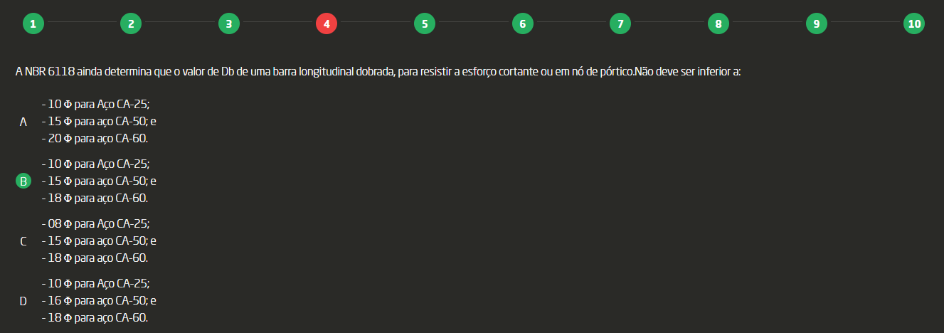 1 2 3 4 5 6 7 8 9 A NBR 6118 ainda determina que valor de Db de uma barra longitudinal dobrada, para resistir a esforço cortante em nó de pórtico.Não deve ser inferior a: - 10 para CA-25; A - para aço CA-50; e - para aço CA-60. - para Aço CA-25; B - para aço CA-50; e para aço CA-60. - 08 para Aço CA-25; C - 15 para aço CA-50; e - 18 para aço CA-60. - para CA-25; D para aço CA-50; e - 18 para aço CA-60.