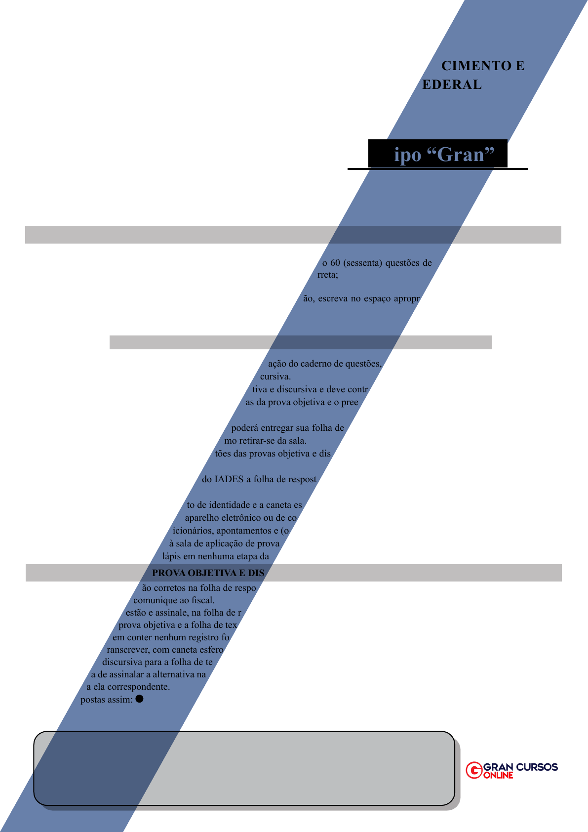 <p>SECRETARIA DE ESTADO DA AGRICULTURA, ABASTECIMENTO E</p><p>DESENVOLVIMENTO RURAL DO DISTRITO FEDERAL</p><p>3º SIMULADO</p><p>TÉCNICO DE DESENVOLVIMENTO</p><p>E FISCALIZAÇÃO AGROPECUÁRIA</p><p>- ESPECIALIDADE - AGENTE</p><p>ADMINISTRATIVO (PÓS-EDITAL)</p><p>Tipo “Gran”</p><p>INSTRUÇÕES</p><p>Vejo nelas gravadas as suas feições</p><p>Você receberá do fiscal:</p><p>o um caderno de questões das provas objetiva e discursiva contendo 60 (sessenta) questões de múltipla escolha, com 5 (cinco)</p><p>alternativas de resposta cada uma e apenas 1 (uma) alternativa correta;</p><p>o uma folha de respostas personalizada da prova objetiva.</p><p>Quando autorizado pelo fiscal do IADES, no momento da identificação, escreva no espaço apropriado da folha de respostas da prova</p><p>objetiva, com a sua caligrafia usual, a seguinte frase:</p><p>Verifique se estão corretas a numeração das questões e a paginação do caderno de questões, bem como a codificação da folha de respostas</p><p>da prova objetiva e da folha de texto definitivo da prova discursiva.</p><p>Você dispõe de 4 (quatro) horas para fazer as provas objetiva e discursiva e deve controlar o tempo, pois não haverá prorrogação desse</p><p>prazo. Esse tempo inclui a marcação da folha de respostas da prova objetiva e o preenchimento da folha de texto definitivo da prova dis-</p><p>cursiva.</p><p>Somente 1 (uma) hora após o início da prova, você poderá entregar sua folha de respostas da prova objetiva, a folha de texto definitivo</p><p>da prova discursiva e o caderno de provas, bem como retirar-se da sala.</p><p>Somente será permitido levar o caderno de questões das provas objetiva e discursiva 3 (três) horas e 30 (trinta) minutos após o início da</p><p>prova.</p><p>Após o término da prova, entregue ao fiscal do IADES a folha de respostas da prova objetiva, devidamente assinada, e a folha de texto</p><p>definitivo da prova discursiva.</p><p>Deixe sobre a carteira apenas o documento de identidade e a caneta esferográfica de tinta preta, fabricada com material transparente.</p><p>Não é permitida a utilização de nenhum aparelho eletrônico ou de comunicação.</p><p>Não é permitida a consulta a livros, dicionários, apontamentos e (ou) apostilas.</p><p>Você somente poderá sair e retornar à sala de aplicação de provas na companhia de um fiscal do IADES.</p><p>Não será permitida a utilização de lápis em nenhuma etapa da prova.</p><p>INSTRUÇÕES PARA A PROVA OBJETIVA E DISCURSIVA</p><p>Verifique se os seus dados estão corretos na folha de respostas da prova objetiva e na folha de texto definitivo da prova discursiva. Caso</p><p>haja algum dado incorreto, comunique ao fiscal.</p><p>Leia atentamente cada questão e assinale, na folha de respostas da prova objetiva, uma única alternativa.</p><p>A folha de respostas da prova objetiva e a folha de texto definitivo da prova discursiva não podem ser dobradas, amassadas, rasuradas ou</p><p>manchadas e nem podem conter nenhum registro fora dos locais destinados às respostas.</p><p>O candidato deverá transcrever, com caneta esferográfica de tinta preta, as respostas da prova objetiva para a folha de respostas e o texto</p><p>definitivo da prova discursiva para a folha de texto definitivo.</p><p>A maneira correta de assinalar a alternativa na folha de respostas da prova objetiva é cobrir, fortemente, com caneta esferográfica de tinta</p><p>preta, o espaço a ela correspondente.</p><p>Marque as respostas assim:</p><p>Bas</p><p>ea</p><p>do</p><p>n</p><p>o</p><p>fo</p><p>rm</p><p>at</p><p>o</p><p>de</p><p>p</p><p>ro</p><p>va</p><p>ap</p><p>lic</p><p>ad</p><p>o</p><p>pe</p><p>la</p><p>b</p><p>an</p><p>ca</p><p>IA</p><p>DES</p><p>FOLHA DE ROSTO ORIENTATIVA PARA PROVA OBJETIVA</p><p>LEIA AS ORIENTAÇÕES COM CALMA E ATENÇÃO!</p><p>INSTRUÇÕES GERAIS</p><p>● Atenção ao tempo de duração da prova, que já inclui o preenchimento da folha de respostas.</p><p>● Cada uma das questões da prova objetiva está vinculada ao comando que imediatamente</p><p>a antecede e contém orientação necessária para resposta. Para cada questão, existe</p><p>apenas UMA resposta válida e de acordo com o gabarito.</p><p>● Faltando uma hora para o término do simulado, você receberá um e-mail para preencher</p><p>o cartão-resposta, a fim de avaliar sua posição no ranking. Basta clicar no botão vermelho</p><p>de PREENCHER GABARITO, que estará no e-mail, ou acessar a página de download da</p><p>prova. Você deve fazer o cadastro em nossa plataforma para participar do ranking. Não se</p><p>preocupe: o cadastro é grátis e muito simples de ser realizado.</p><p>– Se a sua prova for estilo Certo ou Errado (CESPE/CEBRASPE):</p><p>marque o campo designado com o código C, caso julgue o item CERTO; ou o campo</p><p>designado com o código E, caso julgue o item ERRADO. Se optar por não responder</p><p>a uma determinada questão, marque o campo “EM BRANCO”. Lembrando que, neste</p><p>estilo de banca, uma resposta errada anula uma resposta certa.</p><p>Obs.: se não houver sinalização quanto à prova ser estilo Cespe/Cebraspe, apesar de</p><p>ser no estilo CERTO e ERRADO, você não terá questões anuladas no cartão-resposta</p><p>em caso de respostas erradas.</p><p>– Se a sua prova for estilo Múltipla Escolha:</p><p>marque o campo designado com a letra da alternativa escolhida (A, B, C, D ou E). É</p><p>preciso responder a todas as questões, pois o sistema não permite o envio do cartão</p><p>com respostas em branco.</p><p>● Uma hora após o encerramento do prazo para preencher o cartão-resposta, você receberá um</p><p>e-mail com o gabarito para conferir seus acertos e erros. Caso você seja aluno da Assinatura</p><p>Ilimitada, você receberá, com o gabarito, a prova completa comentada – uma vantagem</p><p>exclusiva para assinantes, com acesso apenas pelo e-mail e pelo ambiente do aluno.</p><p>Em caso de solicitação de recurso para a