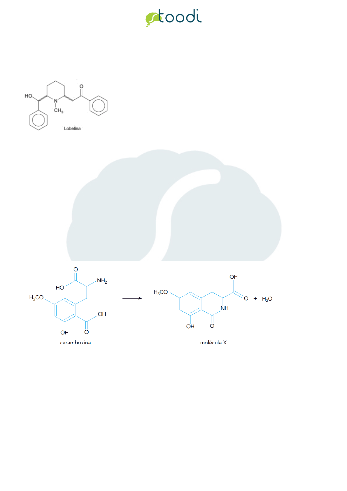 <p>Página 1</p><p>Copyright (c) 2013 - 2018 Stoodi Ensino e Treinamento a Distância LTDA - EPP - Todos os direitos reservados</p><p>1. UEPA 2015</p><p>A imensa flora das Américas deu significativas contribuições a terapêutica, como a descoberta da Iobelina (figura abaixo), molécula</p><p>polifuncionalizada isolada da planta Lobelianicotinaefolia e usada por tribos indígenas que fumavam suas folhas secas para aliviar os</p><p>sintomas da asma.</p><p>Sobre a estrutura química da Iobelina, é correto afirmar que:</p><p>a. possui uma amina terciária</p><p>b. possui um aldeído</p><p>c. possui três carbonos primários</p><p>d. possui uma amida</p><p>e. possui um fenol</p><p>2. UERJ 2017</p><p>Em determinadas condições, a toxina presente na carambola, chamada caramboxina, é convertida em uma molécula X sem atividade</p><p>biológica, conforme representado abaixo.</p><p>Nesse caso, dois grupamentos químicos presentes na caramboxina reagem formando um novo grupamento. A função orgânica desse</p><p>novo grupamento químico é denominada:</p><p>a. éster</p><p>b. fenol</p><p>c. amida</p><p>d. cetona</p><p>3. UCS 2014</p><p>Página 2</p><p>Copyright (c) 2013 - 2018 Stoodi Ensino e Treinamento a Distância LTDA - EPP - Todos os direitos reservados</p><p>Os herbalistas chineses utilizam, há mais de 5000 anos, o extrato da planta Ma-Huang para o tratamento da asma. Um dos</p><p>componentes ativos nesse extrato é a efedrina, cuja estrutura química está representada abaixo.</p><p>a. é um ácido inorgãnico forte e, em solução aquosa, apresentará pH ácido.</p><p>b. possui a função orgânica amina e, em solução aquosa, apresentará pH básico.</p><p>c. é uma amida e, em solução aquosa, apresentará pH neutro.</p><p>d. possui a função orgânica álcool e, em solução aquosa, apresentará pH ácido.</p><p>e. é uma base inorgânica forte e, em solução aquosa, apresentará pH básico.</p><p>4. UEMG 2015</p><p>Anvisa suspende lote de paracetamol e de outros 3 remédios de laboratório.</p><p>"Quatro medicamentos produzidos por um laboratório brasileiro tiveram lotes suspensos por determinação da Anvisa e as decisões</p><p>foram publicadas no Diário Oficial da União nesta quarta-feira. Dentre eles, o Paracetamol 500mg, com validade para 11/2015, foi</p><p>suspenso depois que um consumidor contatou o Procon para denunciar que havia um parafuso no lugar de um dos comprimidos, em</p><p>uma das cartelas do medicamento. Após notificacão do Procon, o laboratório já iniciou o recolhimento voluntário do lote, que foi</p><p>distribuído em Goiás, Minas Gerais, Rio Grande do Sul e Bahia. O medicamento Cetoconazol 200mg, indicado para tratamentos de</p><p>infecções por fungos ou leveduras, teve suspenso o lote com validade para 06/2015. O motivo da suspensão foi uma queixa de um</p><p>consumidor feita ao SAC do laboratório afirmando que encontrou um outro medicamento, o Atenolol 100mg, na cartela do</p><p>Cetoconazol. O atenolol é indicado para o controle de hipertensão arterial. O lote foi distribuído em Goiás, Amazonas, Alagoas, Bahia,</p><p>Minas Gerais, Pará, Rio de Janeiro e São Paulo"</p><p>http://www.g1.globo.com. Acesso em 20/8/2014</p><p>As estruturas do paracetamol, do cetoconazol e do atenolol são mostradas a</p><p>Página 3</p><p>Copyright (c) 2013 - 2018 Stoodi Ensino e Treinamento a Distância LTDA - EPP - Todos os direitos reservados</p><p>Apesar de serem indicadas para diferentes tratamentos, as três substâncias citadas apresentam, em comum, o grupo funcional:</p><p>a. fenol.</p><p>b. amina.</p><p>c. amida.</p><p>d. álcool.</p><p>5. UECE 2015</p><p>Gás lacrimogêneo é o nome genérico dado a vários tipos de substâncias irritantes da pele, dos olhos e das vias respiratórias, tais</p><p>como o brometo de benzila, ou o gás clorobenzilideno malononitrilo. Ao estimular os nervos da córnea, esses gases causam</p><p>lacrimação, dor e mesmo cegueira temporária. O uso crescente do gás lacrimogêneo, pelas polícias de todo o mundo, inclusive no</p><p>Brasil, nas manifestações de rua, como arma de "controle de multidões" deve-se ao fato de ser capaz de dispersar aglomerações, já</p><p>que rapidamente provoca irritação ou incapacitação sensorial – efeitos que normalmente desaparecem algum tempo depois de</p><p>cessada a exposição.</p><p>Com relação ao brometo de benzila e ao gás clorobenzilideno malononitrilo, pode-se afirmar corretamente que</p><p>a. o nome do composto brometo de benzila é característico de um sal misto ou duplo.</p><p>b. pelo nome do gás clorobenzilideno malononitrilo constata-se a presença do grupo nitrilo, também chamado de cianeto, – C ≡ N.</p><p>c. ao acionar o gás clorobenzilideno malononitrilo em direção à multidão, as moléculas se chocam originando uma reação química,</p><p>cujo produto causará lacrimação, dor e cegueira temporária.</p><p>d. pelo nome do composto brometo de benzila, constata-se a presença de um calcogêneo.</p><p>6. PUC-RJ 2015</p><p>A seguir está representada a estrutura da dihidrocapsaicina, uma substância comumente encontrada em pimentas e pimentões.</p><p>Na dihidrocapsaicina, está presente, entre outras, a função orgânica:</p><p>a. álcool.</p><p>b. amina.</p><p>c. amida.</p><p>d. éster.</p><p>e. aldeído.</p><p>7. ANHEMBI MORUMBI 2014</p><p>Página 4</p><p>Copyright (c) 2013 - 2018 Stoodi Ensino e Treinamento a Distância LTDA - EPP - Todos os direitos reservados</p><p>A embalagem de um sabonete antibacteriano informa que o produto contém triclocarban, agente responsável pela eliminação de</p><p>germes e bactérias.</p><p>(www.observatoiredescosmetiques.com)</p><p>De acordo com essa fórmula estrutural, o triclocarban apresenta grupo funcional característico de</p><p>a. éter.</p><p>b. amina.</p><p>c. cetona.</p><p>d. nitrilo.</p><p>e. amida.</p><p>8. FMABC 2018</p><p>Considere as seguintes informações:</p><p>As flores de papoula secas e 