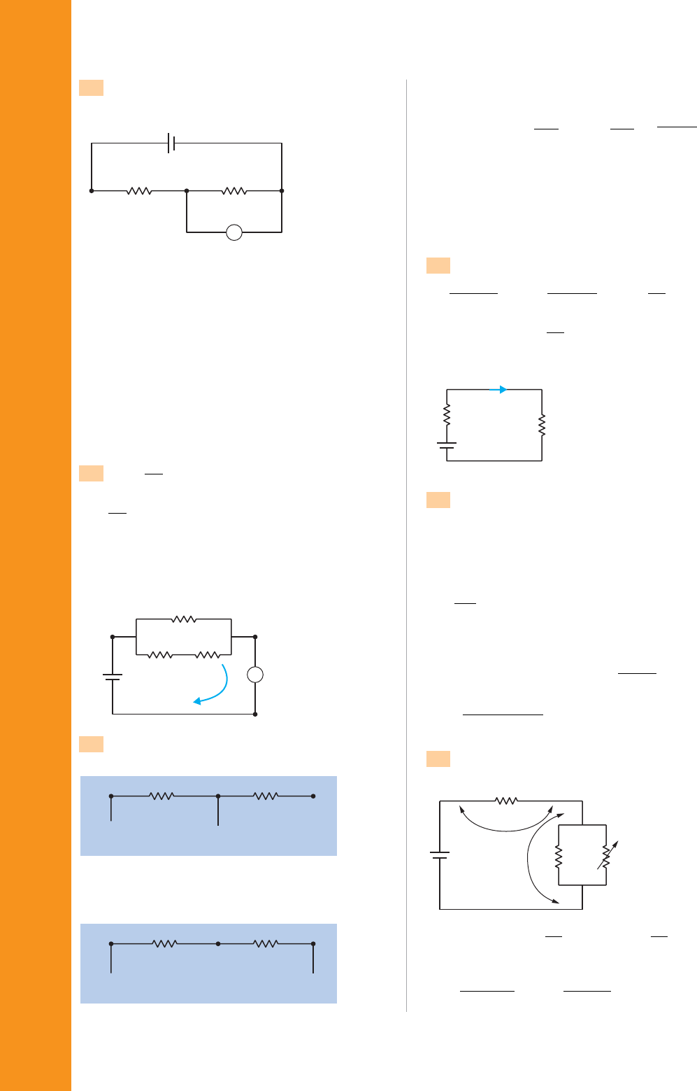 <p>256 RESOLUÇÃO</p><p>SIM</p><p>ULA</p><p>DÃO</p><p>: RE</p><p>SOL</p><p>UÇÃ</p><p>O</p><p>SIM</p><p>ULA</p><p>DÃO</p><p>: RE</p><p>SOL</p><p>UÇÃ</p><p>O</p><p>801 Alternativa e. c) Determinando a resistência do resistor na posição</p><p>verão:</p><p>P � 4 200 W P �</p><p>U</p><p>R</p><p>2</p><p>→ R �</p><p>U</p><p>P</p><p>2</p><p>�</p><p>220</p><p>4200</p><p>2</p><p>U � 220 V</p><p>R � 11,52 Ω</p><p>d) Significa que o resistor, através de efeito Joule,</p><p>transforma energia elétrica em energia térmica, sonora</p><p>e luminosa na razão de 5 400 joules a cada 1 segundo.</p><p>804 U � E � R � i → 0 � E � 10R → E � 10R</p><p>i �</p><p>E</p><p>R Ru�</p><p>→ 5 �</p><p>10</p><p>18</p><p>R</p><p>R � ,</p><p>→ R �</p><p>9</p><p>5</p><p>R</p><p>Daí: E � 10R � 10 �</p><p>9</p><p>5</p><p>� 18 V</p><p>I. Como o voltímetro é ideal, a sua resistência é infi-</p><p>nita. Portanto, no ponto B não há divisão de corrente.</p><p>Então, pode-se afirmar que a corrente em R1 e em R2 é</p><p>a mesma.</p><p>II. UAB � R1 � i � 10i</p><p>UBC � R2 � i � 20 � i � 10 → i � 0,5 A</p><p>UAB � 10 � 0,5 � 5 V � UAB � 5 V</p><p>III. UAC � E E � 5 � 10 � E � 15 V</p><p>UAC � UAB � UBC</p><p>IV. P2 � R2 � i</p><p>2 � 20 � (0,5)2 → P2 � 5 W</p><p>802 a) i �</p><p>P</p><p>U</p><p>� 4,0 A</p><p>R �</p><p>U</p><p>i</p><p>� 1,5 W</p><p>b) UBC � 6,0 V; i � 4,0 A</p><p>UAB � 6,0 V</p><p>� RAB � 1,5 Ω</p><p>V</p><p>E</p><p>A</p><p>B</p><p>C</p><p>R1 R2</p><p>10 � 20 �</p><p>UV � 10 V</p><p>A B</p><p>R3</p><p>R1 R2</p><p>L</p><p>C</p><p>12 V</p><p>i</p><p>803 a) Na posição inverno devemos ter maior potên-</p><p>cia dissipada, portanto, a menor resistência equivalente.</p><p>A B C</p><p>fio fase</p><p>fixo</p><p>fio neutro</p><p>b) Na posição verão devemos ter a menor potência</p><p>dissipada, portanto a maior resistência equivalente.</p><p>A B C</p><p>fio fase</p><p>fixo</p><p>fio neutro</p><p>R</p><p>RV � 1,8�</p><p>i</p><p>E</p><p>805 a) V – ddp nos terminais da bateria V � E � i � r</p><p>V� – ddp nos terminais do resistor V� � i � R</p><p>Como V � V� → E � i � r � i � R → 12 � 3r � 3,0 � 3,5</p><p>→ r � 0,5 Ω</p><p>b) V � E � i � r � V � 12 � 3,0 � 0,50 → V � 10,5 V →</p><p>V � 11 V</p><p>� �</p><p>P</p><p>P</p><p>u</p><p>T</p><p>� e PT � E � i � 36 W → � � 88%</p><p>d) E � Pu � �t → E � 31,5 � 10 � 60 � 18 900 → E �</p><p>1,9 � 104 J</p><p>e) E � �Q � m � c � �� → �� �</p><p>E</p><p>m c�</p><p>→</p><p>�T �</p><p>18900 0 24</p><p>240</p><p>� ,</p><p>→ �� � 19 °C</p><p>806 Alternativa a.</p><p>E</p><p>20 �</p><p>6 �R2U2</p><p>R1</p><p>U1</p><p>RV � (0 � 50 �)</p><p>E � U1 � U2 → E �</p><p>E</p><p>2</p><p>� U2 → U2 �</p><p>E</p><p>2</p><p>Logo:</p><p>R1 �</p><p>R R</p><p>R R</p><p>v</p><p>v</p><p>2</p><p>2</p><p>�</p><p>�</p><p>→ 4 �</p><p>6</p><p>6</p><p>�</p><p>�</p><p>R</p><p>R</p><p>v</p><p>v</p><p>Rv � 12 Ω</p>