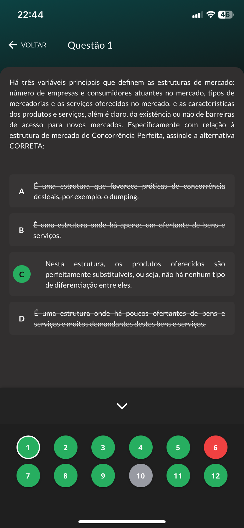 22:44 46 VOLTAR Questão 1 Há três variáveis principais que definem as estruturas de mercado: número de empresas e consumidores atuantes no mercado, tipos de mercadorias e os serviços oferecidos no mercado, e as características dos produtos e serviços, além é claro, da existência ou não de barreiras de acesso para novos mercados. Especificamente com relação à estrutura de mercado de Concorrência Perfeita, assinale a alternativa CORRETA: É A desleais, per exemple, e É estrutura onde há apenas um ofertante de bens e B serviços. Nesta estrutura, os produtos oferecidos são C perfeitamente substituíveis, ou seja, não há nenhum tipo de diferenciação entre eles. É uma estrutura : há ofertantes de bens e D serviços e demandantes destes bens e serviços. V 1 2 3 4 5 6 7 8 9 10 11 12