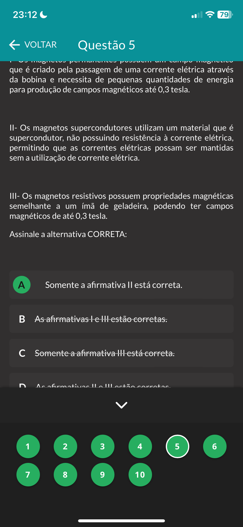 23:12 79 VOLTAR Questão 5 que é criado pela passagem de uma corrente elétrica através da bobina e necessita de pequenas quantidades de energia para produção de campos magnéticos até 0,3 tesla. II- Os magnetos supercondutores utilizam um material que é supercondutor, não possuindo resistência à corrente elétrica, permitindo que as correntes elétricas possam ser mantidas sem a utilização de corrente elétrica. III- Os magnetos resistivos possuem propriedades magnéticas semelhante a um de geladeira, podendo ter campos magnéticos de até 0,3 tesla. Assinale a alternativa CORRETA: A Somente a afirmativa II está correta. B As afirmativas le corretas. Semente a afirmativa III está correta. D 1 2 3 4 5 6 7 8 9 10