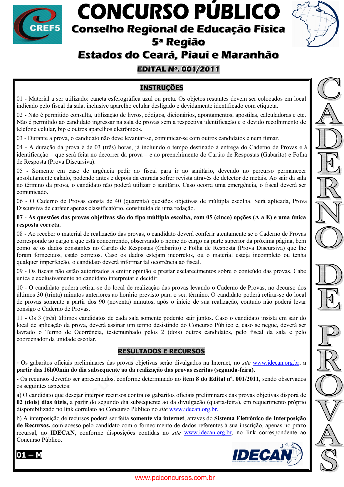 <p>pcimarkpci MDAwMDowMDAwOjAwMDA6MDAwMDowMDAwOmZmZmY6YjEzMzo0YjRj:TW9uLCAyMSBPY3QgMjAyNCAxNjo0NDowNCAtMDMwMA==</p><p>www.pciconcursos.com.br</p><p>CCCooonnnssseeelllhhhooo RRReeegggiiiooonnnaaalll dddeee EEEddduuucccaaaçççãããooo FFFííísssiiicccaaa</p><p>555ªªª RRReeegggiiiãããooo</p><p>EEEssstttaaadddooosss dddooo CCCeeeaaarrrááá,,, PPPiiiaaauuuííí eee MMMaaarrraaannnhhhãããooo</p><p>EEEDDDIIITTTAAALLL NNNººº... 000000111///222000111111</p><p>INSTRUÇÕES</p><p>01 - Material a ser utilizado: caneta esferográfica azul ou preta. Os objetos restantes devem ser colocados em local</p><p>indicado pelo fiscal da sala, inclusive aparelho celular desligado e devidamente identificado com etiqueta.</p><p>02 - Não é permitido consulta, utilização de livros, códigos, dicionários, apontamentos, apostilas, calculadoras e etc.</p><p>Não é permitido ao candidato ingressar na sala de provas sem a respectiva identificação e o devido recolhimento de</p><p>telefone celular, bip e outros aparelhos eletrônicos.</p><p>03 - Durante a prova, o candidato não deve levantar-se, comunicar-se com outros candidatos e nem fumar.</p><p>04 - A duração da prova é de 03 (três) horas, já incluindo o tempo destinado à entrega do Caderno de Provas e à</p><p>identificação – que será feita no decorrer da prova – e ao preenchimento do Cartão de Respostas (Gabarito) e Folha</p><p>de Resposta (Prova Discursiva).</p><p>05 - Somente em caso de urgência pedir ao fiscal para ir ao sanitário, devendo no percurso permanecer</p><p>absolutamente calado, podendo antes e depois da entrada sofrer revista através de detector de metais. Ao sair da sala</p><p>no término da prova, o candidato não poderá utilizar o sanitário. Caso ocorra uma emergência, o fiscal deverá ser</p><p>comunicado.</p><p>06 - O Caderno de Provas consta de 40 (quarenta) questões objetivas de múltipla escolha. Será aplicada, Prova</p><p>Discursiva de caráter apenas classificatório, constituída de uma redação.</p><p>07 - As questões das provas objetivas são do tipo múltipla escolha, com 05 (cinco) opções (A a E) e uma única</p><p>resposta correta.</p><p>08 - Ao receber o material de realização das provas, o candidato deverá conferir atentamente se o Caderno de Provas</p><p>corresponde ao cargo a que está concorrendo, observando o nome do cargo na parte superior da próxima página, bem</p><p>como se os dados constantes no Cartão de Respostas (Gabarito) e Folha de Resposta (Prova Discursiva) que lhe</p><p>foram fornecidos, estão corretos. Caso os dados estejam incorretos, ou o material esteja incompleto ou tenha</p><p>qualquer imperfeição, o candidato deverá informar tal ocorrência ao fiscal.</p><p>09 - Os fiscais não estão autorizados a emitir opinião e prestar esclarecimentos sobre o conteúdo das provas. Cabe</p><p>única e exclusivamente ao candidato interpretar e decidir.</p><p>10 - O candidato poderá retirar-se do local de realização das provas levando o Caderno de Provas, no decurso dos</p><p>últimos 30 (trinta) minutos anteriores ao horário previsto para o seu término. O candidato poderá retirar-se do local</p><p>de provas somente a partir dos 90 (noventa) minutos, após o início de sua realização, contudo não poderá levar</p><p>consigo o Caderno de Provas.</p><p>11 - Os 3 (três) últimos candidatos de cada sala somente poderão sair juntos. Caso o candidato insista em sair do</p><p>local de aplicação da prova, deverá assinar um termo desistindo do Concurso Público e, caso se negue, deverá ser</p><p>lavrado o Termo de Ocorrência, testemunhado pelos 2 (dois) outros candidatos, pelo fiscal da sala e pelo</p><p>coordenador da unidade escolar.</p><p>RESULTADOS E RECURSOS</p><p>- Os gabaritos oficiais preliminares das provas objetivas serão divulgados na Internet, no site www.idecan.org.br, a</p><p>partir das 16h00min do dia subsequente ao da realização das provas escritas (segunda-feira).</p><p>- Os recursos deverão ser apresentados, conforme determinado no item 8 do Edital nº. 001/2011, sendo observados</p><p>os seguintes aspectos:</p><p>a) O candidato que desejar interpor recursos contra os gabaritos oficiais preliminares das provas objetivas disporá de</p><p>02 (dois) dias úteis, a partir do segundo dia subsequente ao da divulgação (quarta-feira), em requerimento próprio</p><p>disponibilizado no link correlato ao Concurso Público no site www.idecan.org.br.</p><p>b) A interposição de recursos poderá ser feita somente via internet, através do Sistema Eletrônico de Interposição</p><p>de Recursos, com acesso pelo candidato com o fornecimento de dados referentes à sua inscrição, apenas no prazo</p><p>recursal, ao IDECAN, conforme disposições contidas no site www.idecan.org.br, no link correspondente ao</p><p>Concurso Público.</p><p>01 – M</p><p>www.pciconcursos.com.br</p><p>pcimarkpci MDAwMDowMDAwOjAwMDA6MDAwMDowMDAwOmZmZmY6YjEzMzo0YjRj:TW9uLCAyMSBPY3QgMjAyNCAxNjo0NDowNCAtMDMwMA==</p><p>www.pciconcursos.com.br</p><p>CCCOOONNNCCCUUURRRSSSOOO PPPÚÚÚBBBLLLIIICCCOOO ––– CCCOOONNNSSSEEELLLHHHOOO RRREEEGGGIIIOOONNNAAALLL DDDEEE EEEDDDUUUCCCAAAÇÇÇÃÃÃOOO FFFÍÍÍSSSIIICCCAAA ––– 555ªªª RRREEEGGGIIIÃÃÃOOO</p><p>AGENTE DE ORIENTAÇÃO E FISCALIZAÇÃO</p><p>www.idecan.org.br / atendimento@idecan.org.br - 2 -</p><p>CCAARRGGOO:: AAGGEENNTTEE DDEE OORRIIEENNTTAAÇÇÃÃOO EE FFIISSCCAALLIIZZAAÇÇÃÃOO</p><p>TEXTO I: A destruição da esfera pública pela metástase da intimidade</p><p>Na Coreia do Sul, por exemplo, onde a maior parte da vida social já é habitualmente mediada por aparelhos</p><p>eletrônicos (ou, ao contrário, onde a vida social já se transformou em vida eletrônica ou em cibervida, e onde a “vida</p><p>social”, em boa parte, transcorre principalmente na companhia de um computador, de um iPod ou de um celular e só</p><p>secundariamente na companhia de outros seres de carne e osso), é totalmente evid