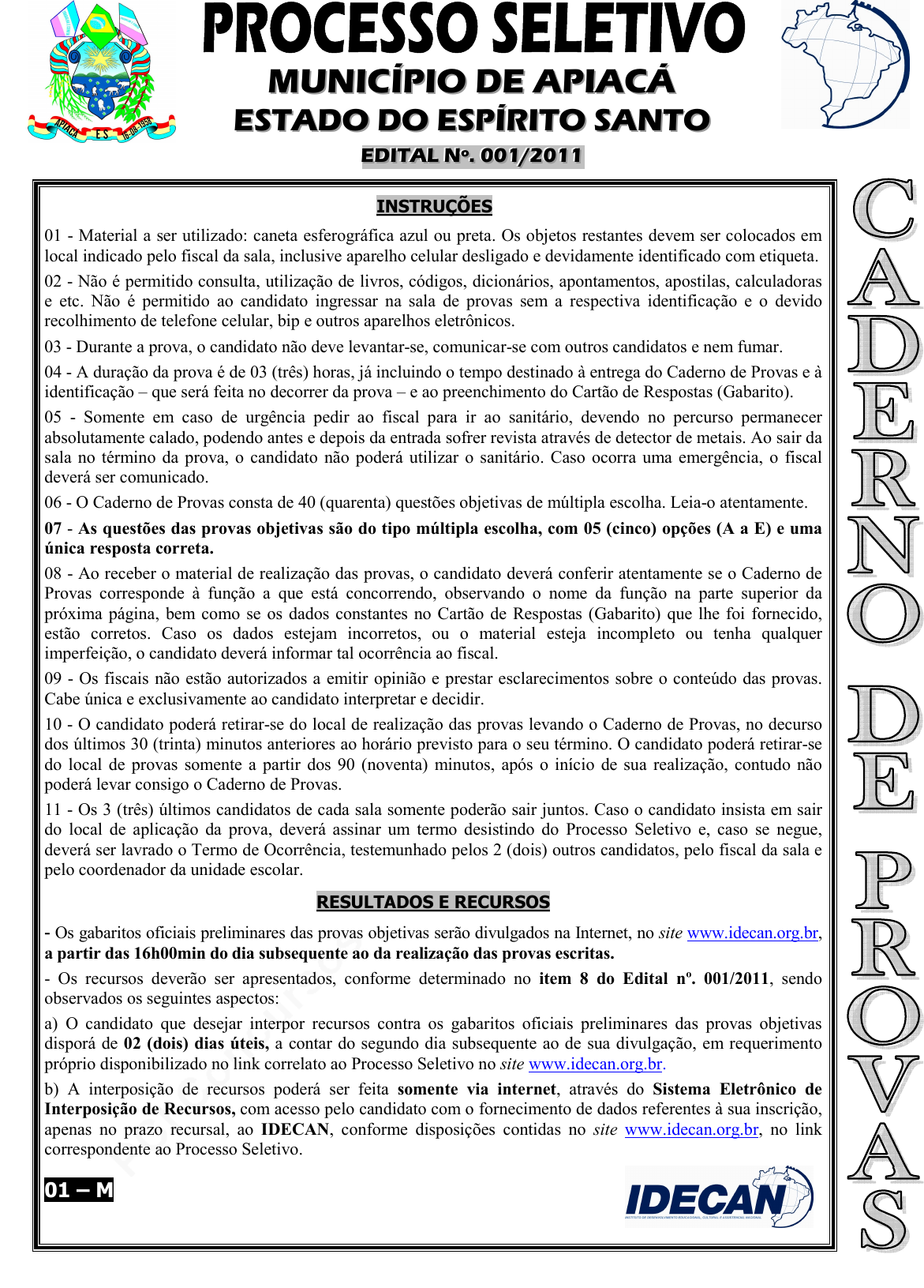 <p>pcimarkpci MDAwMDowMDAwOjAwMDA6MDAwMDowMDAwOmZmZmY6YjEzMzo0YjRj:TW9uLCAyMSBPY3QgMjAyNCAxNjo0Mzo1MyAtMDMwMA==</p><p>www.pciconcursos.com.br</p><p>MMMUUUNNNIIICCCÍÍÍPPPIIIOOO DDDEEE AAAPPPIIIAAACCCÁÁÁ</p><p>EEESSSTTTAAADDDOOO DDDOOO EEESSSPPPÍÍÍRRRIIITTTOOO SSSAAANNNTTTOOO</p><p>EEEDDDIIITTTAAALLL NNNººº... 000000111///222000111111</p><p>INSTRUÇÕES</p><p>01 - Material a ser utilizado: caneta esferográfica azul ou preta. Os objetos restantes devem ser colocados em</p><p>local indicado pelo fiscal da sala, inclusive aparelho celular desligado e devidamente identificado com etiqueta.</p><p>02 - Não é permitido consulta, utilização de livros, códigos, dicionários, apontamentos, apostilas, calculadoras</p><p>e etc. Não é permitido ao candidato ingressar na sala de provas sem a respectiva identificação e o devido</p><p>recolhimento de telefone celular, bip e outros aparelhos eletrônicos.</p><p>03 - Durante a prova, o candidato não deve levantar-se, comunicar-se com outros candidatos e nem fumar.</p><p>04 - A duração da prova é de 03 (três) horas, já incluindo o tempo destinado à entrega do Caderno de Provas e à</p><p>identificação – que será feita no decorrer da prova – e ao preenchimento do Cartão de Respostas (Gabarito).</p><p>05 - Somente em caso de urgência pedir ao fiscal para ir ao sanitário, devendo no percurso permanecer</p><p>absolutamente calado, podendo antes e depois da entrada sofrer revista através de detector de metais. Ao sair da</p><p>sala no término da prova, o candidato não poderá utilizar o sanitário. Caso ocorra uma emergência, o fiscal</p><p>deverá ser comunicado.</p><p>06 - O Caderno de Provas consta de 40 (quarenta) questões objetivas de múltipla escolha. Leia-o atentamente.</p><p>07 - As questões das provas objetivas são do tipo múltipla escolha, com 05 (cinco) opções (A a E) e uma</p><p>única resposta correta.</p><p>08 - Ao receber o material de realização das provas, o candidato deverá conferir atentamente se o Caderno de</p><p>Provas corresponde à função a que está concorrendo, observando o nome da função na parte superior da</p><p>próxima página, bem como se os dados constantes no Cartão de Respostas (Gabarito) que lhe foi fornecido,</p><p>estão corretos. Caso os dados estejam incorretos, ou o material esteja incompleto ou tenha qualquer</p><p>imperfeição, o candidato deverá informar tal ocorrência ao fiscal.</p><p>09 - Os fiscais não estão autorizados a emitir opinião e prestar esclarecimentos sobre o conteúdo das provas.</p><p>Cabe única e exclusivamente ao candidato interpretar e decidir.</p><p>10 - O candidato poderá retirar-se do local de realização das provas levando o Caderno de Provas, no decurso</p><p>dos últimos 30 (trinta) minutos anteriores ao horário previsto para o seu término. O candidato poderá retirar-se</p><p>do local de provas somente a partir dos 90 (noventa) minutos, após o início de sua realização, contudo não</p><p>poderá levar consigo o Caderno de Provas.</p><p>11 - Os 3 (três) últimos candidatos de cada sala somente poderão sair juntos. Caso o candidato insista em sair</p><p>do local de aplicação da prova, deverá assinar um termo desistindo do Processo Seletivo e, caso se negue,</p><p>deverá ser lavrado o Termo de Ocorrência, testemunhado pelos 2 (dois) outros candidatos, pelo fiscal da sala e</p><p>pelo coordenador da unidade escolar.</p><p>RESULTADOS E RECURSOS</p><p>- Os gabaritos oficiais preliminares das provas objetivas serão divulgados na Internet, no site www.idecan.org.br,</p><p>a partir das 16h00min do dia subsequente ao da realização das provas escritas.</p><p>- Os recursos deverão ser apresentados, conforme determinado no item 8 do Edital nº. 001/2011, sendo</p><p>observados os seguintes aspectos:</p><p>a) O candidato que desejar interpor recursos contra os gabaritos oficiais preliminares das provas objetivas</p><p>disporá de 02 (dois) dias úteis, a contar do segundo dia subsequente ao de sua divulgação, em requerimento</p><p>próprio disponibilizado no link correlato ao Processo Seletivo no site www.idecan.org.br.</p><p>b) A interposição de recursos poderá ser feita somente via internet, através do Sistema Eletrônico de</p><p>Interposição de Recursos, com acesso pelo candidato com o fornecimento de dados referentes à sua inscrição,</p><p>apenas no prazo recursal, ao IDECAN, conforme disposições contidas no site www.idecan.org.br, no link</p><p>correspondente ao Processo Seletivo.</p><p>01 – M</p><p>pcimarkpci MDAwMDowMDAwOjAwMDA6MDAwMDowMDAwOmZmZmY6YjEzMzo0YjRj:TW9uLCAyMSBPY3QgMjAyNCAxNjo0Mzo1MyAtMDMwMA==</p><p>www.pciconcursos.com.br</p><p>PPPRRROOOCCCEEESSSSSSOOO SSSEEELLLEEETTTIIIVVVOOO ––– MMMUUUNNNIIICCCÍÍÍPPPIIIOOO DDDEEE AAAPPPIIIAAACCCÁÁÁ///EEESSS</p><p>AGENTE DE FISCALIZAÇÃO</p><p>www.idecan.org.br / atendimento@idecan.org.br - 2 -</p><p>FFUUNNÇÇÃÃOO:: AAGGEENNTTEE DDEE FFIISSCCAALLIIZZAAÇÇÃÃOO</p><p>TEXTO: Teatro</p><p>Apesar de não existirem registros históricos do surgimento da arte do teatro, algumas hipóteses dão conta de que a</p><p>arte de representar nasceu da sua própria essência, que é a mímesis (do grego mimésis), que significa imitação. Foi</p><p>imitando o macaco, mostrando os dentes, batendo palmas, que os humanos da Pré-história aprenderam a arte de</p><p>representar. Acreditamos que assim agiam em adoração aos seus deuses, nos rituais, nas danças para o fogo ou para a</p><p>chuva. Ou também como demonstração de superioridade pelo macho dominante sobre os machos do grupo, impondo</p><p>respeito, medo e aceitação.</p><p>A arte do teatro é construída pela fantasia de uma história, pela representação de um ator e pela assistência de uma</p><p>plateia. É como num jogo, muito parecido com o mundo real. Essa arte evoluiu com a humanidade. O teatro, como o</p><p>conhecemos hoje, teve seus primeiros registros na Grécia Antiga.</p><p>(BELL