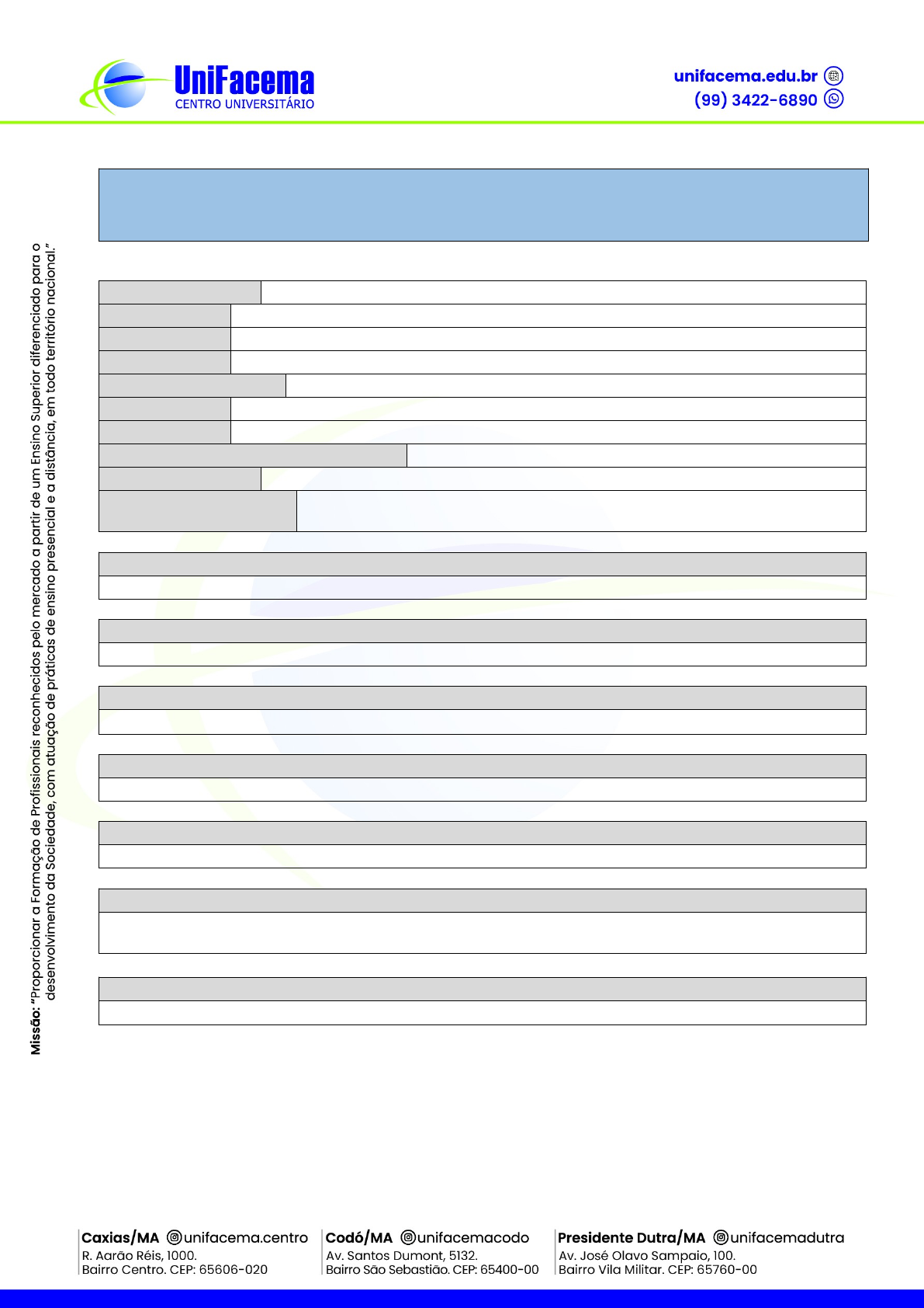 <p>ROTEIRO DE AULA PRÁTICA</p><p>UniFacema</p><p>CURSO/ CAMPUS:</p><p>ODONTOLOGIA</p><p>DISCIPLINA:</p><p>CIRURGIA ORAL MENOR</p><p>PROFESSOR:</p><p>Raimundo Neiva Júnior</p><p>PERÍODO:</p><p>5</p><p>QUANT. DE ALUNOS:</p><p>30</p><p>DATA:</p><p>14/10</p><p>HORÁRIO:</p><p>16:50</p><p>CARGA HORÁRIA DA AULA PRÁTICA:</p><p>2h</p><p>Nº DE PRÁTICAS:</p><p>2</p><p>LABORATÓRIO / CENÁRIO DE PRÁTICA:</p><p>SIMULAÇÃO ODONTOLÓGICA</p><p>CONTEÚDO DA AULA PRÁTICA (CONFORME PLANO DE ENSINO)</p><p>Aula teórica e demonstrativa de anestesia local</p><p>TEMA DA AULA PRÁTICA:</p><p>anestesia local</p><p>OBJETIVO(S):</p><p>· Demonstração prática de Anestesia local</p><p>METODOLOGIA DA AULA PRÁTICA</p><p>AULA PRÁTICA COM EXPOSIÇÃO DE TÉCNICAS ANESTÉSICAS</p><p>RECURSOS E MATERIAIS UTILIZADOS</p><p>Carpule estéril, campo estéril, luva cirúrgica</p><p>FORMA DE AVALIAÇÃO DA ATIVIDADE PRÁTICA REALIZADA PELO ALUNO</p><p>Participação, assiduidade, pertencimento da teoria sobre o conteúdo, proatividade na prática, portar todo o material solicitado, habilidade técnica.</p><p>OBSERVAÇÕES:</p><p>Caxias/MA, 02 de maio de 2024</p><p>___________________________________________</p><p>Professor da disciplina</p><p>___________________________________________</p><p>Coordenação do Curso</p><p>___________________________________________</p><p>Coordenação de Laboratórios</p><p>___________________________________________</p><p>Técnico de Laboratório</p><p>image1.jpg</p>