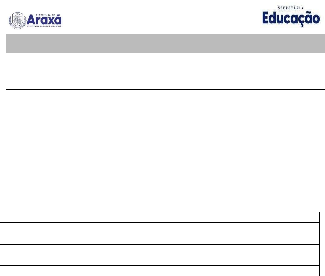 <p>PREFEITURA MUNICIPAL DE ARAXÁ</p><p>SECRETARIA MUNICIPAL DE EDUCAÇÃO</p><p>PLANO DE AULA</p><p>Professoras: Ana Loudes Barcelos</p><p>Kênia Chaline Borges</p><p>TURMA: 2º ANO A E 2º ANO B</p><p>Escola Municipal Professora Romália Porfirio de Azevedo Leite</p><p>PERÍODO: 21/10 Á 25/10</p><p>Atividades Permanente</p><p>· Acolhimento e Oração</p><p>· Leitura Deleite</p><p>· Banco de palavra e exploração.</p><p>· Leitura do ambiente alfabetizador (alfabeto, nomes dos alunos), fichas de com textos diversificados, quadro numérico e das formas geométricas.</p><p>· Preencher a ficha no caderno (data, nome da escola, nome completo do aluno)</p><p>· Data escrita no caderno. Observar e explorar o calendário (Dia, mês, ano).</p><p>· Perguntar aos alunos: Que dia é hoje? Que dia foi ontem? Amanhã será que dia?</p><p>· Identificar e contar as crianças quantidade de meninas, meninos e total de crianças.;</p><p>· Utilização do alfabeto movél e sílabas movéis Quadro de horário da Semana</p><p>HORÁRIO</p><p>SEGUNDA</p><p>TERÇA</p><p>QUARTA</p><p>QUINTA</p><p>SEXTA</p><p>1º</p><p>POR</p><p>MAT</p><p>PORT</p><p>MAT</p><p>POR</p><p>2º</p><p>ED.FIS</p><p>MAT</p><p>MAT</p><p>POR</p><p>MAT</p><p>3º</p><p>MAT</p><p>POR</p><p>GEO</p><p>POR</p><p>GEO</p><p>4º</p><p>CIE</p><p>HIST</p><p>GEO</p><p>CIEN</p><p>HIST</p><p>5º</p><p>ENS REL</p><p>HIST</p><p>ED FIS</p><p>CIEN</p><p>ART</p><p>1- Componente curricular: LÍNGUA PORTUGUESA / LITERATURA</p><p>2- Práticas de Linguagem/UnidadesTemáticas Leitura/escuta (compartilhada e autônoma) Análise linguística/ semiótica (alfabetização)</p><p>3- Objeto de Conhecimento</p><p>-Apreciação estética.</p><p>· Estilo.</p><p>· Conhecimento das diveras grafias do alfabeto.</p><p>· Acentuação.</p><p>· Formas de composição de textos poéticos.</p><p>4- Habilidades com o código alfanumérica</p><p>· (EF15LP17) Apreciar poemas visuais e concretos, observando efeitos de sentido criados pelo formato do texto na página, distribuição e diagramação das letras, pelas ilustrações e por outros efeitos visuais.´</p><p>· (EF12LP18) Apreciar poemas e outros textos versificados, observando rimas, sonoridades, jogos de palavras,</p><p>reconhecendo seu pertencimento ao mundo imaginário e sua dimensão de encantamento, jogo e fruição.</p><p>· (EF02LP07) Escrever palavras, frases, textos curtos nas formas imprensa e cursiva.</p><p>· (EF12LP19) Reconhecer, em textos versificados, rimas, sonoridades, jogos de palavras, palavras, expressões, comparações, relacionando-as com sensações e associações.</p><p>Recursos materiais: Listados em cada dia da semana</p><p>Sumarização: Sínteses da aula de forma oral</p><p>Avaliação: Diária (observações e correções dos cadernos).</p><p>Desenvolvimento</p><p>Segunda- feira, 21 de Outubro de 2024</p><p>· Atividades permanentes</p><p>· Leitura do poema: ‘’ O DIREITO DAS CRIANÇAS’’ – Ruth Rocha</p><p>· Interpretação de texto – Copiar e responder no caderno 1- Quantas estrofes tem no poema?</p><p>2- Quantos versos?</p><p>3- Qual o título do poema?</p><p>4- Qual o assunto do poema?</p><p>5- Circular as palavras que rimam da mesma cor.</p><p>6- Você gosta de ser criança? Justifique sua resposta.</p><p>· Correção no caderno e no quadro</p><p>Língua Portuguesa</p><p>Terça- feira, 22 de Outubro de 2024</p><p>· Atividades permanentes;</p><p>· Releitura do poema;</p><p>· Continuação interpretando o poema – Copiar no caderno: 1 – Retire do poema alguns direitos da criança</p><p>2- Complete de acordo com a segunda e a terceira estrofe do poema</p><p>· Diagrama com alguns direitos garantidos a todas as crianças</p><p>· Crias frases com os direitos encontrados no diagrama.</p><p>· Sortear algumas crianças para escrever uma frase no quadro.</p><p>Quarta- feira, 23 de Outubro de 2024</p><p>· Atividades permanentes;</p><p>· Releitura do poema;</p><p>· Atividade no caderno: Escolher uma estrofe do poema ‘’ O Direito das crianças’’, copie e depois faça um desenho para ilustrá-lo.</p><p>· Com base no poema, preencha corretamente:</p><p>Quinta-feira, 24 de Outubro de 2024</p><p>· Atividades permanentes;</p><p>· Confecção árvore dos direitos das crianças com carimbo das mãos.</p><p>· Expor a atividade no mural da escola.</p><p>· No caderno separar em sílaba as palavras escritas na confecção da árvore.</p><p>· Atividades permanentes;</p><p>Sexta-feira, 25 de Outubro de 2024</p><p>· Atividade avaliativa da semana – Produção de texto.</p><p>· Relembrando brincadeiras antigas: Passa Anel, Pato Ganso, Morto-Vivo... no pátio da escola.</p><p>2-Componente curricular: MATEMÁTICA</p><p>1-Práticas de Linguagem/Unidades Temáticas</p><p>Grandezas e medidas Números</p><p>3- Objeto de Conhecimento (conteúdo)</p><p>· Medidas de tempo: intervalo de tempo, uso do calendário, leitura de horas em relógios digitais e ordenação de datas.</p><p>· Sistema monetário brasileiro: reconhecimento de cédulas e moedas e equivalência de valores.</p><p>4- Habilidades com o código alfanumérico</p><p>· (EF02MA39MG) Reconhecer unidades de medidas de tempo (ano, mês, quinzena, semana, dia, horas) e conversões entre elas.</p><p>· (EF02MA41MG) Identificar quantidade de dinheiro em cédulas e moedas do sistema Monetário Brasileiro.</p><p>· (EF02MA20) Estabelecer a equivalência de valores entre moedas e cédulas do sistema monetário brasileiro para resolver situações cotidianas.</p><p>Recursos materiais: Listados em cada dia da semana</p><p>Sumarização: Sínteses da aula de forma oral</p><p>Avaliação: Diária (observações e correções dos cadernos).</p><p>Segunda-feira, 21 de Outubro de 2024</p><p>· Leitura do ambiente alfabetizador;</p><p>· Iniciar a aula informando para os alunos que iremos estudar sobre o calendário. Explicar que o calendário serve para marcar o tempo. Perguntar em quais meses as crianças fazem anivers