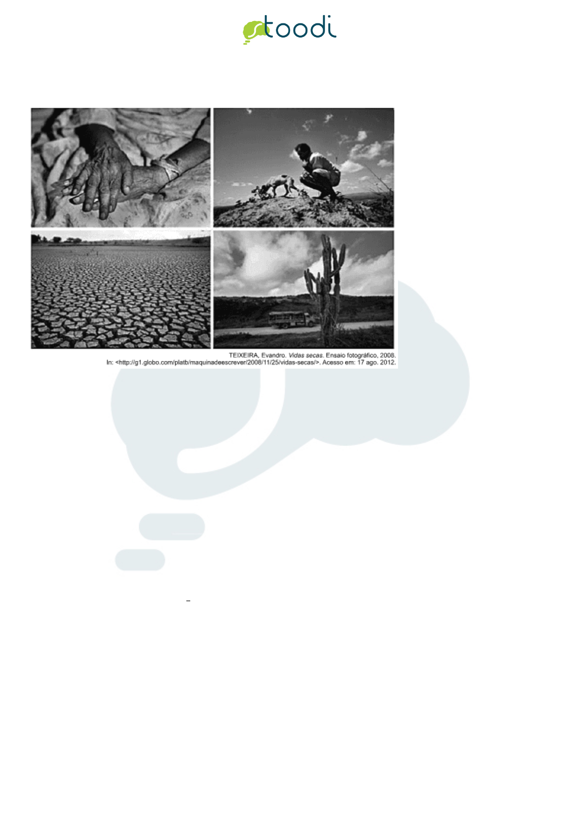 <p>Página 1</p><p>Copyright (c) 2013 - 2018 Stoodi Ensino e Treinamento a Distância LTDA - EPP - Todos os direitos reservados</p><p>1. UEG 2013</p><p>Observe as imagens.</p><p>Em 2008, foi realizada uma homenagem a Graciliano Ramos pelos setenta anos de criação de Vidas Secas. O fotógrafo Evandro</p><p>Teixeira realizou um ensaio com locação nos lugares de origem dos personagens criados pelo escritor alagoano.</p><p>A produção incluiu atores com características físicas semelhantes às dos personagens do romance. O olhar poético do fotógrafo</p><p>ainda registrou imagens que nos comunicam as condições dos migrantes, como</p><p>a. a alegria pelo abandono da terra e de suas tradições.</p><p>b. a felicidade alcançada pelo sucesso da mudança.</p><p>c. a aridez da pele das mãos semelhante à dureza do solo.</p><p>d. o vigor da vida florescendo nas terras do agreste nordestino.</p><p>2. IBMECRJ 2009</p><p>O texto a seguir foi retirado da obra de Graciliano Ramos, Vidas Secas. Esse romance completou, em agosto de 2008, 70 anos de</p><p>sua primeira publicação. É narrado em 3a pessoa (ao contrário das obras anteriores de Graciliano) e pertence a um gênero</p><p>intermediário entre romance e livro de contos.</p><p>Fabiano, uma coisa da fazenda, 1um triste, seria despedido quando menos esperasse. Ao ser contratado, recebera o cavalo de</p><p>fábrica, peneiras, gibão, guarda-peito e sapatões 3de couro, mas ao sair largaria tudo ao vaqueiro 7que o substituísse.</p><p>Sinhá Vitória desejava possuir uma cama igual à de seu Tomás da bolandeira. Doidice.</p><p>Não dizia nada para não contrariá-la, mas sabia que era doidice. Cambembes podiam ter luxo? E estavam ali de passagem.</p><p>Qualquer dia o patrão os botaria fora, e eles ganhariam o mundo, sem rumo, nem teria meio de conduzir os cacarecos. Viviam</p><p>de trouxa amarrada, dormiriam bem debaixo de um pau.</p><p>Olhou a caatinga 4amarela, 5que o poente avermelhava. Se a seca chegasse, não ficaria planta 2verde. Arrepiou-se. Chegaria,</p><p>naturalmente. Sempre tinha sido assim, desde que ele se entendera.</p><p>E antes de se entender, antes de nascer, 8sucedera o mesmo - anos bons, misturados com anos ruins. A desgraça estava em</p><p>caminho, talvez andasse perto. Nem valia a pena trabalhar. Ele marchando para casa, trepando a ladeira, espalhando 6seixos 9com</p><p>as alpercatas - ela se avizinhando 10a galope, com vontade de matá-lo.</p><p>Página 2</p><p>Copyright (c) 2013 - 2018 Stoodi Ensino e Treinamento a Distância LTDA - EPP - Todos os direitos reservados</p><p>(Vidas Secas - Graciliano Ramos)</p><p>Pode-se dizer do romance, "Vidas Secas", de onde o texto foi retirado, que é uma grande obra:</p><p>a. Pelo tratamento que dá aos conflitos de terra do país.</p><p>b. Pois trata da coisificação das relações humanas e da autodestruição.</p><p>c. Pelo poder de fixar figuras humanas vivendo sobre o fatalismo das secas da região nordeste.</p><p>d. Pois retrata a riqueza da natureza no interior do Brasil.</p><p>e. Pois enaltece a importância da atividade agrícola para as populações rurais.</p><p>3. UFMG 2003</p><p>Com base na leitura de "Vidas secas", é CORRETO afirmar que,</p><p>a. no início, as personagens passam fome e, no final, sofrem com o frio.</p><p>b. no início, predomina a desgraça da seca e, no final, a desgraça da estação chuvosa.</p><p>c. no início, a família está em fuga e, no final, a mesma situação se repete.</p><p>d. no início, a família se encontra íntegra e, no final, se mostra desfeita.</p><p>4. UFMG 2003</p><p>Com base na leitura de "Vidas secas", de Graciliano Ramos, é INCORRETO afirmar que essa obra</p><p>a. tem uma dimensão psicológica importante, embora retrate, com vigor, a realidade exterior.</p><p>b. tem uma linguagem rude e seca, refletindo, assim, o universo das personagens retratadas.</p><p>c. representa um mundo em que as forças sociais são secundárias, não determinando o destino das personagens.</p><p>d. retrata a sujeição das personagens às condições impostas pelo meio natural em que vivem.</p><p>5. UFRRJ 2003</p><p>Leia o fragmento abaixo, retirado do romance "Vidas secas":</p><p>... Na palma da mão as notas estavam úmidas de suor. Desejava saber o tamanho da extorsão. Da última vez que fizera contas com</p><p>o amo o prejuízo parecia menor. Alarmou-se. Ouvira falar em juros e em prazos. Isto lhe dera uma impressão bastante penosa:</p><p>sempre que os homens sabidos lhe diziam palavras difíceis, ele saía logrado. Sobressaltava-se escutando-as. Evidentemente só</p><p>serviam para encobrir ladroeiras. Mas eram bonitas. Às vezes decorava algumas e empregava-as fora de propósito. Depois</p><p>esquecia-as. Para que um pobre da laia dele usar conversa de gente rica? Sinhá Terta é que tinha uma ponta de língua terrível. Era:</p><p>falava tão bem quanto as pessoas da cidade. Se ele soubesse falar como Sinhá Terta, procuraria serviço em outra fazenda, haveria</p><p>de arranjar-se. Não sabia. Nas horas de aperto dava para gaguejar, embaraçava-se como um menino, coçava os cotovelos,</p><p>aperreado. Por isso esfolavam-no. Safados. Tomar as coisas de um infeliz que não tinha nem onde cair morto! Não viam que isso não</p><p>estava certo? Que iam ganhar com semelhante procedimento? Hem? Que iam ganhar? ...</p><p>RAMOS, Graciliano. "Vidas secas". 37a ed. Rio de Janeiro: Record, 1977. p.103.</p><p>Graciliano Ramos apresenta em suas obras problemas do Nordeste do Brasil e, ao mesmo tempo, desenvolve um trabalho universal</p><p>por apresentar uma visão crítica das relações humanas. A partir do trecho acima, pode-se afirmar que o autor</p><p>a. denuncia a opressão social realizada através do abuso de poder político, que está representado na fala de Fabiano.</p><p>Página 3</p><p>Copyright (c) 2013 - 2018 Stoodi Ensino e Treinamento a Distância LTDA - EPP - Todos os direitos reservados</p><p>b. critica o trabalhador rural 