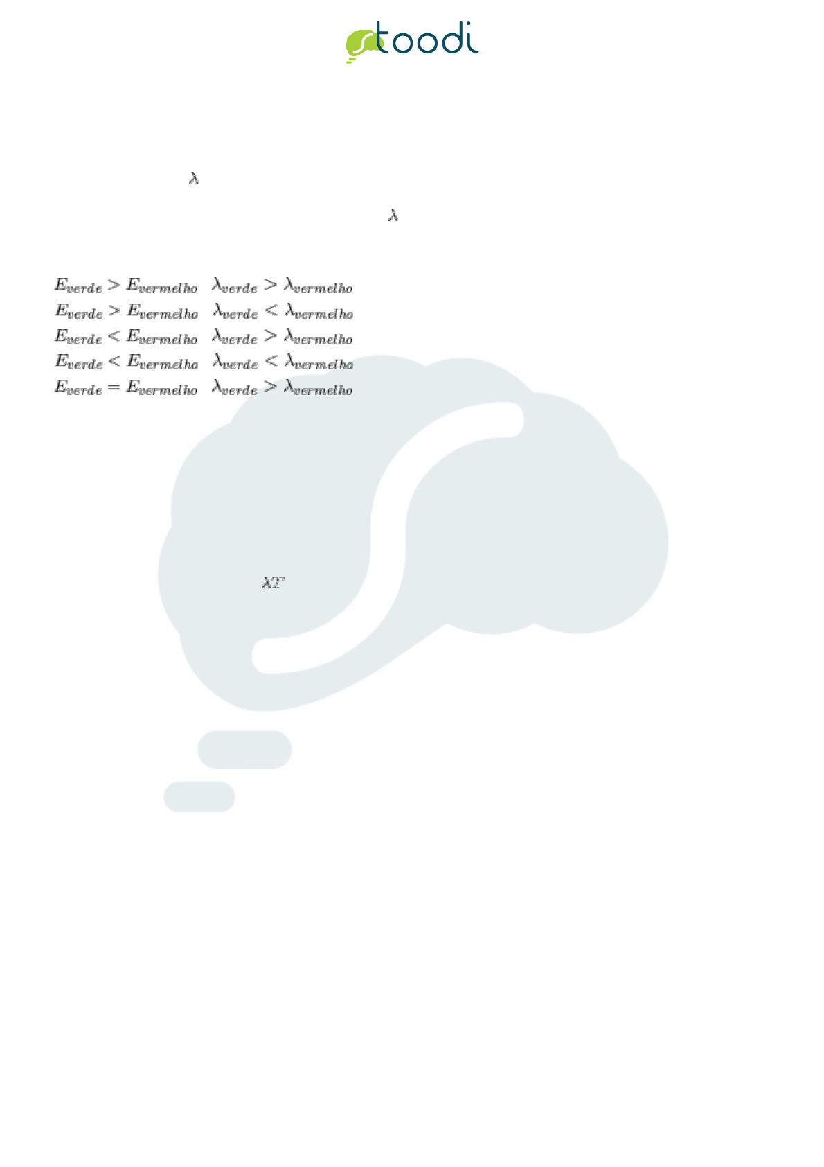 <p>Página 1</p><p>Copyright (c) 2013 - 2018 Stoodi Ensino e Treinamento a Distância LTDA - EPP - Todos os direitos reservados</p><p>1. UFMG 2007</p><p>Nos diodos emissores de luz, conhecidos como LEDs, a emissão de luz ocorre quando elétrons passam de um nível de maior energia</p><p>para um outro de menor energia.</p><p>Dois tipos comuns de LEDs são o que emite luz vermelha e o que emite luz verde. Sabe-se que a frequência da luz vermelha é menor</p><p>que a da luz verde. Sejam verde o comprimento de onda da luz emitida pelo LED verde e Everde a diferença de energia entre os</p><p>níveis desse mesmo LED.</p><p>Para o LED vermelho, essas grandezas são, respectivamente, vermelho e Evermelho.</p><p>Considerando-se essas informações, é CORRETO afirmar que</p><p>a. e</p><p>b. e</p><p>c. e</p><p>d. e</p><p>e. e</p><p>2. UPE 2017</p><p>Um corpo negro tem um pico de emissão em uma temperatura cujo comprimento de onda de sua radiação vale 9000 Â. Nessa</p><p>temperatura, a radiação que emerge desse corpo não produz efeito fotoelétrico em uma placa metálica. Aumentando a temperatura</p><p>do corpo negro, sua radiação emitida aumenta 81 vezes, causando efeito fotoelétrico na placa para o comprimento de onda de pico</p><p>dessa nova temperatura. A energia necessária para frear esses fotoelétrons emitidos é equivalente à diferença de energia dos níveis</p><p>n=2 e n=3 do átomo de hidrogênio de Bohr. Sabendo-se que a Lei de Wien relaciona o comprimento de onda de pico de emissão com</p><p>a temperatura do corpo negro na forma =constante, é CORRETO afirmar que a função trabalho do metal vale aproximadamente</p><p>Dados: energia do átomo de hidrogênio de Bohr no estado fundamental = -13,6 e V, constante de Planck = 4,14 x 10-15 eVs, o módulo</p><p>da velocidade da luz como c=3,0x108 m/s e 1 e V = 1,6 x 10-19 J</p><p>a. 1,15 eV</p><p>b. 2,25 eV</p><p>c. 4,50 eV</p><p>d. 7,25 eV</p><p>e. 10,75 eV</p><p>3. EPCAR (AFA) 2013</p><p>(Adaptado) O elétron do átomo de hidrogênio, ao passar do primeiro estado estacionário excitado, n=2, para o estado fundamental,</p><p>n=1,emite um fóton.</p><p>Tendo em vista o diagrama da figura abaixo, que apresenta, de maneira aproximada, os comprimentos de onda das diversas</p><p>radiações, componentes do espectro eletromagnético, pode-se concluir que o comprimento de onda desse fóton emitido corresponde</p><p>a uma radiação na região do(s)</p><p>Página 2</p><p>Copyright (c) 2013 - 2018 Stoodi Ensino e Treinamento a Distância LTDA - EPP - Todos os direitos reservados</p><p>Dados:</p><p>Constante de Planck h = 4,1.10-15 eV.s</p><p>Velocidade da luz c = 3.108 m/s</p><p>a. raios gama</p><p>b. raios X</p><p>c. ultravioleta</p><p>d. luz visível</p><p>e. infravermelho</p><p>4. EPCAR (AFA) 2015</p><p>O diagrama a seguir mostra os níveis de energia permitidos para elétrons de um certo elemento químico.</p><p>Durante a emissão de radiação por este elemento, são observados três comprimentos de onda: e . Sabendo-se que</p><p>, pode-se afirmar que é igual a</p><p>a.</p><p>b.</p><p>c.</p><p>d.</p><p>5. EPCAR (AFA) 2016</p><p>O diagrama abaixo ilustra os níveis de energia ocupados por elétrons de um elemento químico A.</p><p>Página 3</p><p>Copyright (c) 2013 - 2018 Stoodi Ensino e Treinamento a Distância LTDA - EPP - Todos os direitos reservados</p><p>Dentro das possibilidades apresentadas nas alternativas abaixo, a energia que poderia restar a um elétron com energia de 12,0 eV,</p><p>após colidir com um átomo de A, seria de, em eV,</p><p>a. 0</p><p>b. 1,0</p><p>c. 5,0</p><p>d. 5,4</p><p>6. Stoodi</p><p>A energia que um elétron, em um átomo de hidrogênio, possui, em seu enésimo estado (nível de energia = n), é dada por</p><p>onde eV (elétron-volt) é uma unidade de medida de energia muito utilizada em Física Moderna, para que os</p><p>cálculos sejam facilitados. Um átomo de hidrogênio possui um elétron que é excitado, a partir do estado fundamental, para o seu</p><p>terceiro estado excitado. A energia que deve ser fornecida para este elétron, para que esse processo ocorra, deve ser de</p><p>a. 13,60 eV.</p><p>b. 0,850 eV.</p><p>c. 3,400 eV.</p><p>d. 14,45 eV.</p><p>e. 12,75 eV.</p><p>7. UPE 2014</p><p>Se um elétron move-se de um nível de energia para outro mais afastado do núcleo do mesmo átomo, é CORRETO afirmar que,</p><p>segundo Bohr,</p><p>a. há emissão de energia.</p><p>b. há absorção de energia.</p><p>c. o número atômico varia.</p><p>d. há emissão de luz de um determinado comprimento de onda.</p><p>e. não há variação de energia.</p><p>8. Stoodi</p><p>Página 4</p><p>Copyright (c) 2013 - 2018 Stoodi Ensino e Treinamento a Distância LTDA - EPP - Todos os direitos reservados</p><p>Um fóton de luz é absorvido por um elétron do átomo de hidrogênio que salta do nível de energia n = 1 para o nível n = 5. Utilizando o</p><p>modelo de Bohr e sabendo que a constante de Planck é h = 4.1015 eV.s, então a energia do fóton absorvido, em eV, é de:</p><p>Adote: Energia do elétron no estado quântico n En = -13,6/n²</p><p>a. 9,725</p><p>b. 10,880</p><p>c. 11,212</p><p>d. 12,457</p><p>e. 13,056</p><p>9. UFMG</p><p>Para se produzirem fogos de artifício de diferentes cores, misturam-se diferentes compostos químicos à pólvora. Os compostos à</p><p>base de sódio produzem luz amarela e os à base de bário, luz verde. Sabe-se que a frequência da luz amarela é menor que a da</p><p>verde. Sejam ENa e EBa as diferenças de energia entre os níveis de energia envolvidos na emissão de luz pelos átomos de sódio e de</p><p>bário, respectivamente, e vNa e vBa as velocidades dos fótons emitidos, também respectivamente. Assim sendo, é CORRETO afirmar</p><p>que:</p><p>a. e</p><p>b. e</p><p>c. e</p><p>d. e</p><p>e. e</p><p>10. UNESP 2013</p><p>Leia</p><p>Cor da chama depende do elemento queimado</p><p>Por que a cor do fogo varia de um material para outro?</p><p>A cor depende basicamente 