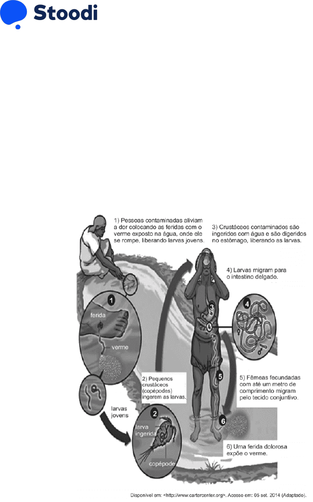 <p>Página 1</p><p>Copyright (c) 2013 - 2020 Stoodi Ensino e Treinamento a Distância S.A. - Todos os direitos reservados</p><p>1. UPE 2014</p><p>Leia o texto a seguir</p><p>A elevada prevalência de parasitos intestinais nos países</p><p>subdesenvolvidos se deve, principalmente, às precárias</p><p>condições de saneamento básico e ao baixo nível de</p><p>escolaridade da população. Num estudo realizado com 200</p><p>escolares da periferia de Salvador (BA), os pesquisadores</p><p>identificaram cinco parasitos com maior frequência. São</p><p>eles: Entamoeba coli (43,5%), Ascaris Iumbricoides (25%),</p><p>Endolimax nana (22%), Entamoeba histolytica/E. dispari</p><p>(21,5°/a) e Giardia duodenalis (12,0%). O resultado apontou</p><p>para a necessidade de implantação de programas de</p><p>educação em saúde para a prevenção de infecções</p><p>parasitárias e para a adoção de medidas que melhorem o</p><p>estado nutricional das crianças.</p><p>Disponível em:</p><p>http://ww.revistas.ufg.br/index.php/iptsp/article/download/16762/10208.</p><p>Adaptado.</p><p>Sobre os parasitas mencionados no texto, observe a</p><p>sequência a seguir que representa o seu Ciclo de Vida.</p><p>1. Ingerir água ou alimento contaminado.</p><p>2. Haver liberação dos ovos no intestino delgado.</p><p>3. As larvas penetram no revestimento intestinal e caem na</p><p>corrente sanguínea, atingindo figado, coração e pulmões,</p><p>onde sofrem algumas mudanças de cutícula e aumentam o</p><p>tamanho.</p><p>4. As larvas permanecem nos alvéolos pulmonares, podendo</p><p>causar sintomas semelhantes de pneumonia.</p><p>5. Ao abandonar os alvéolos, as larvas passam para os</p><p>brônquios, a traqueia, laringe e faringe.</p><p>6. Em seguida, as larvas são deglutidas e atingem o intestino</p><p>delgado, no qual crescem e se transformam em vermes</p><p>adultos.</p><p>7. Após o acasalamento, a fêmea inicia a liberação dos ovos.</p><p>8. Os ovos são eliminados com as fezes. Dentro de cada</p><p>ovo, ocorre o desenvolvimento de um embrião que, após</p><p>algum tempo, origina uma larva.</p><p>9. Ovos contidos nas fezes contaminam a água de consumo</p><p>e os alimentos utilizados pelo ser humano.</p><p>É CORRETO afirmar que o ciclo de vida acima pertence,</p><p>exclusivamente, a:</p><p>a. Entamoeba coli.</p><p>b. Ascaris Iumbricoides.</p><p>c. Entamoeba histolytica/E. díspar.</p><p>d. Endolimax nana.</p><p>e. Giardia duodenalis.</p><p>2. G1 - CFTMG 2015</p><p>Analise o ciclo do nematódeo Dracunculus medinensis,</p><p>causador da dracunculíase em Guiné, na África, cujos casos</p><p>têm-se reduzido drasticamente.</p><p>A estratégia que vem permitindo essa diminuição de casos</p><p>da doença é a</p><p>a. descontaminação dos cursos d’água poluídos.</p><p>b. vacinação em massa nas regiões contaminadas.</p><p>c. implantação do saneamento básico nas áreas de risco.</p><p>d. construção de aterro sanitário nos municípios afetados.</p><p>3. MACKENZIE 1996</p><p>Conforme o ciclo evolutivo, os parasitas são classificados em</p><p>monogenéticos e digenéticos. No primeiro caso, quando seu</p><p>ciclo se passa num único hospedeiro e no segundo caso,</p><p>Página 2</p><p>Copyright (c) 2013 - 2020 Stoodi Ensino e Treinamento a Distância S.A. - Todos os direitos reservados</p><p>quando se desenvolve em dois hospedeiros, o intermediário</p><p>e o definitivo.</p><p>Um parasita considerado monogenético é:</p><p>a. Ascaris Iumbricoides.</p><p>b. Taenia sollium.</p><p>c. Trypanosoma cruzi.</p><p>d. Leishmania brasiliensis.</p><p>e. Wuchereria bancrofti.</p><p>4. UNIRIO 1996</p><p>A elefantíase, ou filariose, e uma parasitose comum na</p><p>região amazônica. Sua profilaxia pode ser feita através do</p><p>combate ao inseto vetor e do isolamento e tratamento das</p><p>pessoas doentes. O agente causador e o hospedeiro</p><p>intermediário dessa parasitose são, respectivamente:</p><p>a. 'Ascaris Iumbricoides' e um mosquito do gênero Culex.</p><p>b. 'Wuchereria bancrofti' e um mosquito do gênero Culex.</p><p>c. 'Wuchereria bancrofti' e o caramujo.</p><p>d. 'Schistosoma mansoni' e a filária.</p><p>e. 'Ancylostoma duodenale' e a filária.</p><p>5. UNIRIO 1999</p><p>Analise as informações abaixo sobre as características de</p><p>uma verminose.</p><p>I - O parasita se apresenta no interior dos vasos linfáticos da</p><p>pessoa infestada.</p><p>II - O hospedeiro intermediário pertence ao filo dos</p><p>Artrópodes.</p><p>III - Geralmente acarreta um derrame de linfa nos tecidos,</p><p>provocando uma inchação.</p><p>Tais características são pertinentes a:</p><p>a. leishmaniose.</p><p>b. filariose.</p><p>c. ancilostomose.</p><p>d. esquistossomose.</p><p>e. ascaridiose.</p><p>6. MACKENZIE 2010</p><p>As verminoses representam um grande problema de saúde,</p><p>principalmente nos países subdesenvolvidos. A falta de</p><p>redes de água e de esgoto, de campanhas de</p><p>esclarecimento público, de higiene pessoal e de programas</p><p>de combate aos transmissores, leva ao aparecimento de</p><p>milhares de novos casos na população brasileira.</p><p>Dentre as verminoses humanas causadas por nemátodos,</p><p>citam-se, corretamente:</p><p>a. teníase, ascaridíase e anciIostomose.</p><p>b. filariose, anciIostomose e ascaridíase.</p><p>c. esquistossomose, ascaridíase e anciIostomose.</p><p>d. esquistossomose, filariose e oxiurose.</p><p>e. teníase, filariose e esquistossomose.</p><p>7. UEL 2005</p><p>Nematódeos são animais vermiformes de vida livre ou</p><p>parasitária, encontrados em plantas e animais, inclusive no</p><p>homem. Sobre as características presentes em nematódeos,</p><p>considere as afirmativas a seguir.</p><p>I. Corpo não segmentado coberto por cutícula.</p><p>II. Trato digestório completo.</p><p>III. Órgãos especializados para circulação.</p><p>IV. Pseudoceloma.</p><p>Estão corretas apenas as afirmativas:</p><p>a. I e III.</p><p>b. I e IV.</p><p>c. Il e 