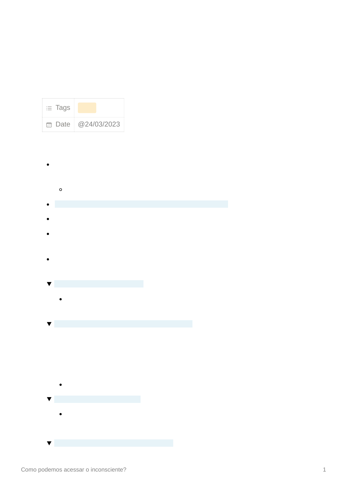 <p>Como podemos acessar o inconsciente? 1</p><p>Como podemos acessar o</p><p>inconsciente?</p><p>Tags PSI</p><p>Date</p><p>Ato falho/ Parapraxia</p><p>Capacidade que tem a mente humana de esquecer ou mais precisamente de</p><p>reprimir</p><p>Ex.: esquecimentos e substituições.</p><p>“Um lapso verbal delata o verdadeiro estado da mente.”</p><p>Falha na repressão total de algum pensamento ou desejo inconsciente.</p><p>São na maioria das vezes, a consequência direta da repressão, um dos</p><p>mecanismos de defesa do ego.</p><p>Só se pode descobrir através da técnica psicanalítica, com a inteira cooperação</p><p>do paciente.</p><p>Esquecimento do dia-a-dia</p><p>Esquecimento de algo que o individuo iria fazer em casa. Sai de um cômodo</p><p>e vai pra outro e esquece o que ia fazer.</p><p>Esquecimentos de Situações traumáticas</p><p>“Esqueci de dizer que quando era adolescente, deveria ter uns 12 anos, sofri</p><p>um abuso sexual e tenha esquecido tão bem que hoje com 52, me escutei aqui</p><p>falando pra você sobre relacionamentos, que não consigo manter um</p><p>relacionamento por muito tempo, que sou ciumenta e não confio nos homens.”</p><p>Será que tem relação com o passado?</p><p>Esquecimento sem razão.</p><p>“Esqueci de pagar a mensalidade do meu filho.”</p><p>Por que alguém esqueceria algo que não há razão para esquecer?</p><p>Esquecimento dos nomes próprios</p><p>@24/03/2023</p><p>Como podemos acessar o inconsciente? 2</p><p>O nome ou nomes substitutos se ligam ao nome perdido</p><p>Engano?</p><p>Falta de atenção?</p><p>Não não, foram apenas condições necessárias para esquecer um nome,</p><p>quando acompanhado de ilusão de memória.</p><p>Também pode acontecer quando temos certa predisposição para esquecer</p><p>o nome.</p><p>Sabendo de tudo isso, a razão, motivo, impulso, intenção, existe, más é</p><p>inconsciente em todos os exemplos dados.</p><p>Geralmente só se pode descobrir através da teoria psicanalítica, isto é com a</p><p>inteira cooperação da pessoa que esqueceu.</p><p>Por mais claro que possa parecer, a interpretação de um lapso e seu significado</p><p>inconsciente nunca poderá ser mais do que uma conjectura enquanto não for</p><p>confirmada pelas associações do próprio indivíduo.</p><p>Chistes</p><p>Fenômeno comum da vida cotidiana.</p><p>Freud apresentou uma teoria que explicava as origens da energia psíquica que</p><p>se descarrega pelo riso, sempre que a piada é “boa”.</p><p>Um tipo de rebelião, descarga da energia psíquica, alivio da pressão.</p><p>É primordialmente um fenômeno verbal. É sinônimo de trocadilho, calúnia, fazer</p><p>“graça” ou piada.</p><p>Temos uma tendência a repeti-lo, em busca de repetir o prazer ou a satisfação</p><p>que ele gerou originalmente.</p><p>Pode atuar também como forma de driblar a repressão, regras morais ou</p><p>proibições.</p>
