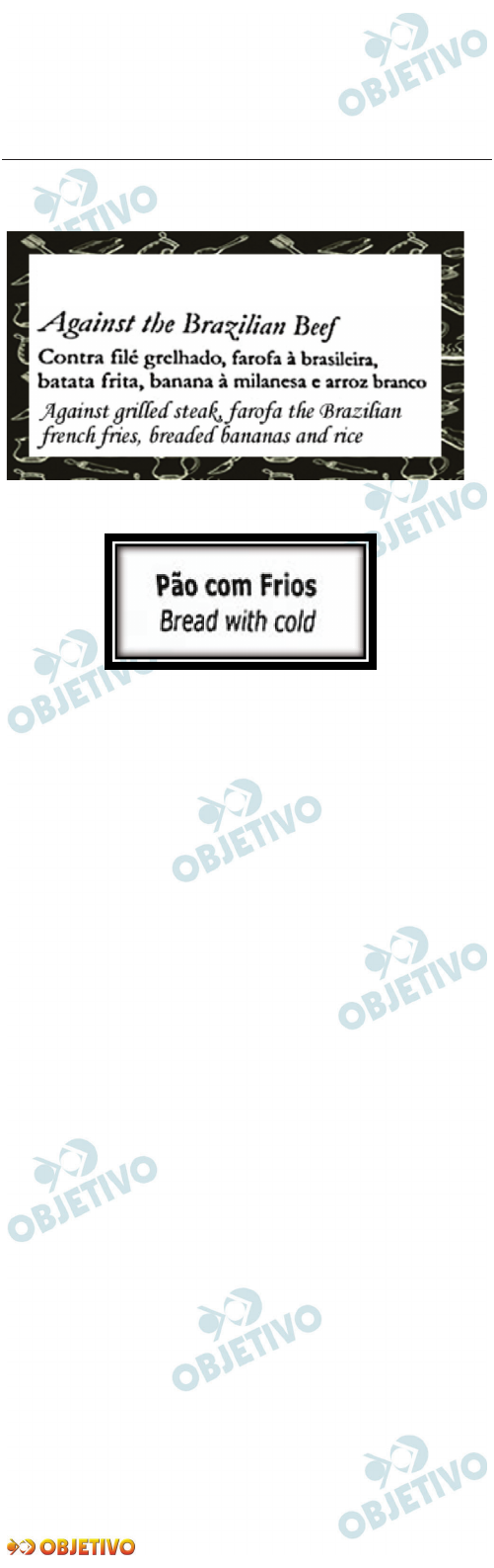 <p>PROVA Z</p><p>1</p><p>(Adaptado de 16 Traduções hilárias de placas e avisos em inglês</p><p>feitos para a copa. Mega Curioso, 07/06/2014. Disponível em</p><p>http://www.megacurioso.com.br/copa-do-mundo-2014/44531-16-</p><p>traducoes-hilarias-de-placas-e-avisos-em-ingles-feitos-para-</p><p>acopa.htm. Acessado em 10/07/2017.)</p><p>Entre as inadequações no uso do inglês observadas nas</p><p>figuras 1 e 2, podemos citar:</p><p>a) erros no emprego dos tempos verbais em inglês.</p><p>b) equívoco quanto à classe gramatical de certas palavras.</p><p>c) desconhecimento das diferenças entre inglês oral e</p><p>escrito</p><p>d) erros de tradução causados por falsos cognatos.</p><p>Resolução</p><p>Entre as inadequações no uso do inglês observadas nas</p><p>figuras, podemos citar equívoco quanto à classe</p><p>gramatical de certas palavras.</p><p>No contexto das figuras:</p><p>• figura 1 – contrafilé = substantivo e against = prepo -</p><p>sição</p><p>• figura 2 – frios = substantivo e cold = adjetivo</p><p>Resposta: BB</p><p>FIGURA 1</p><p>FIGURA 2</p><p>P</p><p>ro</p><p>je</p><p>ta</p><p>d</p><p>o</p><p>p</p><p>o</p><p>r</p><p>T</p><p>im</p><p>m</p><p>d</p><p>e</p><p>si</p><p>g</p><p>n</p><p>-</p><p>F</p><p>re</p><p>e</p><p>p</p><p>ik</p><p>.c</p><p>o</p><p>m</p><p>Contrafilé à brasileira</p><p>UUNNIICCAAMMPP -- 11ªª FFAASSEE -- NNOOVVEEMMBBRROO//22001177</p><p>2</p><p>Elderly flight passenger throws coins into engine for</p><p>‘luck’, delays take-off for hours China Southern Airlines</p><p>Flight 380 was held up at the Shanghai Pudong</p><p>International Airport after an elderly woman passenger</p><p>caused a disruption, according to the airline’s official</p><p>WeChat account. An investigation into the incident is</p><p>under way.</p><p>Passengers boarding the flight reportedly saw an elderly</p><p>woman throwing coins at the engine for “blessings” from</p><p>the middle of the boarding staircase and alerted the crew.</p><p>Ground staff said the woman, who appeared to be about</p><p>80 and had limited mobility, was accompanied by her</p><p>husband, daughter and son-in-law.</p><p>The captain was quoted as saying the metal, if sucked up</p><p>by the engine, could have caused serious damage,</p><p>including failure.</p><p>The flight was later given a green light and took off at</p><p>5.52pm, more than five hours late. It is scheduled to arrive</p><p>in Guangzhou at 8.14pm.</p><p>(Adaptado de Sarah Zheng, Elderly flight passenger throws coins</p><p>into engine for ‘luck’, delays take-off for hours. South China</p><p>Morning Post, 27/06/2017. Disponível em</p><p>http://www.scmp.com/news/china/society/article/2100242/elderlyfli</p><p>ght-passenger-throws-coins-engine-luck-delays-take. Acessado em</p><p>10/07/2017.)</p><p>O que é correto afirmar sobre o incidente relatado na</p><p>notícia anterior?</p><p>a) Por causa do incidente, o avião chegou a seu destino</p><p>com cinco horas de atraso, às 17h52.</p><p>b) Segundo o piloto, moedas atiradas na turbina do avião</p><p>causaram sérios danos à aeronave.</p><p>c) Uma idosa chinesa, seu marido, sua filha e seu genro</p><p>quase provocaram um acidente aéreo.</p><p>d) A ação de alguns passageiros evitou o risco de um</p><p>grave acidente aéreo.</p><p>Resolução</p><p>Lê-se a afirmação no seguinte trecho do texto:</p><p>“... Passengers boarding the flight reportedly saw an</p><p>elderly woman throwing coins at the engine for</p><p>“blessings” from the middle of the boarding staircase</p><p>and alerted the crew.”</p><p>Resposta: DD</p><p>EENNEEMM -- NNOOVVEEMMBBRROO//22001177</p><p>3</p><p>Os panfletos acima foram distribuídos na entrada de uma</p><p>assembleia de estudantes universitários, reunidos para</p><p>discutir um pedido de reforma nos banheiros do campus.</p><p>Assinale a opção correta.</p><p>a) O panfleto (A) defende, de maneira irônica, a criação</p><p>de mais banheiros públicos unissex.</p><p>b) O panfleto (B) recomenda bater na porta ou avisar</p><p>verbalmente antes de entrar em um banheiro unissex.</p><p>c) O panfleto (A) critica pessoas que se preocupam</p><p>excessivamente com questões de assédio sexual.</p><p>d) O panfleto (B) argumenta a favor de banheiros unissex</p><p>ao expor um dilema de pessoas transgênero.</p><p>Resolução</p><p>Uma pessoa supostamente transgênero teria proble -</p><p>mas ao entrar em um banheiro feminino ou em um</p><p>banheiro masculino.</p><p>Resposta: DD</p><p>(A) (B)</p><p>(Adaptado de https://i0.wp.com/</p><p>www.davescomputertips.com/</p><p>wpcontent/uploads/2014/10/gende</p><p>r-neutral_restroom.png. Acessado</p><p>em 10/07/2017.)</p><p>(Adaptado de http://</p><p>cougarnews. org/7469/student-</p><p>life/time-for-changegender-</p><p>neutral-bathrooms/. Acessado</p><p>em 10/07/2017.)</p><p>EENNEEMM -- NNOOVVEEMMBBRROO//22001177</p><p>4</p><p>ZOMBIE NEUROSCIENCE</p><p>I don’t know if cockroaches dream, but I imagine if they</p><p>do, jewel wasps feature prominently in their nightmares.</p><p>These small, solitary tropical wasps are of little concern</p><p>to us humans; after all, they don’t manipulate our minds</p><p>so that they can serve us up as willing, living meals to</p><p>their newborns, as they do to unsuspecting cockroaches.</p><p>The story is simple, if grotesque: the female wasp controls</p><p>the minds of the cockroaches she feeds to her offspring,</p><p>taking away their sense of fear or will to escape their fate.</p><p>What turns a once healthy cockroach into a mindless</p><p>zombie it’s venom. Not just any venom, either: a specific</p><p>venom that acts like a drug, targeting the cockroach’s</p><p>brain.</p><p>(Adaptado de Christie Wilcox, Zombie Neuroscience. Scientific</p><p>American, New York, v. 315, n. 2, p. 70–73, 2016.)</p><p>De acordo com o autor,</p><p>a) certas baratas conseguem escapar de ataques de vespas</p><p>comportando-se como zumbis.</p><p>b) baratas são capazes de ações predatór