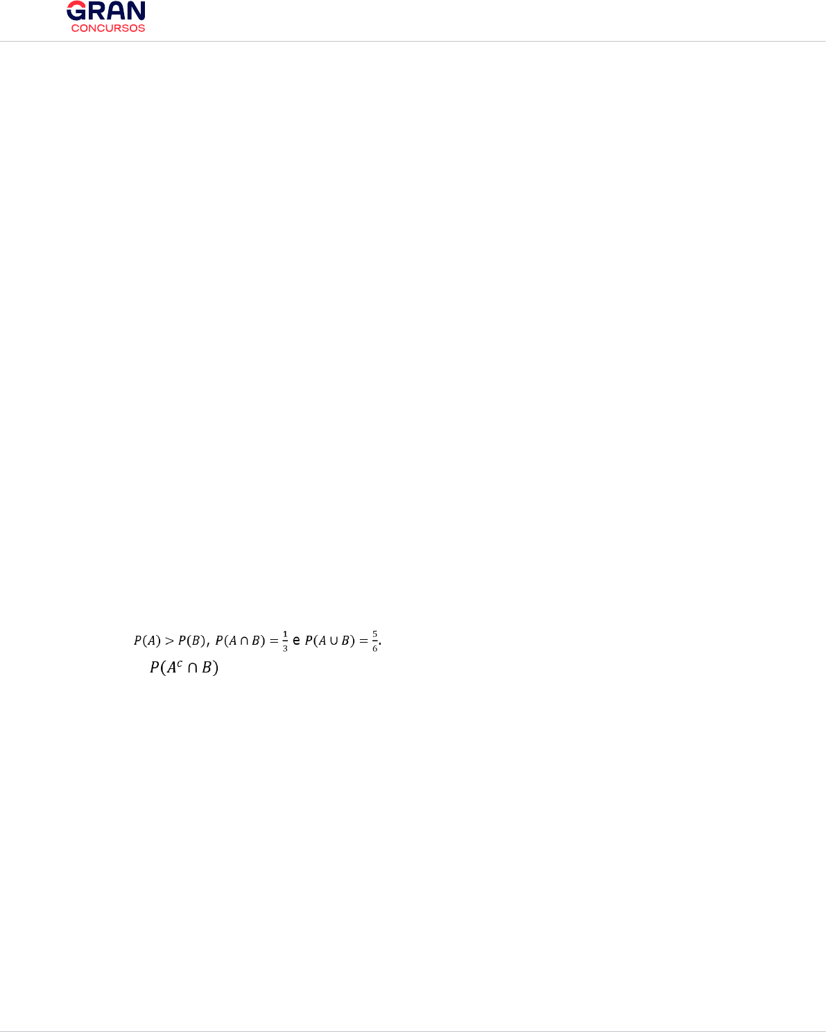 <p>1045 de 1099gran.com.br</p><p>Caderno de Questões Cesgranrio</p><p>Mais de 1.500 questões gabaritadas!</p><p>d) 6</p><p>e) 7</p><p>1520. 1520. (CESGRANRIO/2013/INSTITUTO BRASILEIRO DE GEOGRAFIA E ESTATÍSTICA – IBGE/</p><p>ANALISTA DE PLANEJAMENTO, GESTÃO E INFRAESTRUTURA/ÁREA: ANÁLISE DE SISTEMAS/</p><p>DESENVOLVIMENTO DE APLICAÇÕES/QUESTÃO 25) Num concurso, cada um dos 520 candidatos</p><p>inscritos fez uma prova de português e uma de matemática. Para ser aprovado, o candidato</p><p>deve ser aprovado em ambas as provas. O número de candidatos que foi aprovado em</p><p>matemática é igual ao triplo do número de candidatos aprovados no concurso, e o número</p><p>de candidatos aprovados em português é igual ao quádruplo do número de candidatos</p><p>aprovados no concurso. O número de candidatos não aprovados em nenhuma das duas</p><p>provas é igual a metade do número de candidatos aprovados no concurso.</p><p>Quantos candidatos foram aprovados ao todo?</p><p>a) 60</p><p>b) 80</p><p>c) 100</p><p>d) 120</p><p>e) 130</p><p>1521. 1521. (CESGRANRIO/2013/INSTITUTO BRASILEIRO DE GEOGRAFIA E ESTATÍSTICA – IBGE/</p><p>ANALISTA DE PLANEJAMENTO, GESTÃO E INFRAESTRUTURA/ÁREA: ANÁLISE DE SISTEMAS/</p><p>DESENVOLVIMENTO DE APLICAÇÕES/QUESTÃO 26) Dois eventos A e B, independentes, são</p><p>tais que</p><p>O valor de é dado por</p><p>a) 1/3</p><p>b) 1/2</p><p>c) 1/4</p><p>d) 1/6</p><p>e) 2/3</p><p>1522. 1522. (CESGRANRIO/2013/BANCO NACIONAL DE DESENVOLVIMENTO ECONÔMICO E SOCIAL –</p><p>BNDES/TÉCNICO ADMINISTRATIVO/QUESTÃO 42) João e Maria estão enfrentando dificuldades</p><p>em algumas disciplinas do 1º ano do Ensino Médio. A probabilidade de João ser reprovado</p><p>é de 20%, e a de Maria é de 40%.</p><p>Considerando-se que João e Maria são independentes, qual é a probabilidade de que um</p><p>ou outro seja reprovado?</p><p>a) 0</p><p>b) 0,2</p><p>https://www.gran.com.br</p><p>https://www.gran.com.br</p>