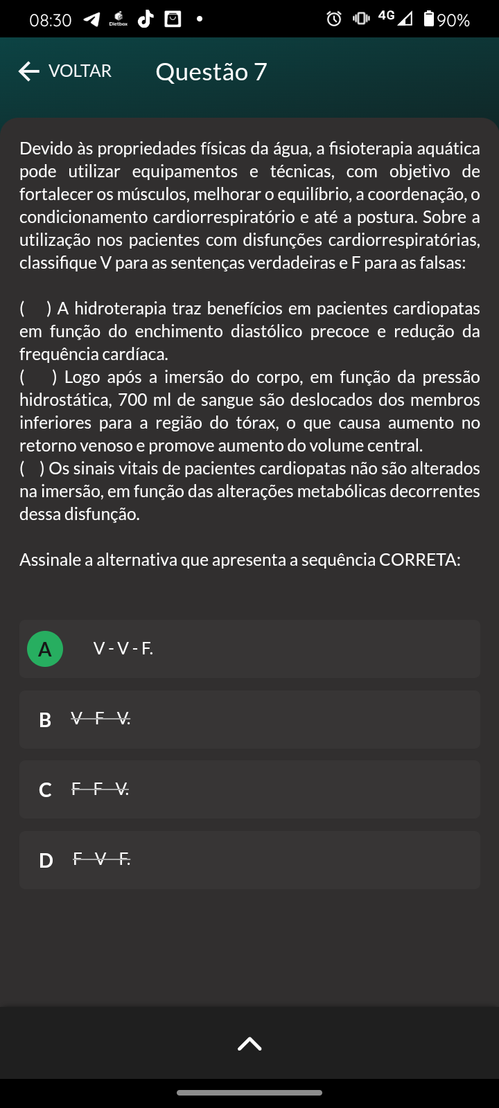 08:30 4G 90% VOLTAR Questão 7 Devido às propriedades físicas da água, a fisioterapia aquática pode utilizar equipamentos e técnicas, com objetivo de fortalecer os músculos, melhorar equilíbrio, a coordenação, condicionamento cardiorrespiratório e até a postura. Sobre a utilização nos pacientes com disfunções cardiorrespiratórias, classifique V para as sentenças verdadeiras e F para as falsas: ( ) A hidroterapia traz benefícios em pacientes cardiopatas em função do enchimento diastólico precoce e redução da frequência cardíaca. ( ) Logo após a imersão do corpo, em função da pressão hidrostática, 700 ml de sangue são deslocados dos membros inferiores para a região do tórax, que causa aumento no retorno venoso e promove aumento do volume central. ( ) Os sinais vitais de pacientes cardiopatas não são alterados na imersão, em função das alterações metabólicas decorrentes dessa disfunção. Assinale a alternativa que apresenta a sequência CORRETA: A V-V-F B V V. F F V D F V F.