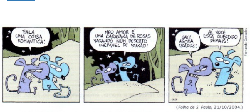 <p>Figuras de Palavras</p><p>Metáfora</p><p>A metáfora representa uma comparação de palavras com significados diferentes e cujo termo comparativo fica subentendido na frase.</p><p>Exemplo: A vida é uma nuvem que voa. (A vida é como uma nuvem que voa.)</p><p>Uso da metáfora em "meu amor é uma caravana de rosas vagando num deserto inefável"</p><p>image1.jpeg</p>