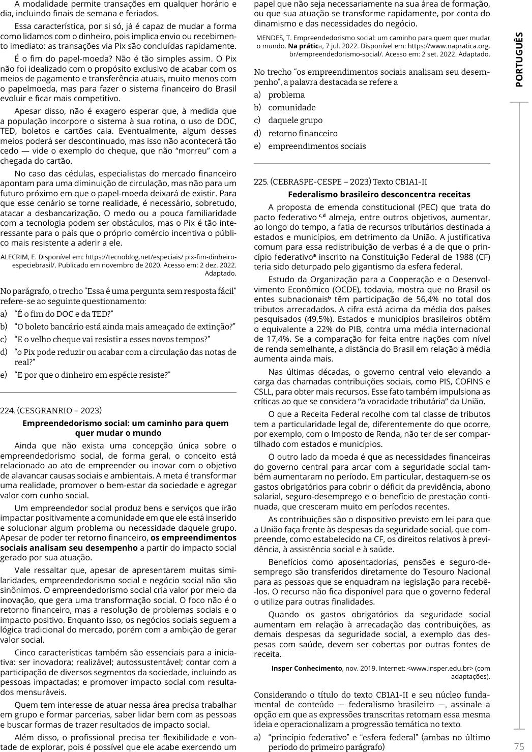 <p>PO</p><p>RT</p><p>U</p><p>G</p><p>U</p><p>ÊS</p><p>75</p><p>A modalidade permite transações em qualquer horário e</p><p>dia, incluindo finais de semana e feriados.</p><p>Essa característica, por si só, já é capaz de mudar a forma</p><p>como lidamos com o dinheiro, pois implica envio ou recebimen-</p><p>to imediato: as transações via Pix são concluídas rapidamente.</p><p>É o fim do papel-moeda? Não é tão simples assim. O Pix</p><p>não foi idealizado com o propósito exclusivo de acabar com os</p><p>meios de pagamento e transferência atuais, muito menos com</p><p>o papelmoeda, mas para fazer o sistema financeiro do Brasil</p><p>evoluir e ficar mais competitivo.</p><p>Apesar disso, não é exagero esperar que, à medida que</p><p>a população incorpore o sistema à sua rotina, o uso de DOC,</p><p>TED, boletos e cartões caia. Eventualmente, algum desses</p><p>meios poderá ser descontinuado, mas isso não acontecerá tão</p><p>cedo — vide o exemplo do cheque, que não “morreu” com a</p><p>chegada do cartão.</p><p>No caso das cédulas, especialistas do mercado financeiro</p><p>apontam para uma diminuição de circulação, mas não para um</p><p>futuro próximo em que o papel-moeda deixará de existir. Para</p><p>que esse cenário se torne realidade, é necessário, sobretudo,</p><p>atacar a desbancarização. O medo ou a pouca familiaridade</p><p>com a tecnologia podem ser obstáculos, mas o Pix é tão inte-</p><p>ressante para o país que o próprio comércio incentiva o públi-</p><p>co mais resistente a aderir a ele.</p><p>ALECRIM, E. Disponível em: https://tecnoblog.net/especiais/ pix-fim-dinheiro-</p><p>especiebrasil/. Publicado em novembro de 2020. Acesso em: 2 dez. 2022.</p><p>Adaptado.</p><p>No parágrafo, o trecho “Essa é uma pergunta sem resposta fácil”</p><p>refere-se ao seguinte questionamento:</p><p>a) “É o fim do DOC e da TED?”</p><p>b) “O boleto bancário está ainda mais ameaçado de extinção?”</p><p>c) “E o velho cheque vai resistir a esses novos tempos?”</p><p>d) “o Pix pode reduzir ou acabar com a circulação das notas de</p><p>real?”</p><p>e) “E por que o dinheiro em espécie resiste?”</p><p>224. (CESGRANRIO – 2023)</p><p>Empreendedorismo social: um caminho para quem</p><p>quer mudar o mundo</p><p>Ainda que não exista uma concepção única sobre o</p><p>empreendedorismo social, de forma geral, o conceito está</p><p>relacionado ao ato de empreender ou inovar com o objetivo</p><p>de alavancar causas sociais e ambientais. A meta é transformar</p><p>uma realidade, promover o bem-estar da sociedade e agregar</p><p>valor com cunho social.</p><p>Um empreendedor social produz bens e serviços que irão</p><p>impactar positivamente a comunidade em que ele está inserido</p><p>e solucionar algum problema ou necessidade daquele grupo.</p><p>Apesar de poder ter retorno financeiro, os empreendimentos</p><p>sociais analisam seu desempenho a partir do impacto social</p><p>gerado por sua atuação.</p><p>Vale ressaltar que, apesar de apresentarem muitas simi-</p><p>laridades, empreendedorismo social e negócio social não são</p><p>sinônimos. O empreendedorismo social cria valor por meio da</p><p>inovação, que gera uma transformação social. O foco não é o</p><p>retorno financeiro, mas a resolução de problemas sociais e o</p><p>impacto positivo. Enquanto isso, os negócios sociais seguem a</p><p>lógica tradicional do mercado, porém com a ambição de gerar</p><p>valor social.</p><p>Cinco características também são essenciais para a inicia-</p><p>tiva: ser inovadora; realizável; autossustentável; contar com a</p><p>participação de diversos segmentos da sociedade, incluindo as</p><p>pessoas impactadas; e promover impacto social com resulta-</p><p>dos mensuráveis.</p><p>Quem tem interesse de atuar nessa área precisa trabalhar</p><p>em grupo e formar parcerias, saber lidar bem com as pessoas</p><p>e buscar formas de trazer resultados de impacto social.</p><p>Além disso, o profissional precisa ter flexibilidade e von-</p><p>tade de explorar, pois é possível que ele acabe exercendo um</p><p>papel que não seja necessariamente na sua área de formação,</p><p>ou que sua atuação se transforme rapidamente, por conta do</p><p>dinamismo e das necessidades do negócio.</p><p>MENDES, T. Empreendedorismo social: um caminho para quem quer mudar</p><p>o mundo. Na prática, 7 jul. 2022. Disponível em: https://www.napratica.org.</p><p>br/empreendedorismo-social/. Acesso em: 2 set. 2022. Adaptado.</p><p>No trecho “os empreendimentos sociais analisam seu desem-</p><p>penho”, a palavra destacada se refere a</p><p>a) problema</p><p>b) comunidade</p><p>c) daquele grupo</p><p>d) retorno financeiro</p><p>e) empreendimentos sociais</p><p>225. (CEBRASPE-CESPE – 2023) Texto CB1A1-II</p><p>Federalismo brasileiro desconcentra receitas</p><p>A proposta de emenda constitucional (PEC) que trata do</p><p>pacto federativo c,d almeja, entre outros objetivos, aumentar,</p><p>ao longo do tempo, a fatia de recursos tributários destinada a</p><p>estados e municípios, em detrimento da União. A justificativa</p><p>comum para essa redistribuição de verbas é a de que o prin-</p><p>cípio federativoa inscrito na Constituição Federal de 1988 (CF)</p><p>teria sido deturpado pelo gigantismo da esfera federal.</p><p>Estudo da Organização para a Cooperação e o Desenvol-</p><p>vimento Econômico (OCDE), todavia, mostra que no Brasil os</p><p>entes subnacionaisb têm participação de 56,4% no total dos</p><p>tributos arrecadados. A cifra está acima da média dos países</p><p>pesquisados (49,5%). Estados e municípios brasileiros obtêm</p><p>o equivalente a 22% do PIB, contra uma média internacional</p><p>de 17,4%. Se a comparação for feita entre nações com nível</p><p>de renda semelhante, a distância do Brasil em relação à média</p><p>aumenta ainda mais.</p><p>Nas últimas décadas, o governo central veio elevan