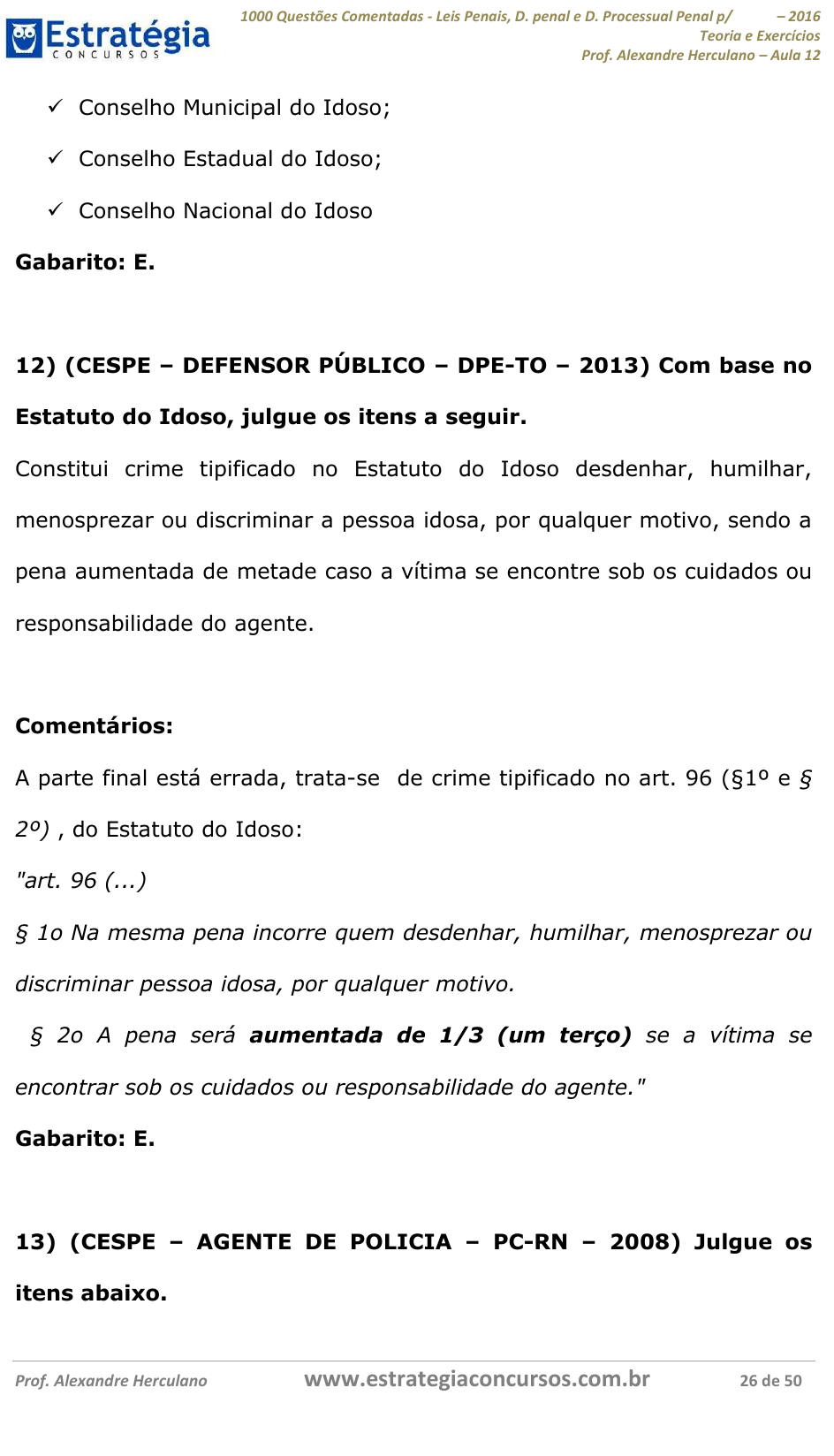 <p>1000 Questões Comentadas - Leis Penais, D. penal e D. Processual Penal p/ ʹ 2016</p><p>Teoria e Exercícios</p><p>Prof. Alexandre Herculano ʹ Aula 12</p><p>Prof. Alexandre Herculano www.estrategiaconcursos.com.br 26 de 50</p><p> Conselho Municipal do Idoso;</p><p> Conselho Estadual do Idoso;</p><p> Conselho Nacional do Idoso</p><p>Gabarito: E.</p><p>12) (CESPE – DEFENSOR PÚBLICO – DPE-TO – 2013) Com base no</p><p>Estatuto do Idoso, julgue os itens a seguir.</p><p>Constitui crime tipificado no Estatuto do Idoso desdenhar, humilhar,</p><p>menosprezar ou discriminar a pessoa idosa, por qualquer motivo, sendo a</p><p>pena aumentada de metade caso a vítima se encontre sob os cuidados ou</p><p>responsabilidade do agente.</p><p>Comentários:</p><p>A parte final está errada, trata-se de crime tipificado no art. 96 (§1º e §</p><p>2º) , do Estatuto do Idoso:</p><p>"art. 96 (...)</p><p>§ 1o Na mesma pena incorre quem desdenhar, humilhar, menosprezar ou</p><p>discriminar pessoa idosa, por qualquer motivo.</p><p>§ 2o A pena será aumentada de 1/3 (um terço) se a vítima se</p><p>encontrar sob os cuidados ou responsabilidade do agente."</p><p>Gabarito: E.</p><p>13) (CESPE – AGENTE DE POLICIA – PC-RN – 2008) Julgue os</p><p>itens abaixo.</p>