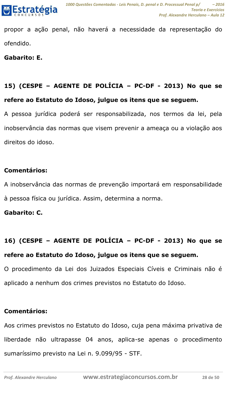 <p>1000 Questões Comentadas - Leis Penais, D. penal e D. Processual Penal p/ ʹ 2016</p><p>Teoria e Exercícios</p><p>Prof. Alexandre Herculano ʹ Aula 12</p><p>Prof. Alexandre Herculano www.estrategiaconcursos.com.br 28 de 50</p><p>propor a ação penal, não haverá a necessidade da representação do</p><p>ofendido.</p><p>Gabarito: E.</p><p>15) (CESPE – AGENTE DE POLÍCIA – PC-DF - 2013) No que se</p><p>refere ao Estatuto do Idoso, julgue os itens que se seguem.</p><p>A pessoa jurídica poderá ser responsabilizada, nos termos da lei, pela</p><p>inobservância das normas que visem prevenir a ameaça ou a violação aos</p><p>direitos do idoso.</p><p>Comentários:</p><p>A inobservância das normas de prevenção importará em responsabilidade</p><p>à pessoa física ou jurídica. Assim, determina a norma.</p><p>Gabarito: C.</p><p>16) (CESPE – AGENTE DE POLÍCIA – PC-DF - 2013) No que se</p><p>refere ao Estatuto do Idoso, julgue os itens que se seguem.</p><p>O procedimento da Lei dos Juizados Especiais Cíveis e Criminais não é</p><p>aplicado a nenhum dos crimes previstos no Estatuto do Idoso.</p><p>Comentários:</p><p>Aos crimes previstos no Estatuto do Idoso, cuja pena máxima privativa de</p><p>liberdade não ultrapasse 04 anos, aplica-se apenas o procedimento</p><p>sumaríssimo previsto na Lei n. 9.099/95 - STF.</p>