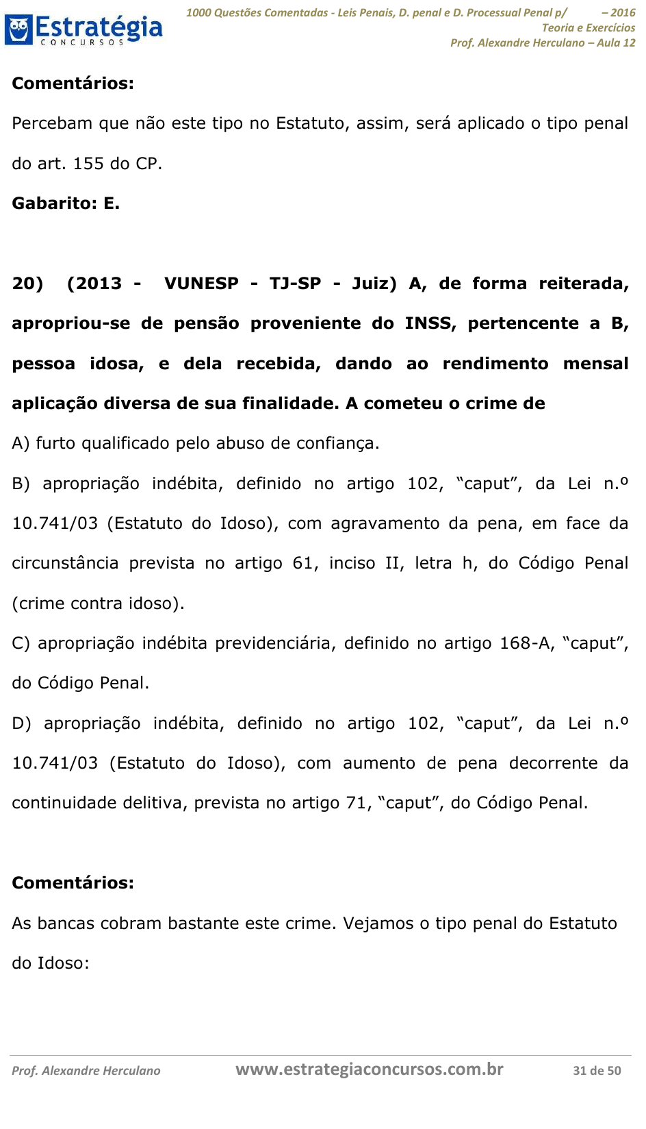 <p>1000 Questões Comentadas - Leis Penais, D. penal e D. Processual Penal p/ ʹ 2016</p><p>Teoria e Exercícios</p><p>Prof. Alexandre Herculano ʹ Aula 12</p><p>Prof. Alexandre Herculano www.estrategiaconcursos.com.br 31 de 50</p><p>Comentários:</p><p>Percebam que não este tipo no Estatuto, assim, será aplicado o tipo penal</p><p>do art. 155 do CP.</p><p>Gabarito: E.</p><p>20) (2013 - VUNESP - TJ-SP - Juiz) A, de forma reiterada,</p><p>apropriou-se de pensão proveniente do INSS, pertencente a B,</p><p>pessoa idosa, e dela recebida, dando ao rendimento mensal</p><p>aplicação diversa de sua finalidade. A cometeu o crime de</p><p>A) furto qualificado pelo abuso de confiança.</p><p>B) apropriação indébita, definido no artigo 102, “caput”, da Lei n.º</p><p>10.741/03 (Estatuto do Idoso), com agravamento da pena, em face da</p><p>circunstância prevista no artigo 61, inciso II, letra h, do Código Penal</p><p>(crime contra idoso).</p><p>C) apropriação indébita previdenciária, definido no artigo 168-A, “caput”,</p><p>do Código Penal.</p><p>D) apropriação indébita, definido no artigo 102, “caput”, da Lei n.º</p><p>10.741/03 (Estatuto do Idoso), com aumento de pena decorrente da</p><p>continuidade delitiva, prevista no artigo 71, “caput”, do Código Penal.</p><p>Comentários:</p><p>As bancas cobram bastante este crime. Vejamos o tipo penal do Estatuto</p><p>do Idoso:</p>