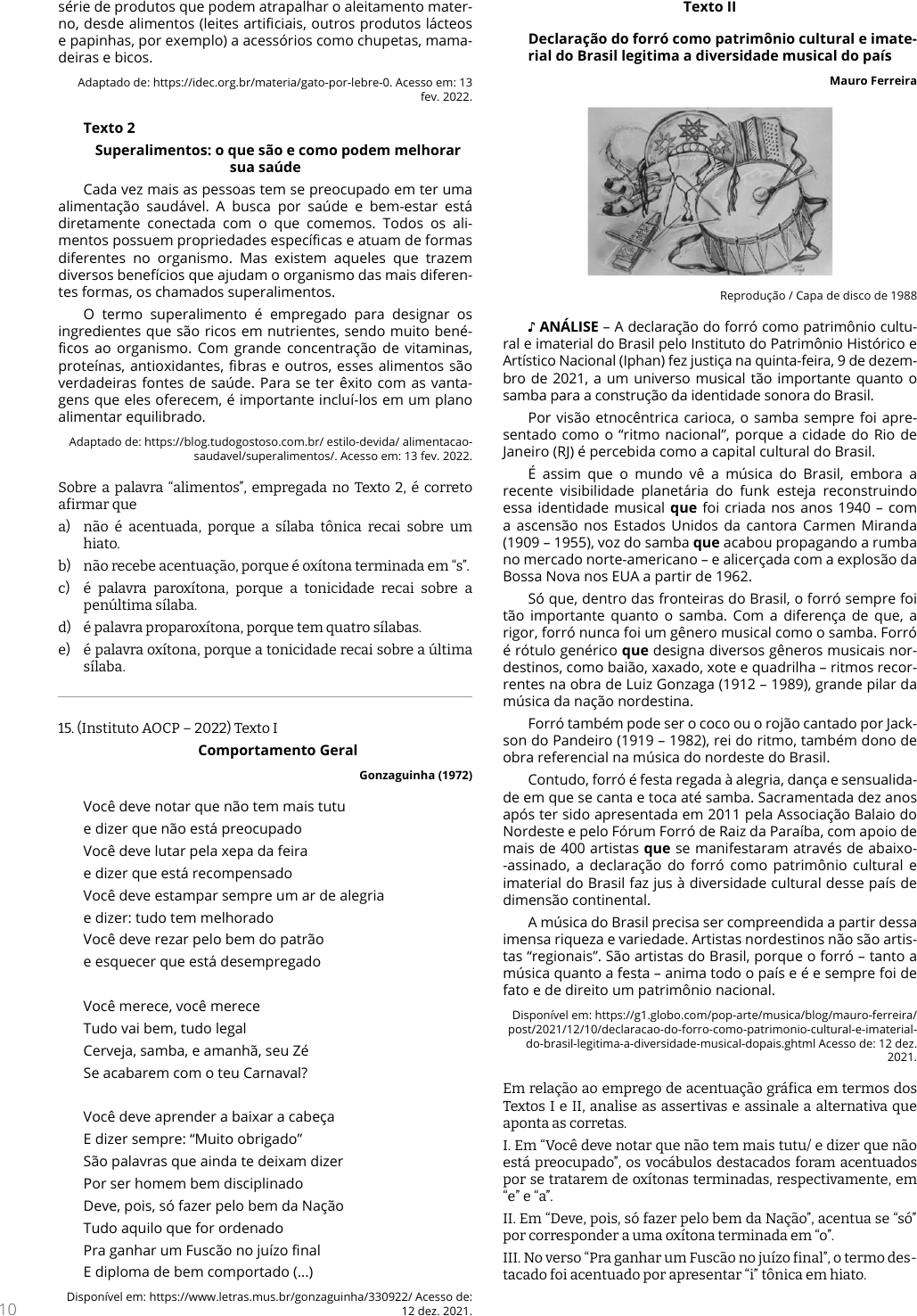 <p>10</p><p>série de produtos que podem atrapalhar o aleitamento mater-</p><p>no, desde alimentos (leites artificiais, outros produtos lácteos</p><p>e papinhas, por exemplo) a acessórios como chupetas, mama-</p><p>deiras e bicos.</p><p>Adaptado de: https://idec.org.br/materia/gato-por-lebre-0. Acesso em: 13</p><p>fev. 2022.</p><p>Texto 2</p><p>Superalimentos: o que são e como podem melhorar</p><p>sua saúde</p><p>Cada vez mais as pessoas tem se preocupado em ter uma</p><p>alimentação saudável. A busca por saúde e bem-estar está</p><p>diretamente conectada com o que comemos. Todos os ali-</p><p>mentos possuem propriedades específicas e atuam de formas</p><p>diferentes no organismo. Mas existem aqueles que trazem</p><p>diversos benefícios que ajudam o organismo das mais diferen-</p><p>tes formas, os chamados superalimentos.</p><p>O termo superalimento é empregado para designar os</p><p>ingredientes que são ricos em nutrientes, sendo muito bené-</p><p>ficos ao organismo. Com grande concentração de vitaminas,</p><p>proteínas, antioxidantes, fibras e outros, esses alimentos são</p><p>verdadeiras fontes de saúde. Para se ter êxito com as vanta-</p><p>gens que eles oferecem, é importante incluí-los em um plano</p><p>alimentar equilibrado.</p><p>Adaptado de: https://blog.tudogostoso.com.br/ estilo-devida/ alimentacao-</p><p>saudavel/superalimentos/. Acesso em: 13 fev. 2022.</p><p>Sobre a palavra “alimentos”, empregada no Texto 2, é correto</p><p>afirmar que</p><p>a) não é acentuada, porque a sílaba tônica recai sobre um</p><p>hiato.</p><p>b) não recebe acentuação, porque é oxítona terminada em “s”.</p><p>c) é palavra paroxítona, porque a tonicidade recai sobre a</p><p>penúltima sílaba.</p><p>d) é palavra proparoxítona, porque tem quatro sílabas.</p><p>e) é palavra oxítona, porque a tonicidade recai sobre a última</p><p>sílaba.</p><p>15. (Instituto AOCP – 2022) Texto I</p><p>Comportamento Geral</p><p>Gonzaguinha (1972)</p><p>Você deve notar que não tem mais tutu</p><p>e dizer que não está preocupado</p><p>Você deve lutar pela xepa da feira</p><p>e dizer que está recompensado</p><p>Você deve estampar sempre um ar de alegria</p><p>e dizer: tudo tem melhorado</p><p>Você deve rezar pelo bem do patrão</p><p>e esquecer que está desempregado</p><p>Você merece, você merece</p><p>Tudo vai bem, tudo legal</p><p>Cerveja, samba, e amanhã, seu Zé</p><p>Se acabarem com o teu Carnaval?</p><p>Você deve aprender a baixar a cabeça</p><p>E dizer sempre: “Muito obrigado”</p><p>São palavras que ainda te deixam dizer</p><p>Por ser homem bem disciplinado</p><p>Deve, pois, só fazer pelo bem da Nação</p><p>Tudo aquilo que for ordenado</p><p>Pra ganhar um Fuscão no juízo final</p><p>E diploma de bem comportado (...)</p><p>Disponível em: https://www.letras.mus.br/gonzaguinha/330922/ Acesso de:</p><p>12 dez. 2021.</p><p>Texto II</p><p>Declaração do forró como patrimônio cultural e imate-</p><p>rial do Brasil legitima a diversidade musical do país</p><p>Mauro Ferreira</p><p>Reprodução / Capa de disco de 1988</p><p>♪ ANÁLISE – A declaração do forró como patrimônio cultu-</p><p>ral e imaterial do Brasil pelo Instituto do Patrimônio Histórico e</p><p>Artístico Nacional (Iphan) fez justiça na quinta-feira, 9 de dezem-</p><p>bro de 2021, a um universo musical tão importante quanto o</p><p>samba para a construção da identidade sonora do Brasil.</p><p>Por visão etnocêntrica carioca, o samba sempre foi apre-</p><p>sentado como o “ritmo nacional”, porque a cidade do Rio de</p><p>Janeiro (RJ) é percebida como a capital cultural do Brasil.</p><p>É assim que o mundo vê a música do Brasil, embora a</p><p>recente visibilidade planetária do funk esteja reconstruindo</p><p>essa identidade musical que foi criada nos anos 1940 – com</p><p>a ascensão nos Estados Unidos da cantora Carmen Miranda</p><p>(1909 – 1955), voz do samba que acabou propagando a rumba</p><p>no mercado norte-americano – e alicerçada com a explosão da</p><p>Bossa Nova nos EUA a partir de 1962.</p><p>Só que, dentro das fronteiras do Brasil, o forró sempre foi</p><p>tão importante quanto o samba. Com a diferença de que, a</p><p>rigor, forró nunca foi um gênero musical como o samba. Forró</p><p>é rótulo genérico que designa diversos gêneros musicais nor-</p><p>destinos, como baião, xaxado, xote e quadrilha – ritmos recor-</p><p>rentes na obra de Luiz Gonzaga (1912 – 1989), grande pilar da</p><p>música da nação nordestina.</p><p>Forró também pode ser o coco ou o rojão cantado por Jack-</p><p>son do Pandeiro (1919 – 1982), rei do ritmo, também dono de</p><p>obra referencial na música do nordeste do Brasil.</p><p>Contudo, forró é festa regada à alegria, dança e sensualida-</p><p>de em que se canta e toca até samba. Sacramentada dez anos</p><p>após ter sido apresentada em 2011 pela Associação Balaio do</p><p>Nordeste e pelo Fórum Forró de Raiz da Paraíba, com apoio de</p><p>mais de 400 artistas que se manifestaram através de abaixo-</p><p>-assinado, a declaração do forró como patrimônio cultural e</p><p>imaterial do Brasil faz jus à diversidade cultural desse país de</p><p>dimensão continental.</p><p>A música do Brasil precisa ser compreendida a partir dessa</p><p>imensa riqueza e variedade. Artistas nordestinos não são artis-</p><p>tas “regionais”. São artistas do Brasil, porque o forró – tanto a</p><p>música quanto a festa – anima todo o país e é e sempre foi de</p><p>fato e de direito um patrimônio nacional.</p><p>Disponível em: https://g1.globo.com/pop-arte/musica/blog/mauro-ferreira/</p><p>post/2021/12/10/declaracao-do-forro-como-patrimonio-cultural-e-imaterial-</p><p>do-brasil-legitima-a-diversidade-musical-dopais.ghtml Acesso de: 12 dez.</p><p>2021.</p><p>Em relação ao emprego de acentuação gráfica em termos dos</p><p>Textos I e II, analise as assertivas e assinale a alternativa que</p