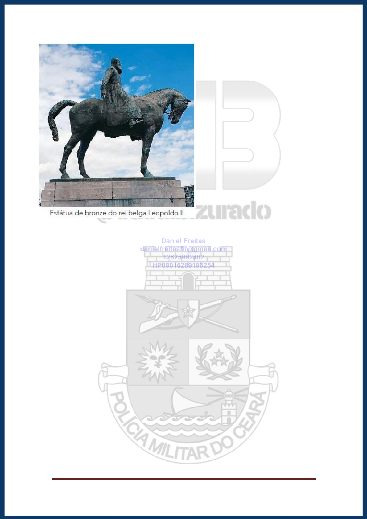 <p>CASAL BIZURADO – 1.000 QUESTÕES GABARITADAS – PM-CE Página 120</p><p>A situação narrada na reportagem apresenta um exemplo de conflito associado à revisão de celebrações em torno</p><p>de personagens, em especial, autoridades governamentais.</p><p>Esse conflito se estabelece em torno de duas noções principais, que são:</p><p>A) equiparação jurídica e luta de classes</p><p>B) reparação histórica e batalha de memórias</p><p>C) superação da hierarquia e disputa de raças</p><p>D) restauração da verdade e guerra de ideologias</p><p>(FGV) Questão 7 – Atualidades</p><p>A epidemia de sarampo é um fenômeno global. Dados da Organização Pan-Americana da Saúde (OPAS) e da</p><p>Organização Mundial da Saúde (OMS) revelam que, em 2017, a doença foi responsável por 110 mil mortes.</p><p>Segundo essas entidades, os casos notificados no mundo triplicaram nos sete primeiros meses na comparação com</p><p>igual período de 2018. O Brasil, segundo o Ministério da Saúde, vinha de um histórico de não registrar casos</p><p>adquiridos dentro do país desde o ano 2000. Em 2018, contudo, a doença reapareceu a partir de casos</p><p>importados, disseminando-se, sobretudo, no estado:</p><p>A) de São Paulo.</p><p>B) do Amazonas.</p><p>C) de Roraima.</p><p>D) de Minas Gerais.</p><p>E) da Bahia.</p><p>Daniel Freitas</p><p>danielfreitasfff@gmail.com</p><p>12825992402</p><p>HP09016289193254</p>