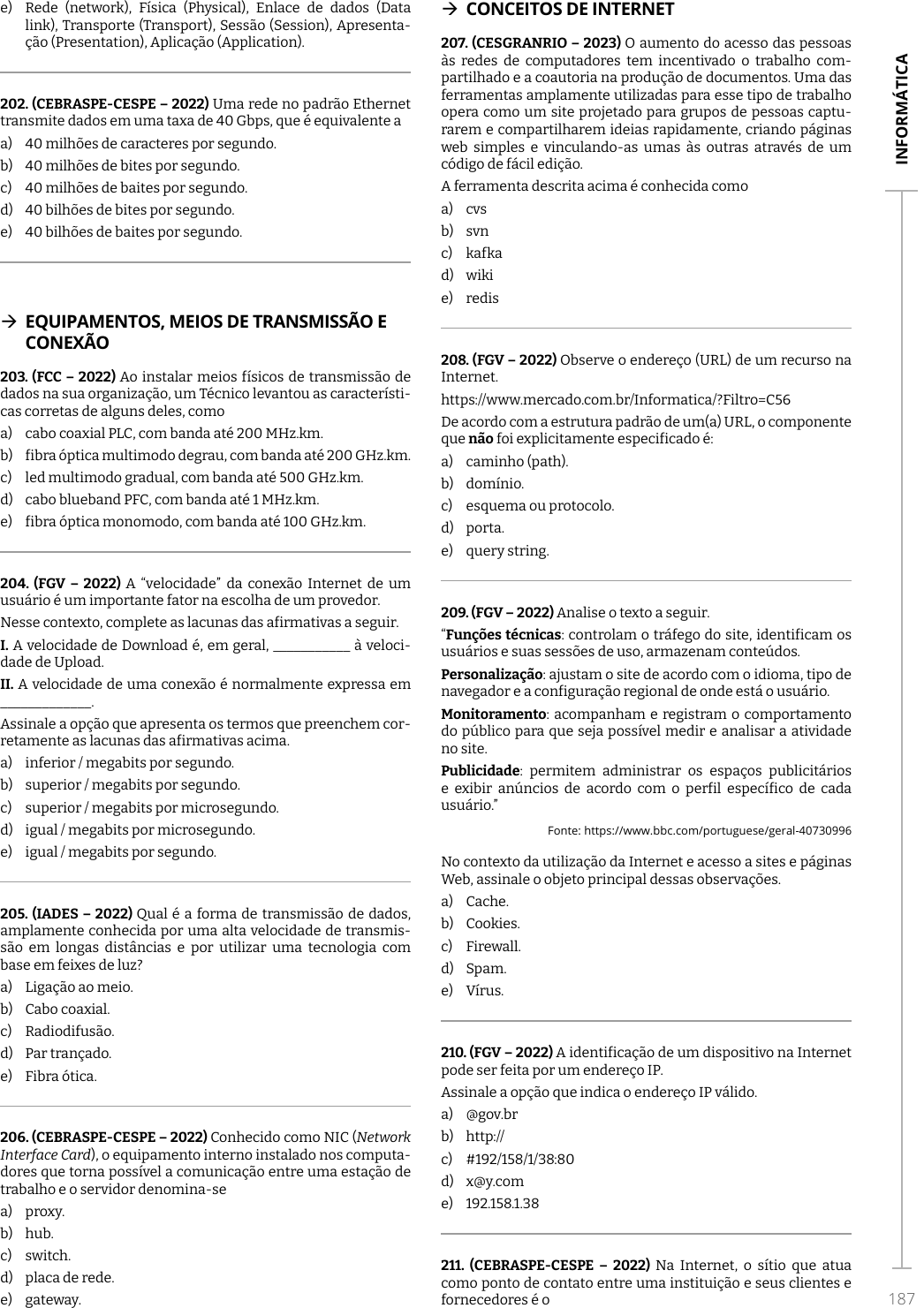 <p>IN</p><p>FO</p><p>RM</p><p>Á</p><p>TI</p><p>CA</p><p>187</p><p>e) Rede (network), Física (Physical), Enlace de dados (Data</p><p>link), Transporte (Transport), Sessão (Session), Apresenta-</p><p>ção (Presentation), Aplicação (Application).</p><p>202. (CEBRASPE-CESPE – 2022) Uma rede no padrão Ethernet</p><p>transmite dados em uma taxa de 40 Gbps, que é equivalente a</p><p>a) 40 milhões de caracteres por segundo.</p><p>b) 40 milhões de bites por segundo.</p><p>c) 40 milhões de baites por segundo.</p><p>d) 40 bilhões de bites por segundo.</p><p>e) 40 bilhões de baites por segundo.</p><p>Æ EQUIPAMENTOS, MEIOS DE TRANSMISSÃO E</p><p>CONEXÃO</p><p>203. (FCC – 2022) Ao instalar meios físicos de transmissão de</p><p>dados na sua organização, um Técnico levantou as característi-</p><p>cas corretas de alguns deles, como</p><p>a) cabo coaxial PLC, com banda até 200 MHz.km.</p><p>b) fibra óptica multimodo degrau, com banda até 200 GHz.km.</p><p>c) led multimodo gradual, com banda até 500 GHz.km.</p><p>d) cabo blueband PFC, com banda até 1 MHz.km.</p><p>e) fibra óptica monomodo, com banda até 100 GHz.km.</p><p>204. (FGV – 2022) A “velocidade” da conexão Internet de um</p><p>usuário é um importante fator na escolha de um provedor.</p><p>Nesse contexto, complete as lacunas das afirmativas a seguir.</p><p>I. A velocidade de Download é, em geral, ___________ à veloci-</p><p>dade de Upload.</p><p>II. A velocidade de uma conexão é normalmente expressa em</p><p>_____________.</p><p>Assinale a opção que apresenta os termos que preenchem cor-</p><p>retamente as lacunas das afirmativas acima.</p><p>a) inferior / megabits por segundo.</p><p>b) superior / megabits por segundo.</p><p>c) superior / megabits por microsegundo.</p><p>d) igual / megabits por microsegundo.</p><p>e) igual / megabits por segundo.</p><p>205. (IADES – 2022) Qual é a forma de transmissão de dados,</p><p>amplamente conhecida por uma alta velocidade de transmis-</p><p>são em longas distâncias e por utilizar uma tecnologia com</p><p>base em feixes de luz?</p><p>a) Ligação ao meio.</p><p>b) Cabo coaxial.</p><p>c) Radiodifusão.</p><p>d) Par trançado.</p><p>e) Fibra ótica.</p><p>206. (CEBRASPE-CESPE – 2022) Conhecido como NIC (Network</p><p>Interface Card), o equipamento interno instalado nos computa-</p><p>dores que torna possível a comunicação entre uma estação de</p><p>trabalho e o servidor denomina-se</p><p>a) proxy.</p><p>b) hub.</p><p>c) switch.</p><p>d) placa de rede.</p><p>e) gateway.</p><p>Æ CONCEITOS DE INTERNET</p><p>207. (CESGRANRIO – 2023) O aumento do acesso das pessoas</p><p>às redes de computadores tem incentivado o trabalho com-</p><p>partilhado e a coautoria na produção de documentos. Uma das</p><p>ferramentas amplamente utilizadas para esse tipo de trabalho</p><p>opera como um site projetado para grupos de pessoas captu-</p><p>rarem e compartilharem ideias rapidamente, criando páginas</p><p>web simples e vinculando-as umas às outras através de um</p><p>código de fácil edição.</p><p>A ferramenta descrita acima é conhecida como</p><p>a) cvs</p><p>b) svn</p><p>c) kafka</p><p>d) wiki</p><p>e) redis</p><p>208. (FGV – 2022) Observe o endereço (URL) de um recurso na</p><p>Internet.</p><p>https://www.mercado.com.br/Informatica/?Filtro=C56</p><p>De acordo com a estrutura padrão de um(a) URL, o componente</p><p>que não foi explicitamente especificado é:</p><p>a) caminho (path).</p><p>b) domínio.</p><p>c) esquema ou protocolo.</p><p>d) porta.</p><p>e) query string.</p><p>209. (FGV – 2022) Analise o texto a seguir.</p><p>“Funções técnicas: controlam o tráfego do site, identificam os</p><p>usuários e suas sessões de uso, armazenam conteúdos.</p><p>Personalização: ajustam o site de acordo com o idioma, tipo de</p><p>navegador e a configuração regional de onde está o usuário.</p><p>Monitoramento: acompanham e registram o comportamento</p><p>do público para que seja possível medir e analisar a atividade</p><p>no site.</p><p>Publicidade: permitem administrar os espaços publicitários</p><p>e exibir anúncios de acordo com o perfil específico de cada</p><p>usuário.”</p><p>Fonte: https://www.bbc.com/portuguese/geral-40730996</p><p>No contexto da utilização da Internet e acesso a sites e páginas</p><p>Web, assinale o objeto principal dessas observações.</p><p>a) Cache.</p><p>b) Cookies.</p><p>c) Firewall.</p><p>d) Spam.</p><p>e) Vírus.</p><p>210. (FGV – 2022) A identificação de um dispositivo na Internet</p><p>pode ser feita por um endereço IP.</p><p>Assinale a opção que indica o endereço IP válido.</p><p>a) @gov.br</p><p>b) http://</p><p>c) #192/158/1/38:80</p><p>d) x@y.com</p><p>e) 192.158.1.38</p><p>211. (CEBRASPE-CESPE – 2022) Na Internet, o sítio que atua</p><p>como ponto de contato entre uma instituição e seus clientes e</p><p>fornecedores é o</p><p>O conteúdo deste livro eletrônico é licenciado para Natalia Feijó Ribeiro - 096.457.457-80, vedada, por quaisquer meios e a qualquer título, a</p><p>sua reprodução, cópia, divulgação ou distribuição, sujeitando-se aos infratores à responsabilização civil e criminal.</p>